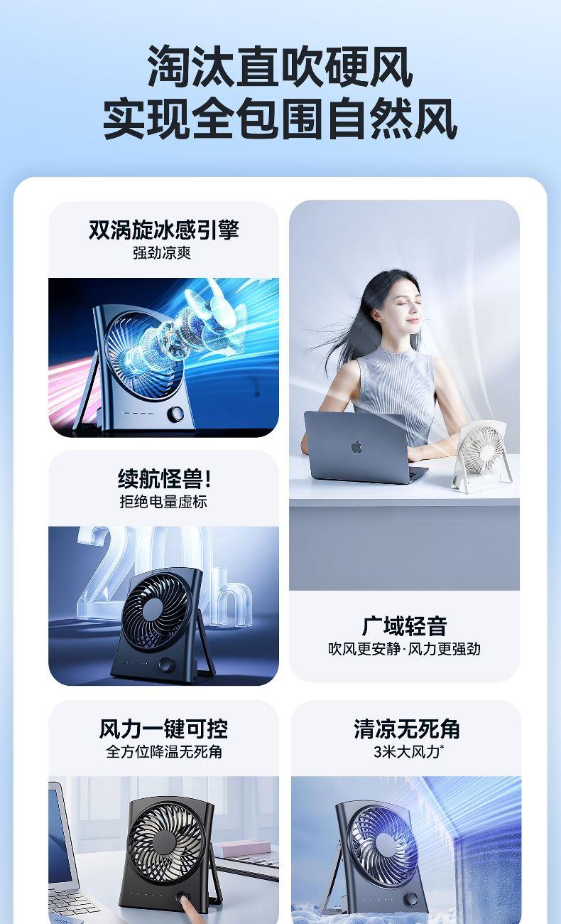 *挂立两用,180度自由旋转 *5档大风力调节,小巧便携 *轻薄便携,面罩可拆洗 *支持小批量定制LOGO