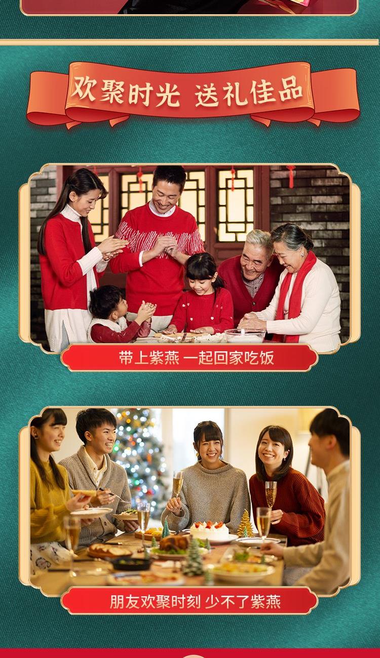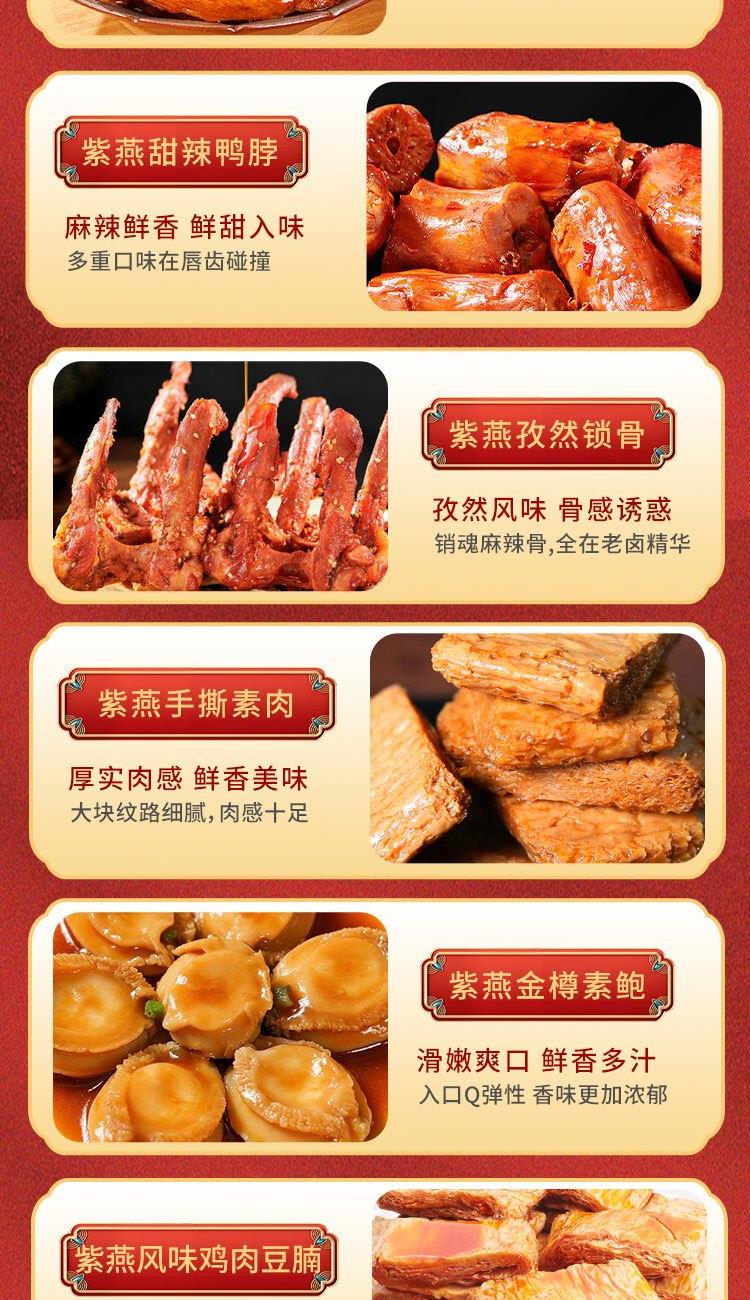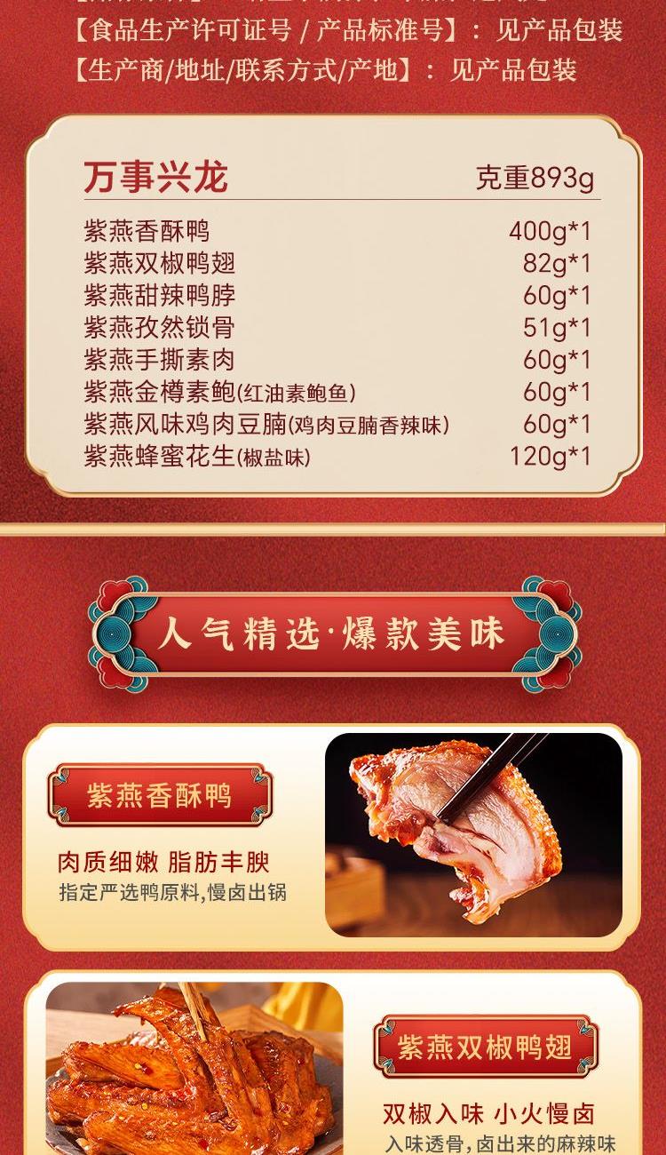 内容物配置: 紫燕香酥鸭400g*1 紫燕双椒鸭翅82g*1 紫燕甜辣鸭脖60g*1 紫燕孜然锁骨51g*1 紫燕手撕素肉60g*1 紫燕金樽素鲍(红油素鲍鱼)60g*1 紫燕风味鸡肉豆腩(鸡肉豆腩香辣味)60g*1 紫燕蜂蜜花生(椒盐味)120g*1 万事兴龙礼盒+组装+外盒