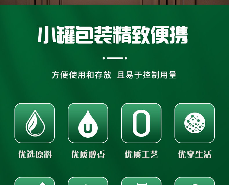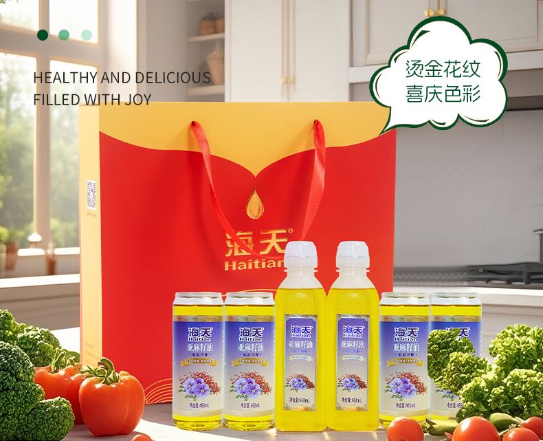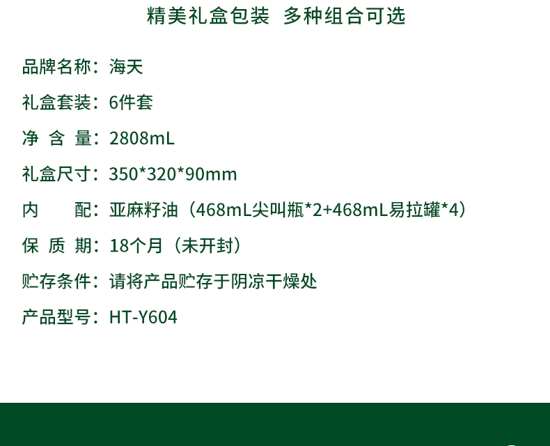 净含量:2808mL 内配:亚麻籽油(468mL尖叫瓶*2+468mL易拉罐*4) 礼盒尺寸:350*320*90mm 推荐理由:员工福利、积分兑换、项目招标 物理低温冷榨 冷烹两用 油体清澈 味道清香 头道初榨 0胆固 醇 亚麻酸大于52%