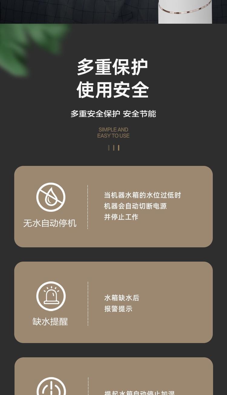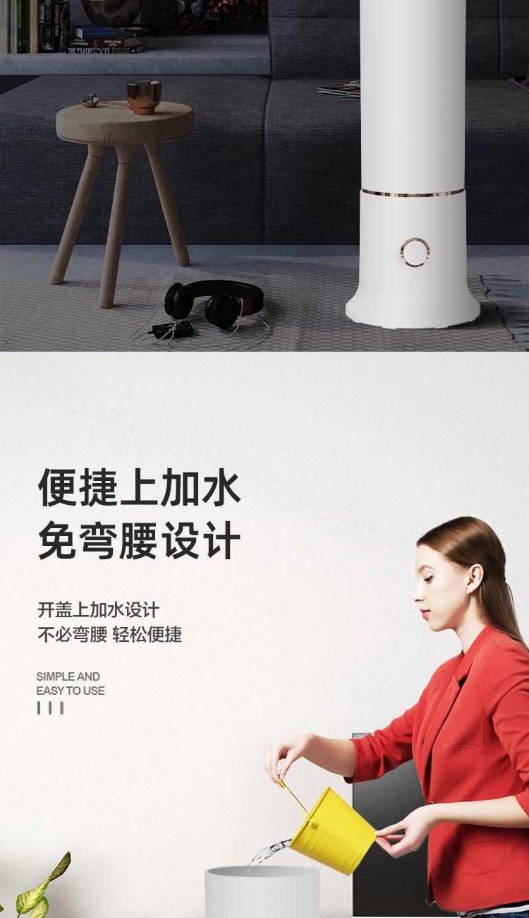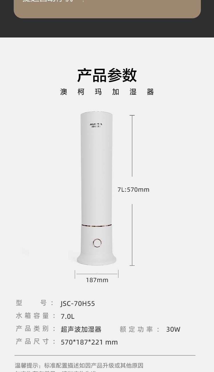 额定功率 30W 水箱容量 7.0L 产品尺寸 570*187*221 mm 外箱尺寸 610*225*260mm 净重 1.1kg 毛重 1.9kg 360度出雾调节,加湿角度自由选择 束状高雾,不怕湿地面 便捷上加水,免弯腰设计 大容量水箱,告别频繁加水