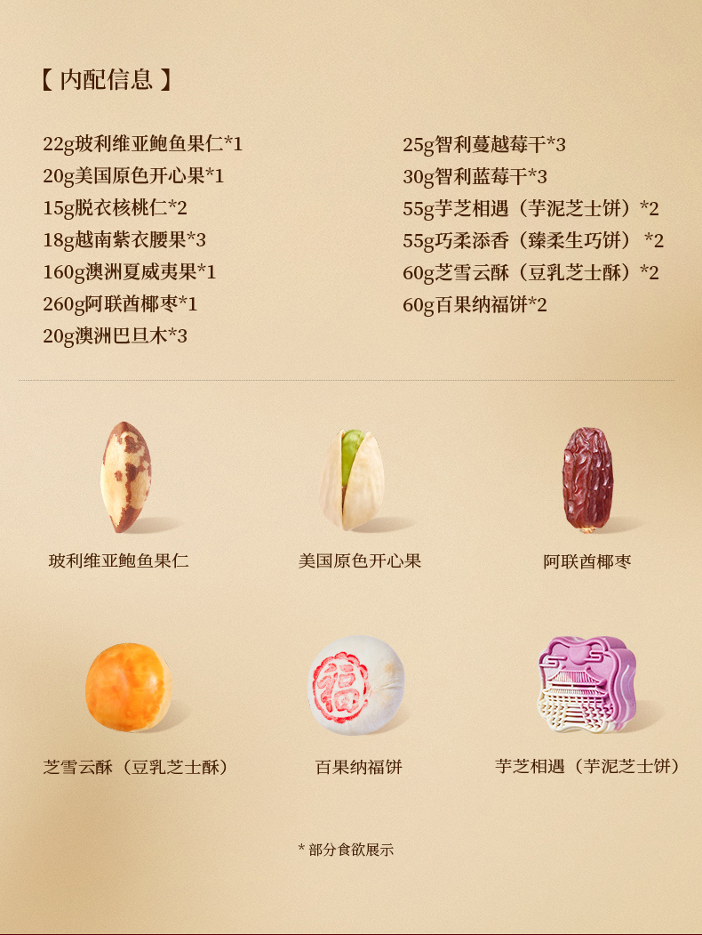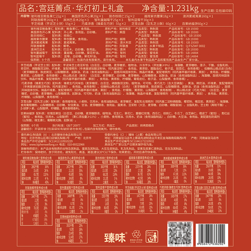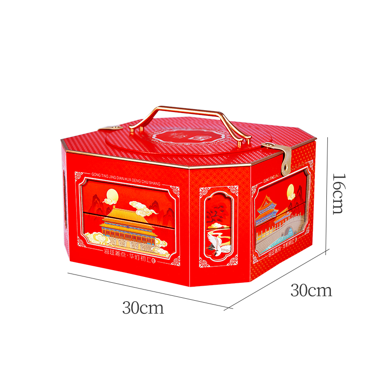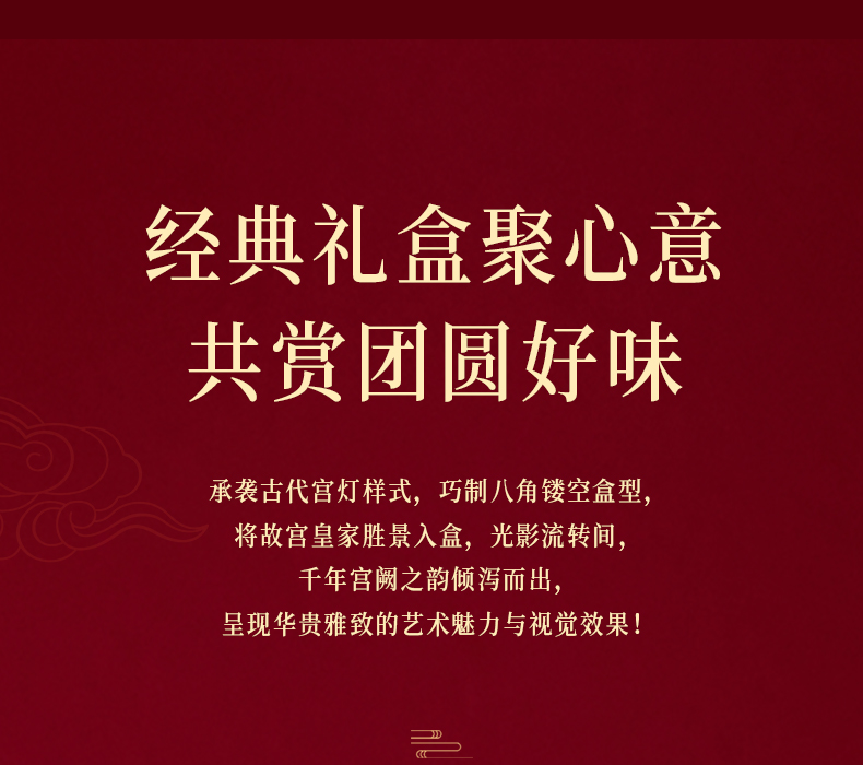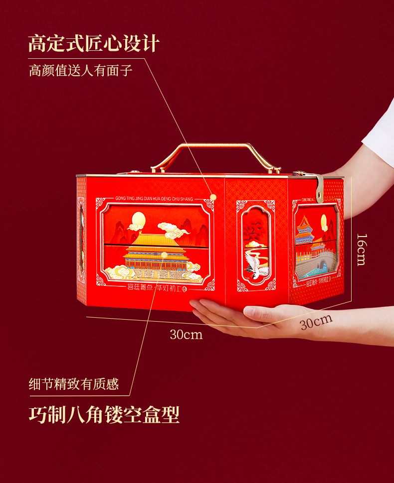 承袭古代宫灯样式,巧制八角镂空盒型,将故宫皇家胜景入盒,光影流转间,千年宫阙之韵倾泻而出,呈现华贵雅致的艺术魅力与视觉效果;净含量:1231g,内含6种坚果,3种果干,4款糕点,赏故宫风华,与美味共赴团圆!