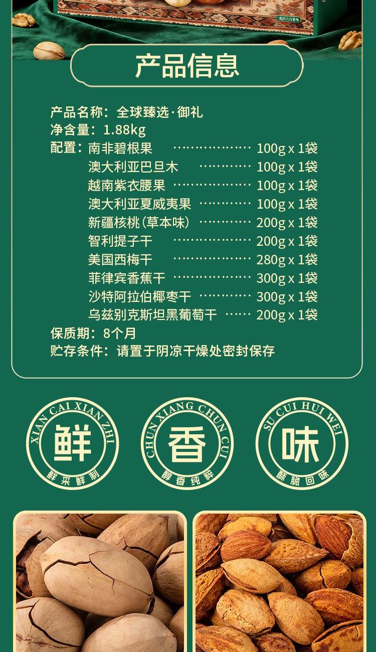 南非碧根果100g 澳大利亚巴旦木100g 越南紫衣腰果100g 澳大利亚夏威夷果100g 中国新疆核桃(草本味)200g 智利提子干200g 美国西梅干280g 菲律宾香蕉干300g 沙特阿拉伯椰枣300g 乌兹别克黑加仑干200g