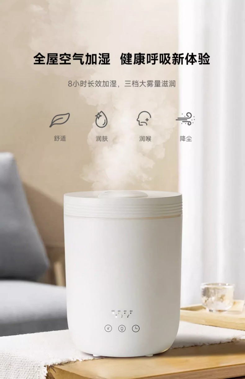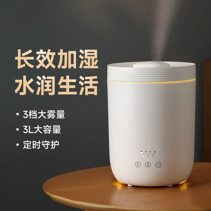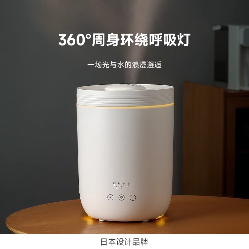 重量:1.4kg 线长:1.5 水箱容量:3L 使用温度:10-40℃ 额定功率:28W 功能按钮:雾量、指示灯、定时 8小时长效加湿,三档大雾量滋润 360°周身环绕呼吸灯效 独特消音壁设计,轻音润泽不扰眠 三档湿量自由调节,满足不同加湿需求 防干烧设计,使用更安全