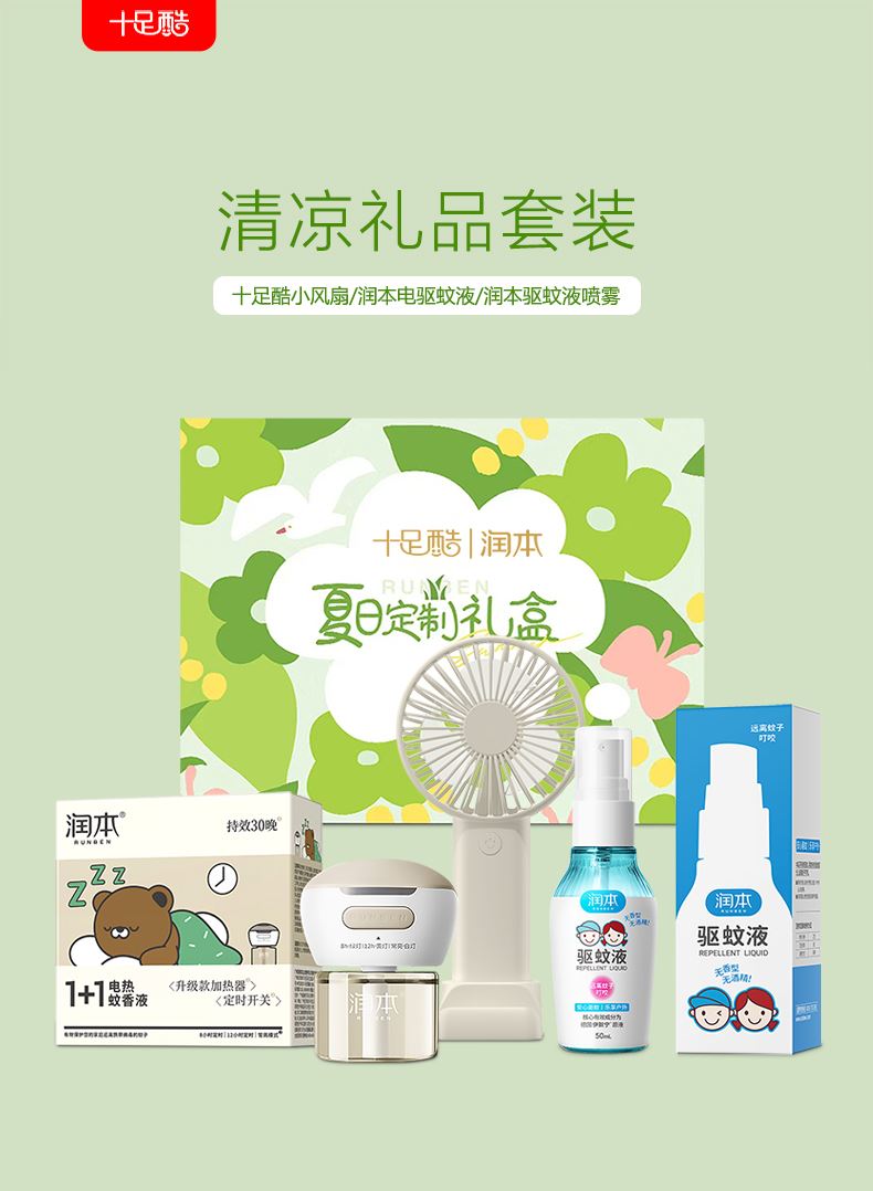 手持小风扇:迷你手持风扇、三档调节,手机支架功能,内置1200mAh电池、草绿色,方便定制 润本电热蚊香液: 法国道达尔溶剂,0.6%氯氟醚菊酯,45ml,1+1定时款 润本驱蚊液: 50ml,7%驱蚊酯驱蚊液,0香精0精油配方。温和不刺激, 德国原液。5小时防蚊.