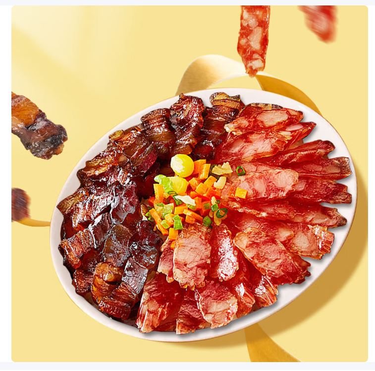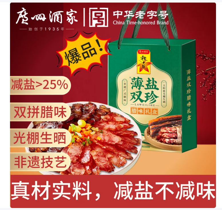 薄盐双珍腊肠礼盒 内容物/主要原料:薄盐腊肠200克,薄盐腊肉200克 产品规格:1×12×400g 产品卖点 减盐>25%,0添加味精,悦享健康; 经典腊肠+腊肉双拼组合,一盒双享; 非遗工艺,太阳能光棚生晒,口味正宗; 小礼盒包装,精致大方,心意之选;