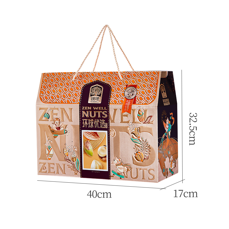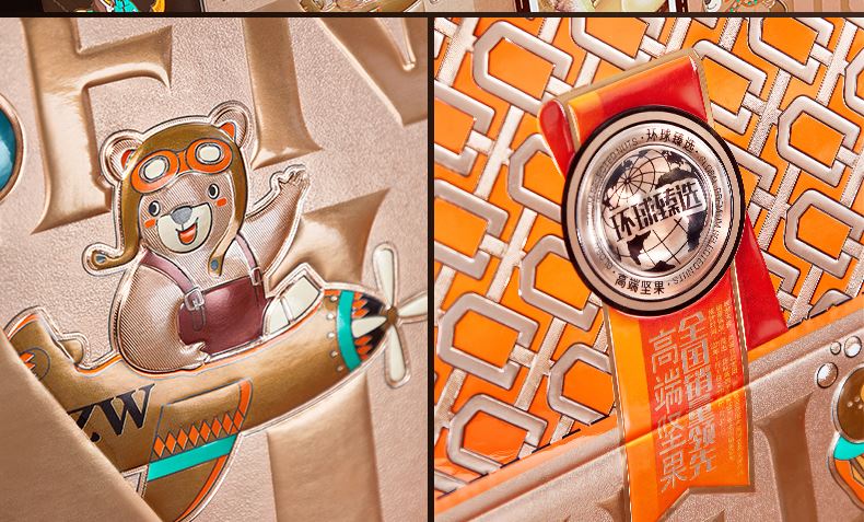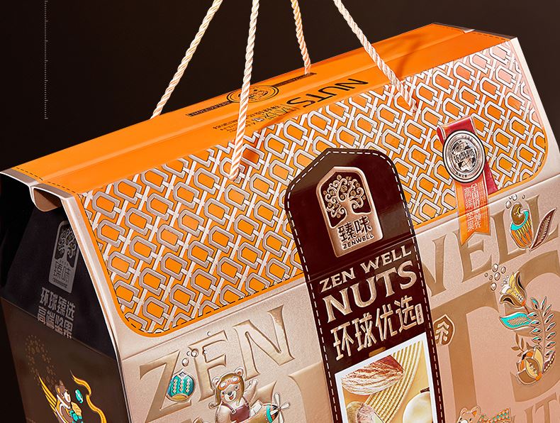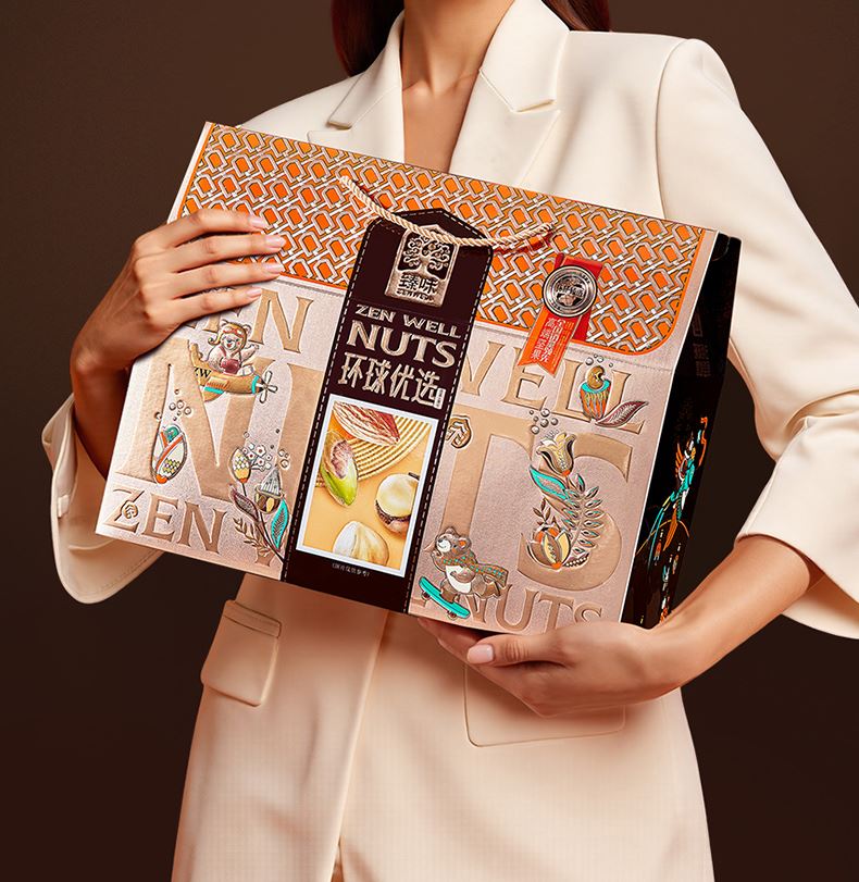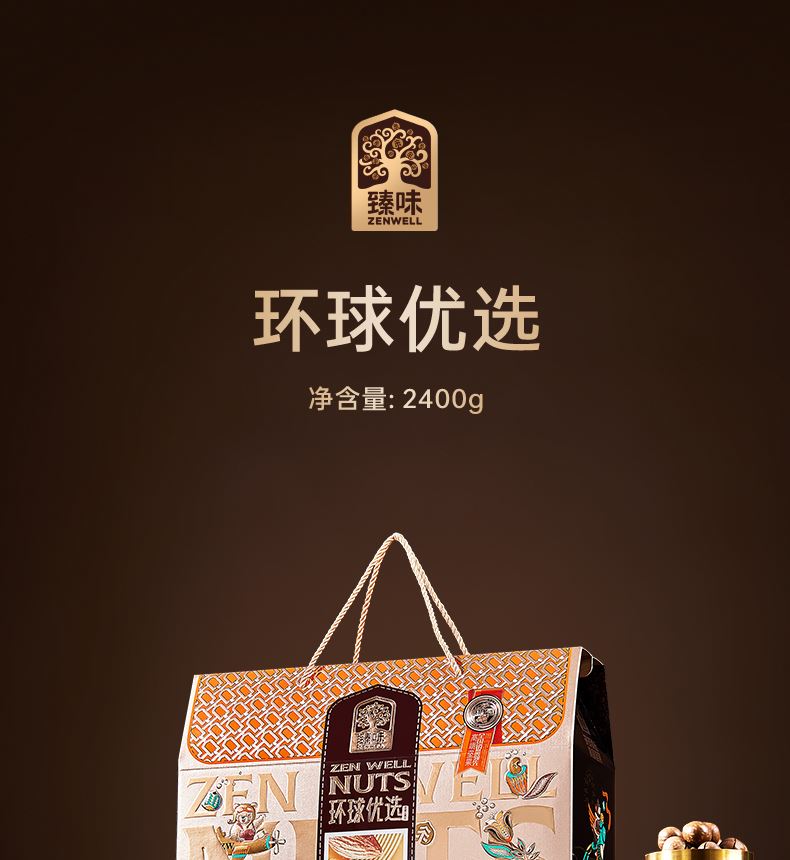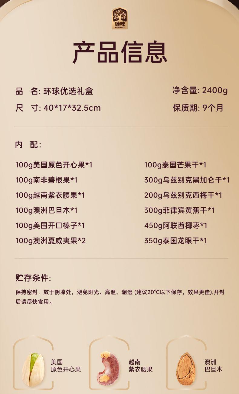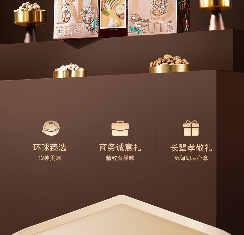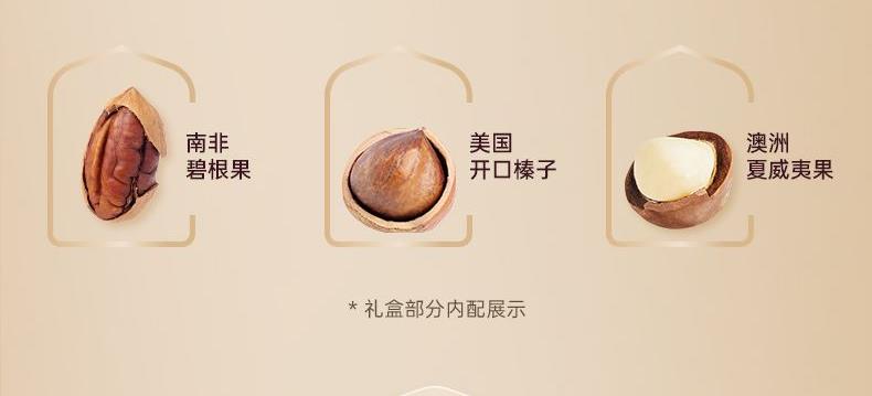 100g南非碧根果 100g美国原色开心果 100g越南紫衣腰果 100g澳洲夏威夷果 100g澳洲巴旦木 100g美国开口榛子 100g智利原色核桃 200g智利西梅干 200g乌兹别克黑加仑干 300g菲律宾黄蕉干 350g土耳其金提干 300g阿联酋椰枣 350g泰国龙眼干 区别方正的传统礼盒,采用屋顶盒包装设计,奢华烫金的包 装风格不改,加宽了盒面的宽 度和高度,使礼盒更加大气净含量:2400g,内含6种坚果、 6种果干,大克重礼盒,丰富 内配,升级口感与包装,在团购市场,表现较为优异。
