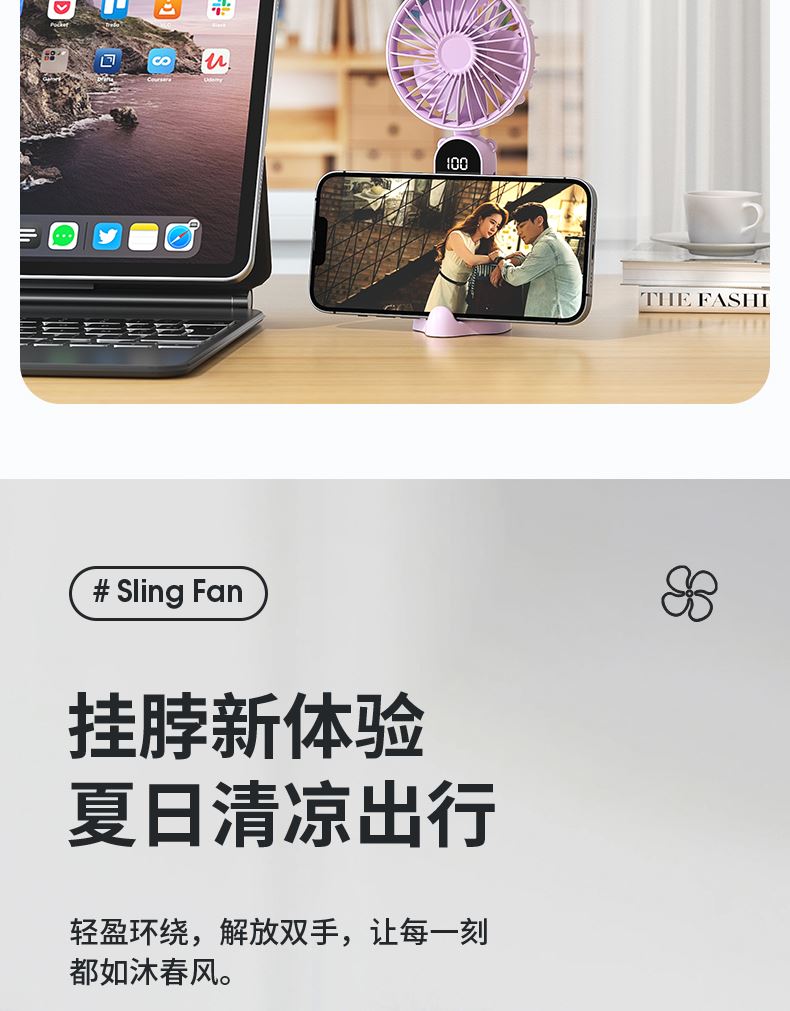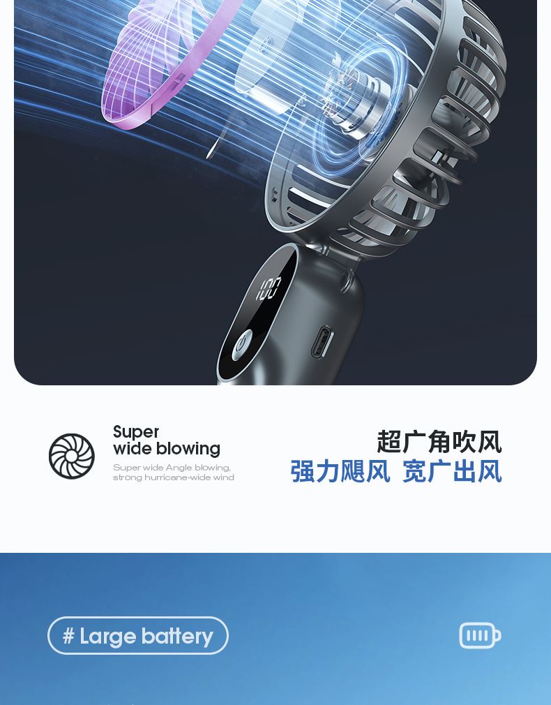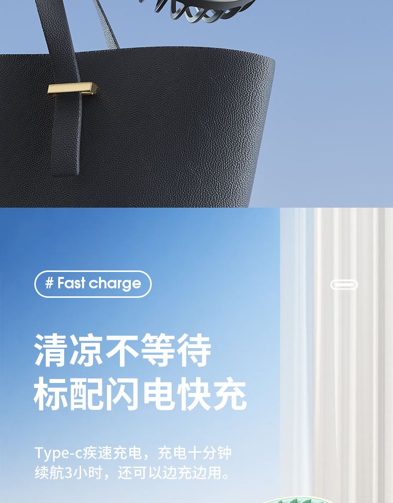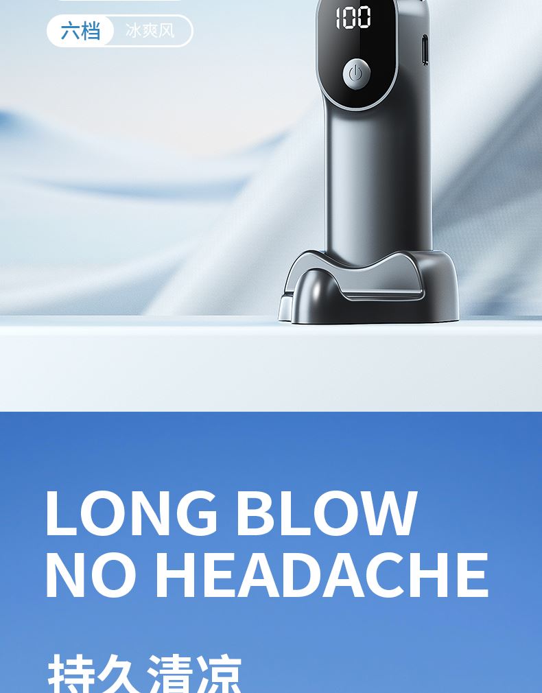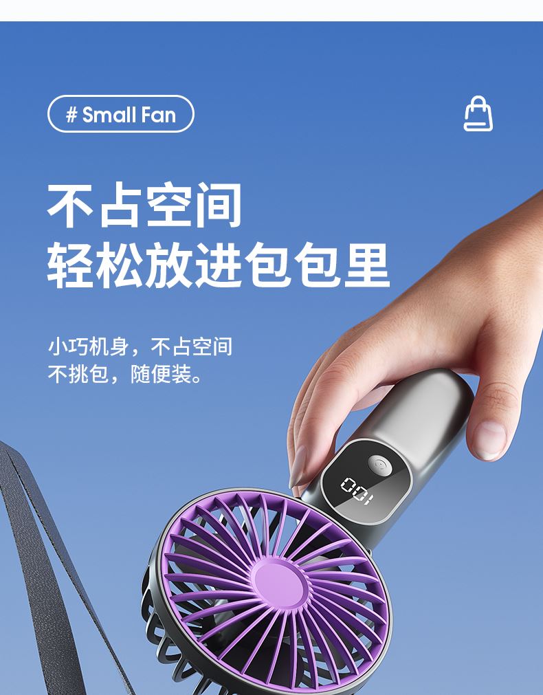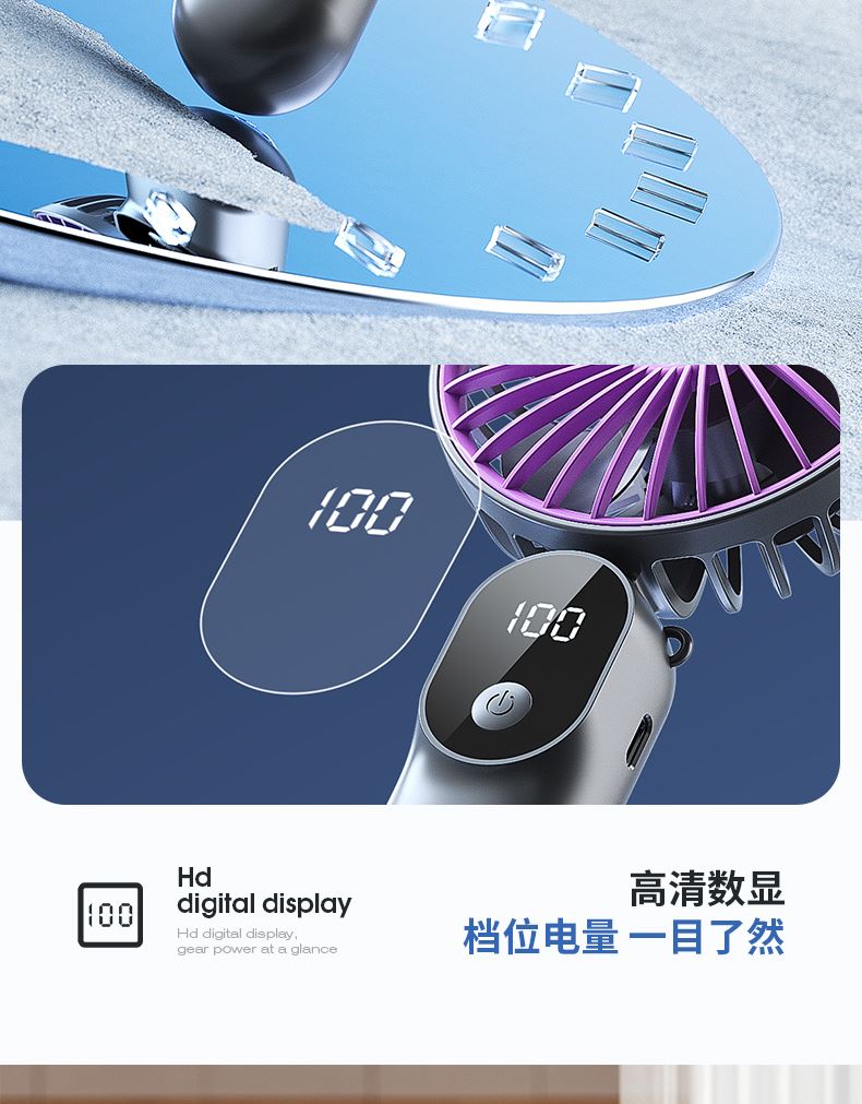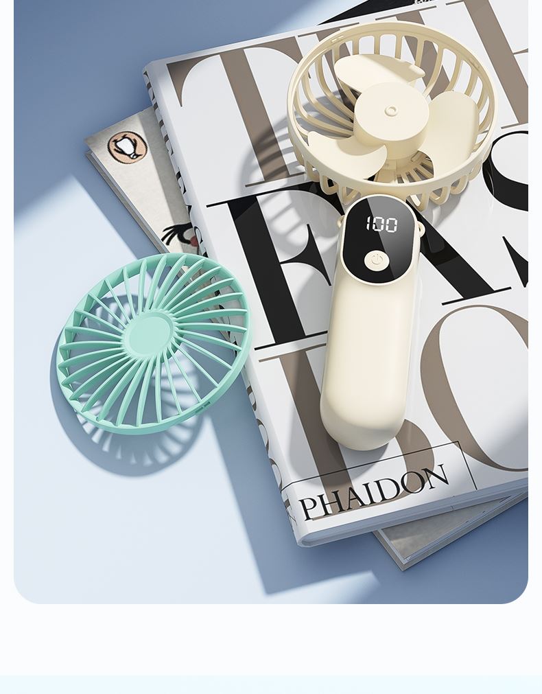 产品材质:ABS 产品功能:6档风力调节 产品容量:1200mAh 产品尺寸:202*90*37cm 产品颜色:灰色,米色 6档调节,风力随心选;智能数显外屏,档位清晰可见;可折叠,可挂脖;搭配香薰功能,让这个夏天充满香气。