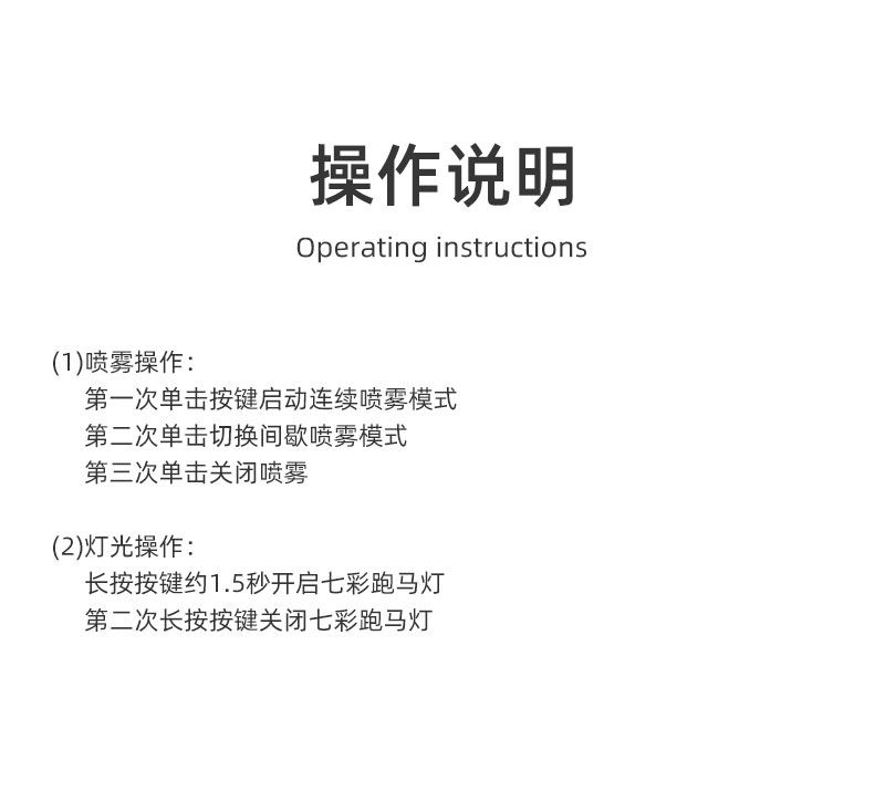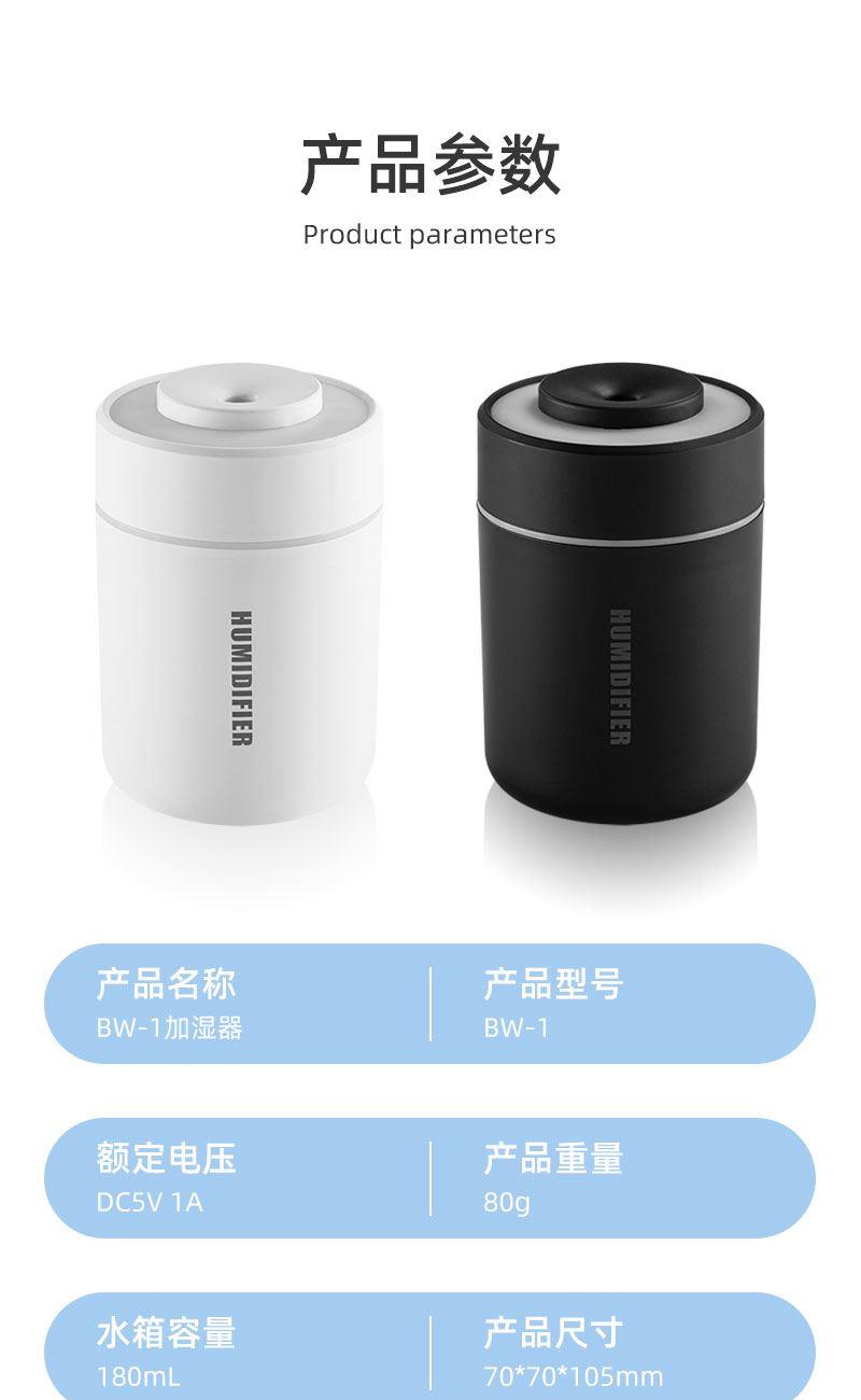 小白桌面喷雾加湿器 产品型号:BW1 产品颜色:白色,黑色 水箱容量:180mL 产品材质:ABS+PP+电子元器件 产品尺寸:70*70*105mm 产品包装:70*70*110mm 一箱数量:120pcs/箱 外箱尺寸:43×35.5×45.5cm 产品净重/毛重:80g/112g 整箱净重/毛重:13.44KG/14.44KG 【功能特点】: 低噪风机润物细无声 持续/间歇 双模式 七彩跑马灯炫彩造型 180mL容量加湿,细腻雾大