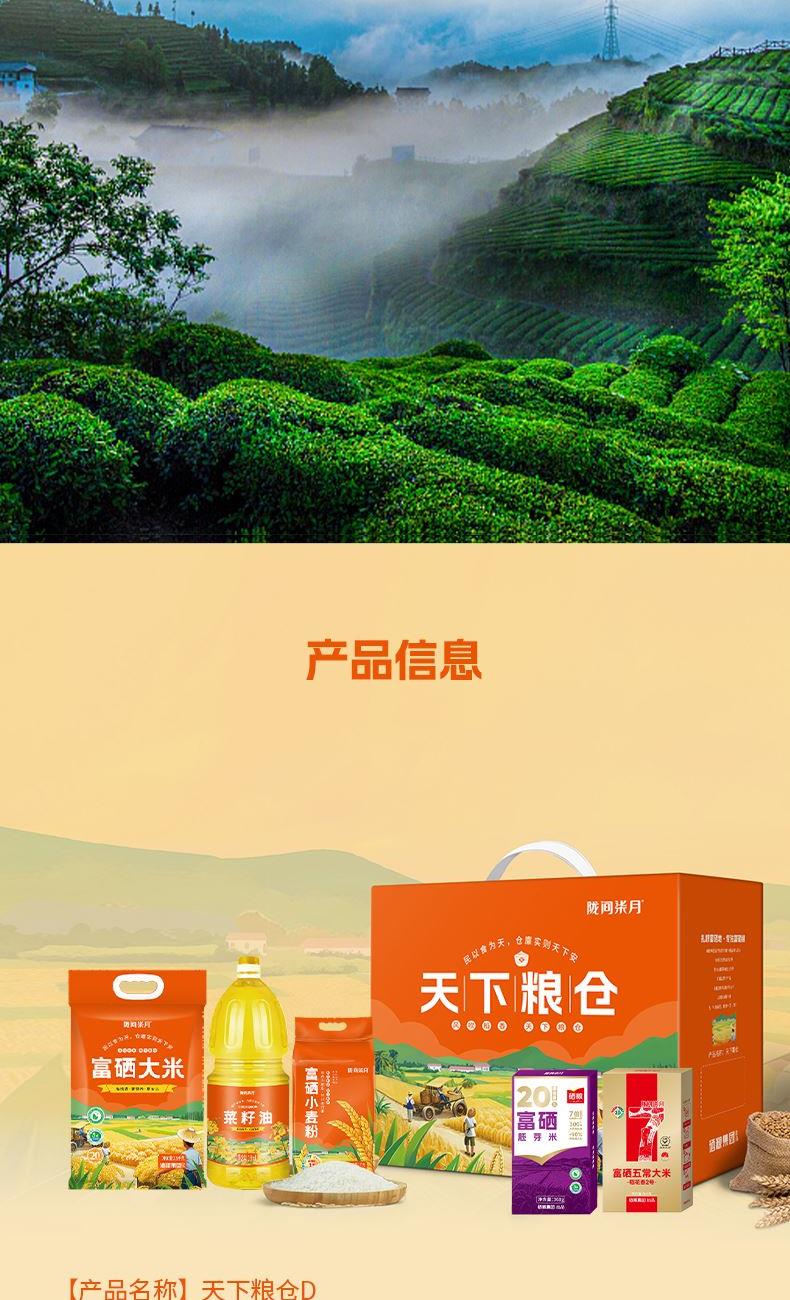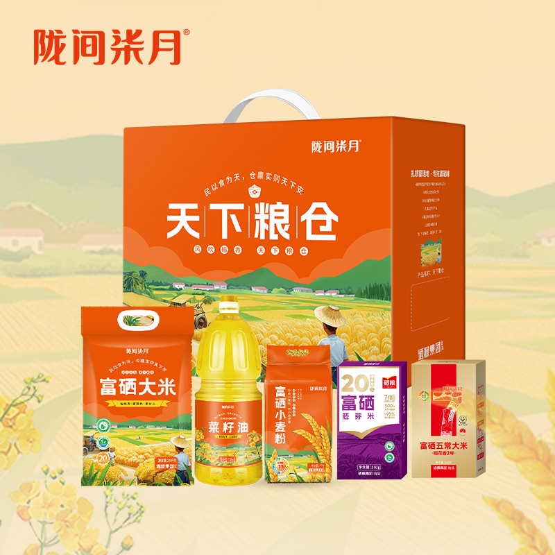 产品信息 品 名:天下粮仓D 规 格:富硒大米2.5kg、菜籽油1.8L, 富硒小麦粉1kg 富硒五常大米360g、富硒胚芽米360g 包 装:长38cm宽17.5cm高30cm 产品特色 1、富有机硒认证,每100g平均硒含量≥20ug。更易被人体利用吸收 2、菜籽油油品透亮、香味浓郁,含有丰富的维生素E以及油酸、亚油酸、亚麻酸等; 3、正宗五常大米,稻花香二号 3、精美礼盒,送礼佳品。