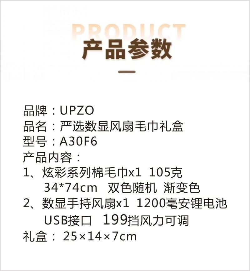 型号:A30F6 产品内容: 1、炫彩系列棉毛巾×1 (双色随机 渐变色) 规格: 34CM*74CM (105g每条) 2、数显手持风扇*1 1200毫安锂电池 USB接口 (续航时间120分钟左右 199挡风力可调) 礼盒规格:25*14*7CM 数显风扇 1200毫安 199档可调 长续航 靓丽外观 炫彩系列毛巾精选精梳棉材质结合色织工艺 优质且靓丽