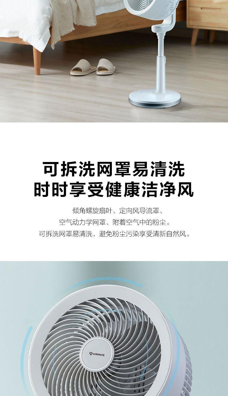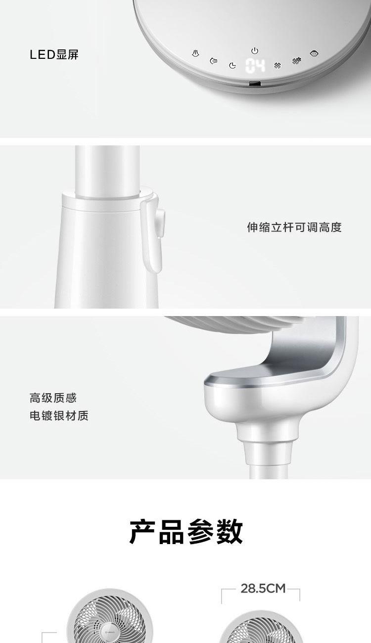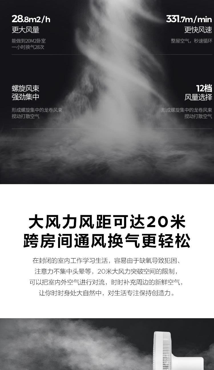 额定电压:220V 额定功率:37W 额定功率:50Hz 控制方式:遥控式 定时:15小时预约定时开机 净重:4.04kg 包装尺寸:680*335*340mm 包装明细:遥控器、说明书 激活整屋空气,让家处处生风 强劲涡流风束,激活全屋空气 大风力风距可达20米,跨房间通风换气更轻松 立体交互式送风,上下左右四面八方 强风不直吹,健康不头疼 空调好搭档,省电又舒适 15H定时,健康入眠 可拆洗网罩易清洗,时时享受健康洁净风