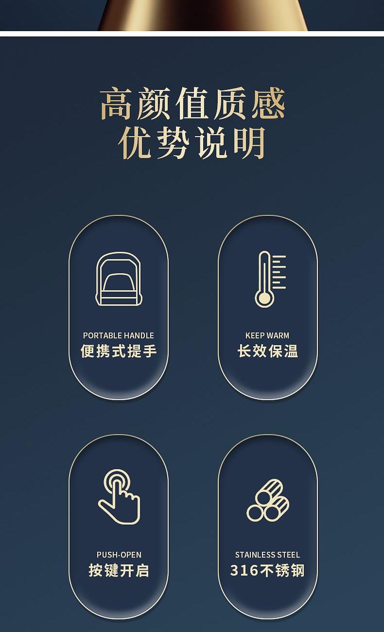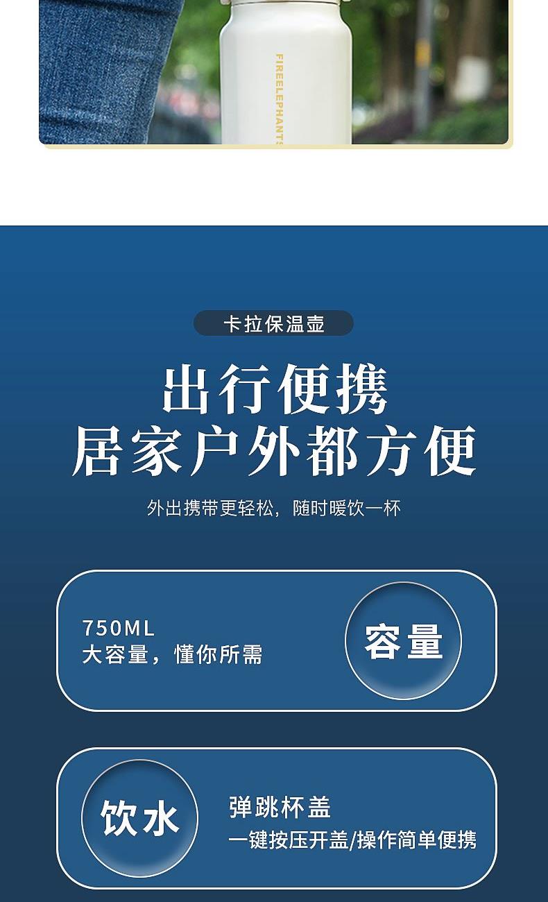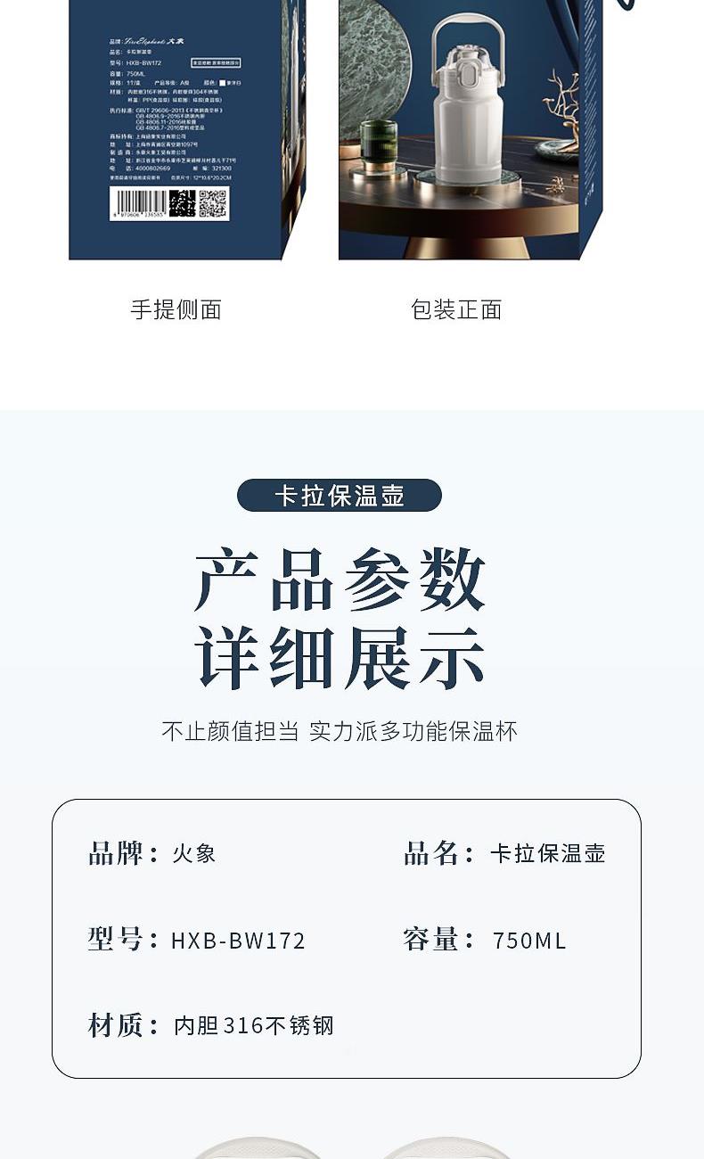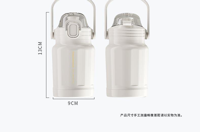 产品规格:750ML ;(大壶900ML定制款) 产品材质:内胆底316不锈钢,内胆壁体304不锈钢 杯盖:PP(食品级) 硅胶圈:硅胶(食品级) 产品颜色:白色 彩盒尺寸:12*10.6*20.2CM 外箱尺寸:L66*W62*H22CM 1、优质食品级不锈钢内胆,耐磨耐酸碱显著提升,使用寿命提升的同时还能长效保温6小时。 2、宽大手提设计,便捷携带,可居家、户外、旅行、办公、车载多场景适用。 3、乐享生活,内置吸管,双饮模式设计,可吸引、可直饮,慢吸快饮,精致时尚。