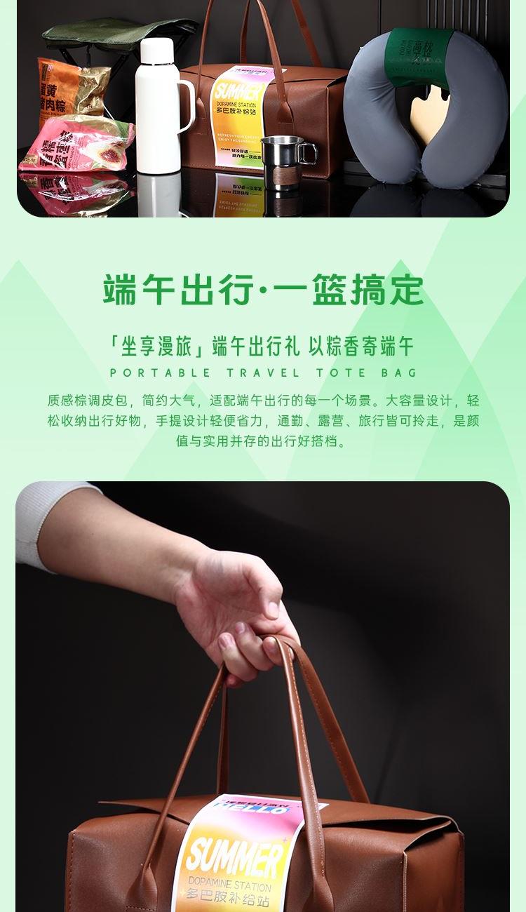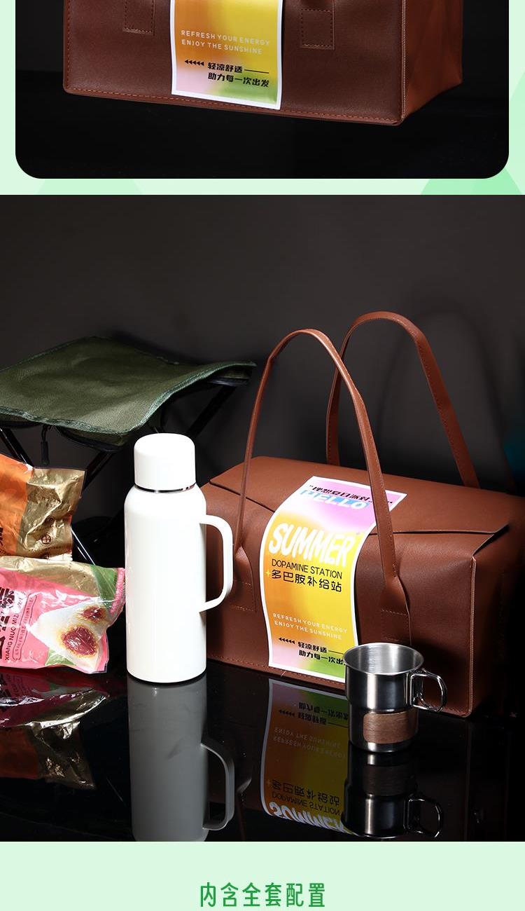 配置 手提式便携旅行皮包*1 户外颈枕*1五芳斋粽x4只(蜜枣粽*2-鲜肉粽*2) 智能保温壶*1 820ml 户外金属小杯*1 户外便携折叠凳*1 材质 水杯:316材质 皮革 定制工艺 激光 镭射 腰封印刷赠送场景:商务拜访 会议随手礼 企业形象推广礼