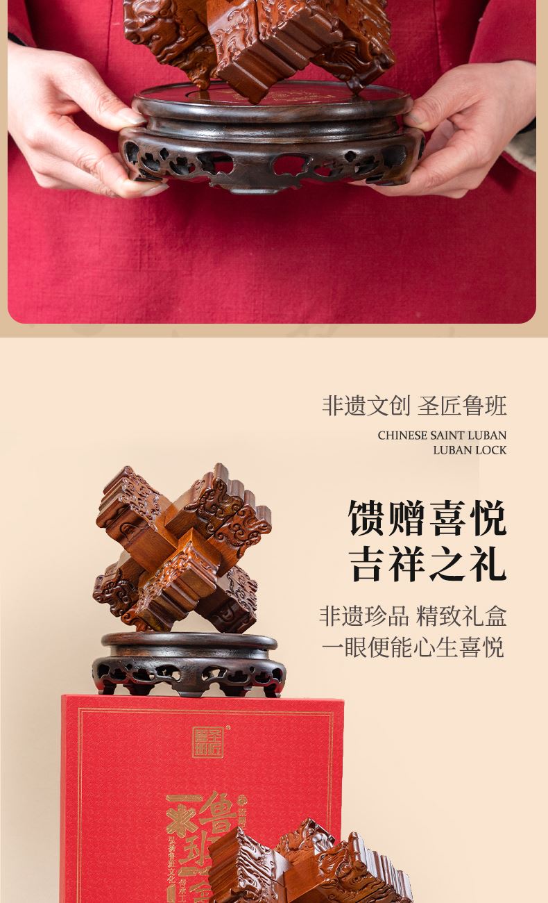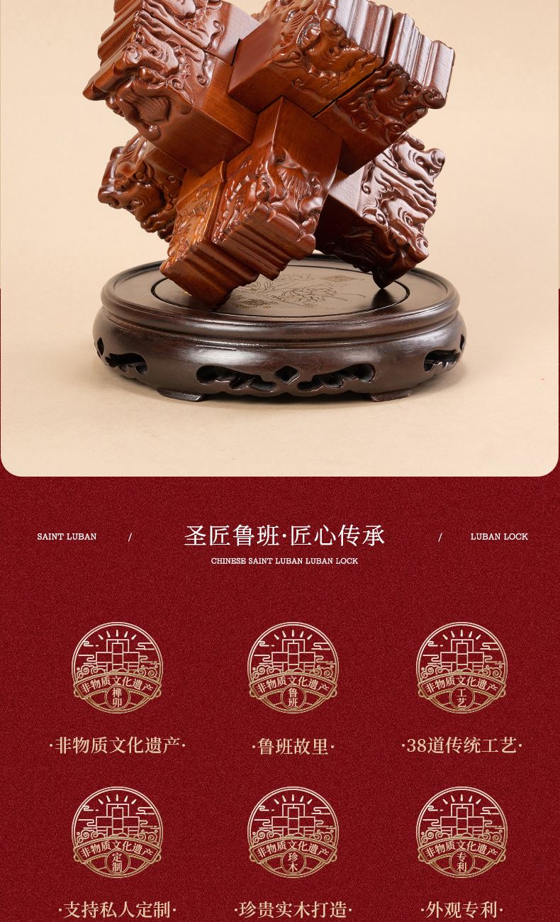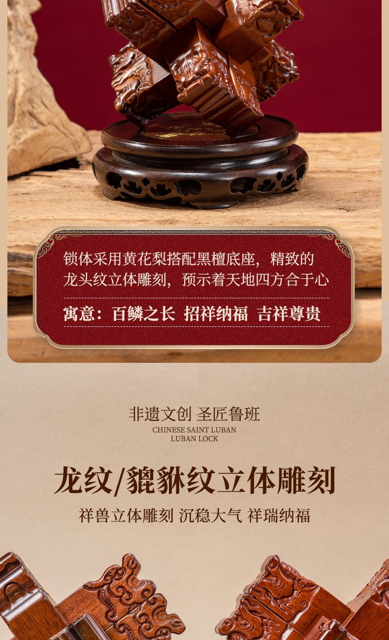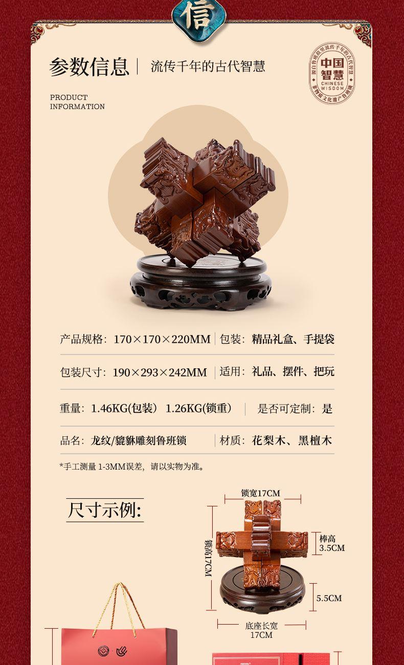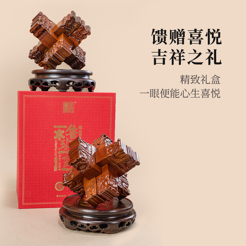 材质:花梨木、黑檀木 产品规格:170×170×220mm 包装规格:190×293×242mm 来至鲁班故里,非遗文创产品 龙翔九天赐福祉,此款龙纹雕刻六棒鲁班锁,匠心独运,精选花梨木锁体与黑檀木底座制成。锁体上雕刻成百鳞之长龙形纹饰,龙纹威武霸气,线条流畅;在中国传统文化中,龙象征着权势、高贵、尊荣,同时也代表着成功。这款鲁班锁无论是置于案头欣赏,还是作为礼物馈赠亲友,都是上等之选。