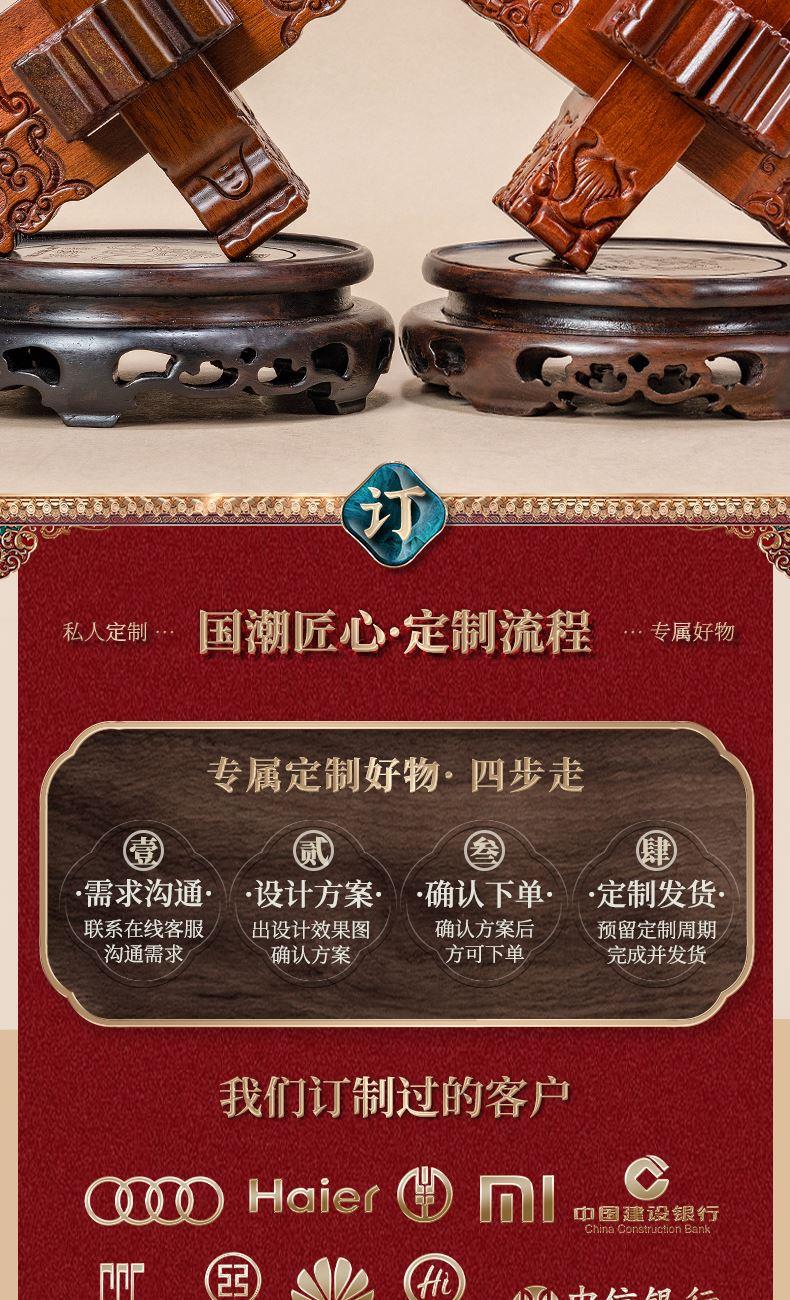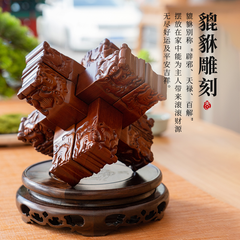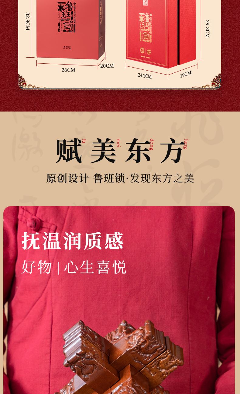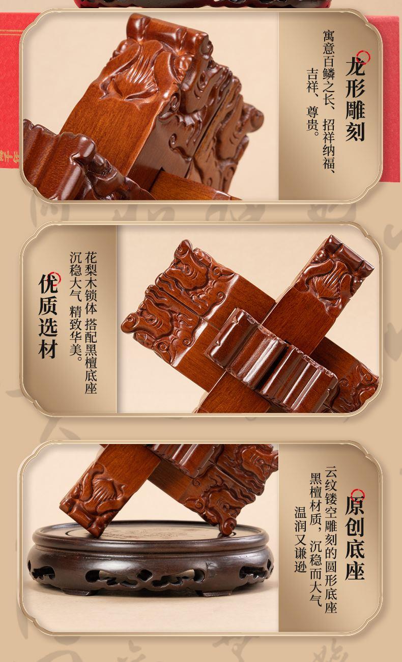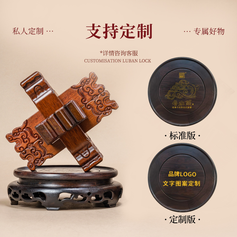 材质:花梨木、黑檀木 产品规格:170×170×220mm 包装规格:190×293×242mm 来至鲁班故里,非遗文创产品 龙翔九天赐福祉,此款龙纹雕刻六棒鲁班锁,匠心独运,精选花梨木锁体与黑檀木底座制成。锁体上雕刻成百鳞之长龙形纹饰,龙纹威武霸气,线条流畅;在中国传统文化中,龙象征着权势、高贵、尊荣,同时也代表着成功。这款鲁班锁无论是置于案头欣赏,还是作为礼物馈赠亲友,都是上等之选。
