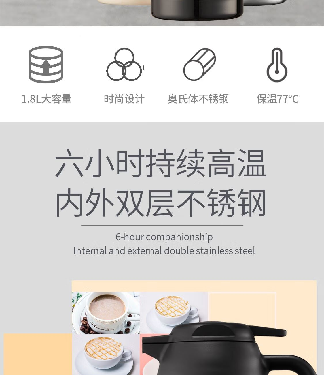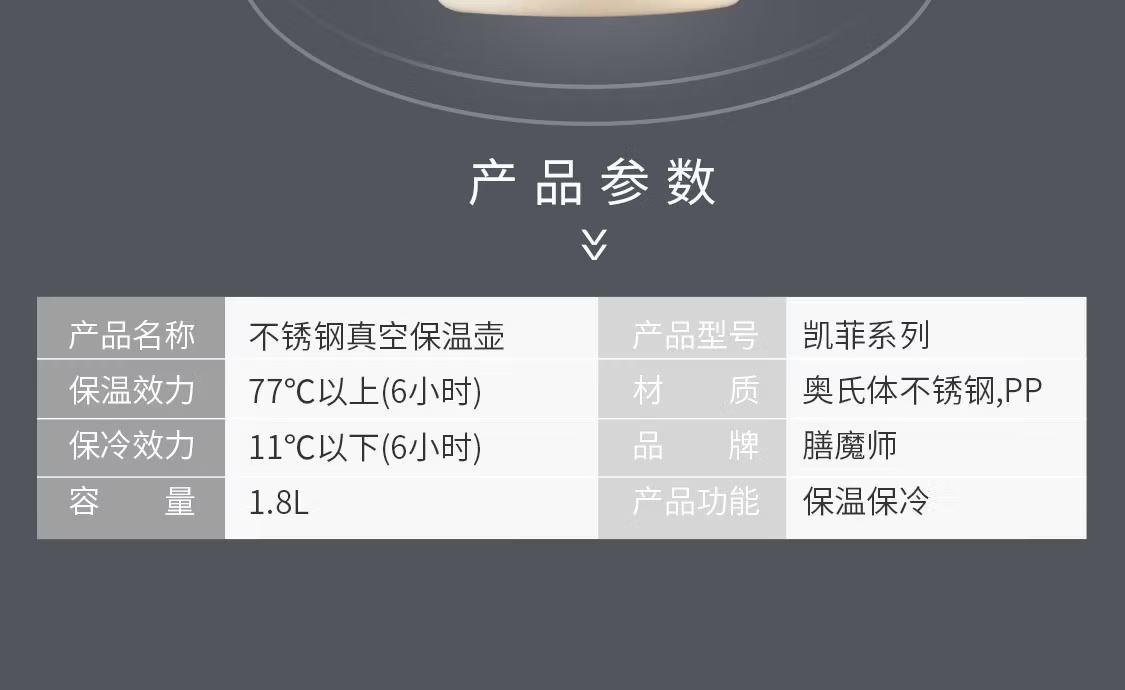 颜 色:SBK不锈钢色 CBK亮黑 WHT白色 容 量:1.8L 类 型:保温壶 定 制:可以定制 材 质:304不锈钢色 保 温:6小时大约60°C 保 冷:6小时大约10°C