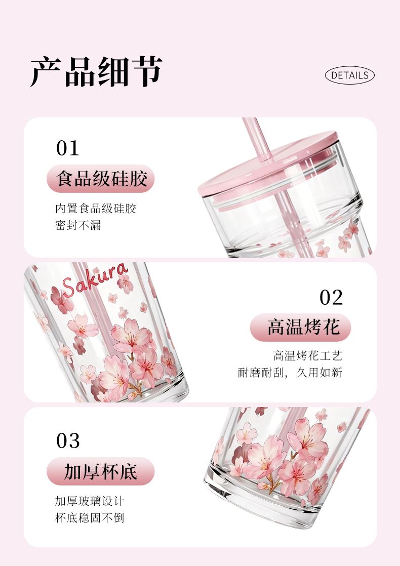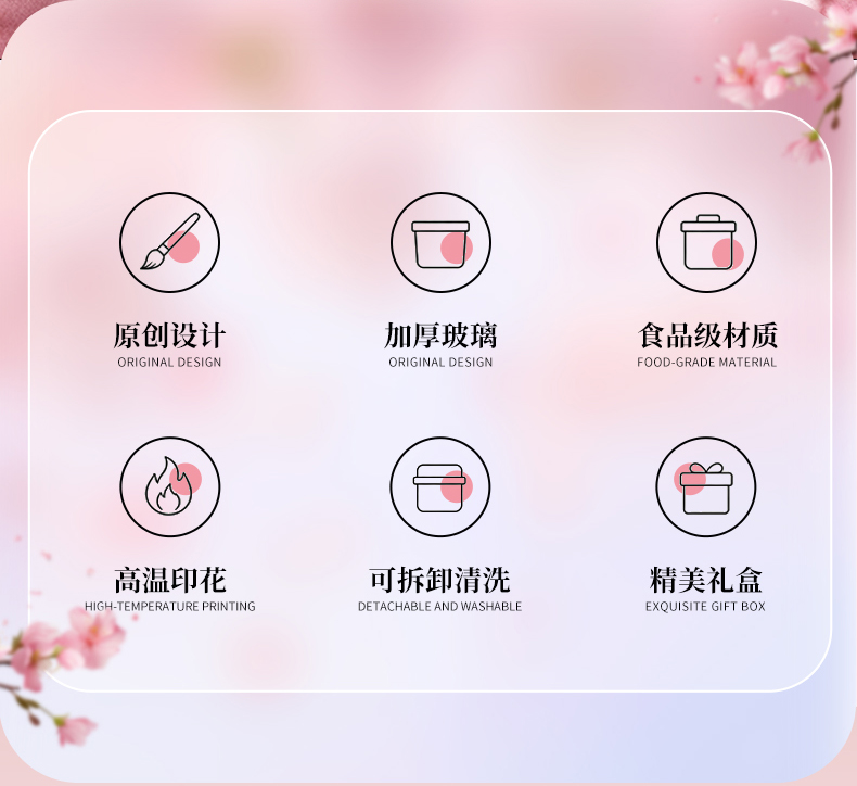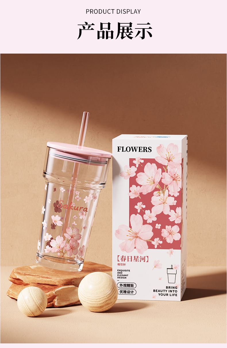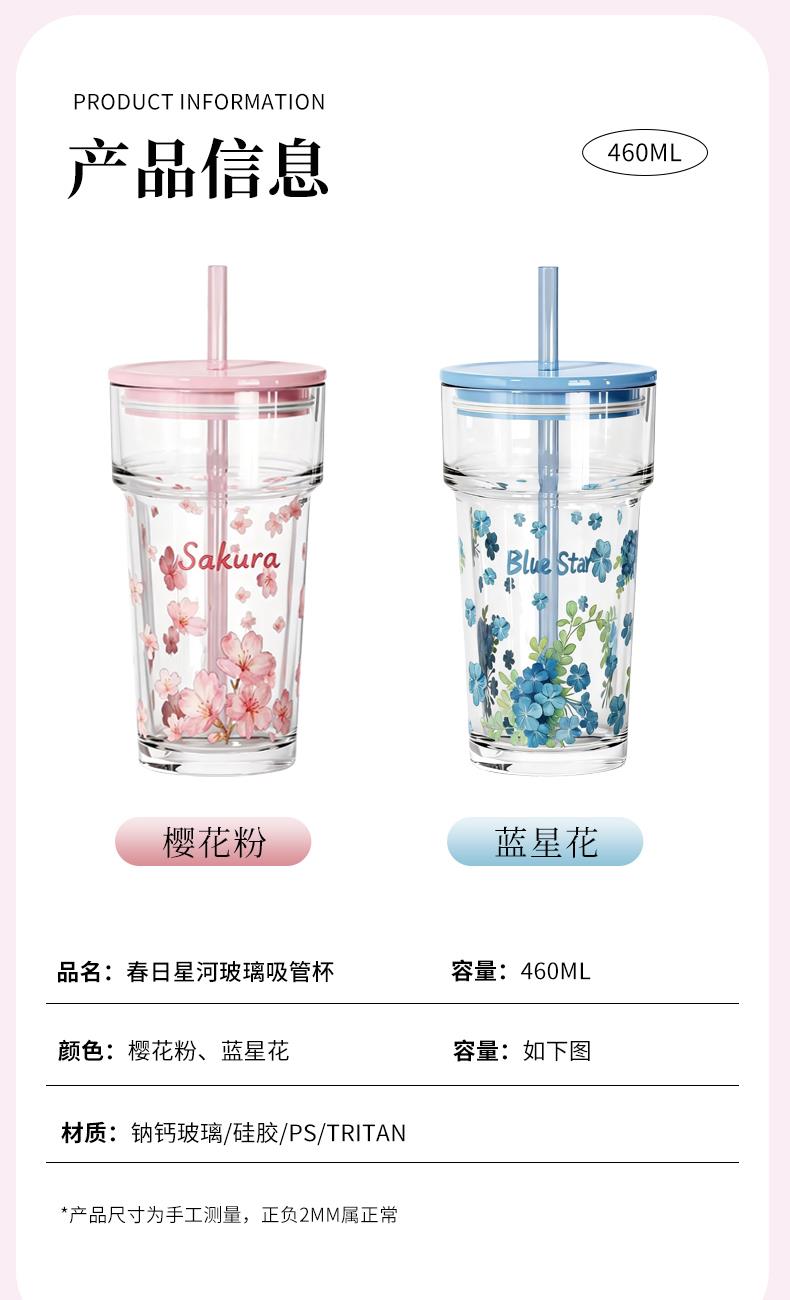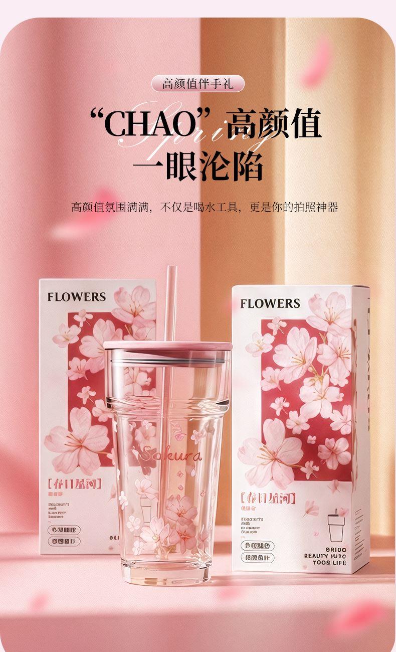 【组合】:水杯460ml*1 【材质】:钠钙玻璃/硅胶/PS/TRITAN 【彩盒尺寸】:90*90*210mm 【外箱尺寸】:56.4*28.8*43.8cm 【毛重】:18.1KG 产品卖点:1、礼盒印满樱花纹样,配色柔和高 级,当伴手礼 / 节日福利,颜值直接戳审美 2、透明玻璃杯身印满粉樱,礼盒满铺樱花纹样,配色温柔高 级,自用赏心悦目,送礼自带仪式感 3、上班装水、居家装零食、野餐带水果,或是当闺蜜伴手礼、节日员工福利,这套 “颜值 + 实用” 双在线,用得上也看得顺眼。