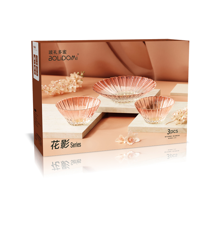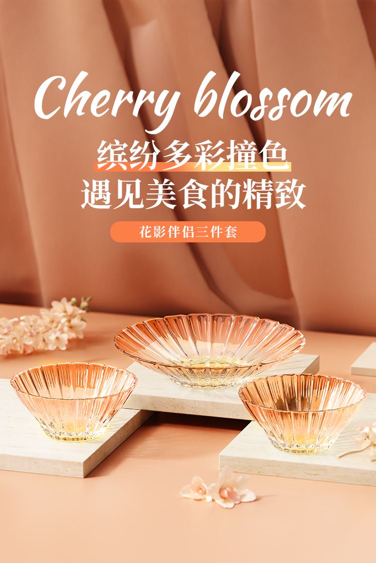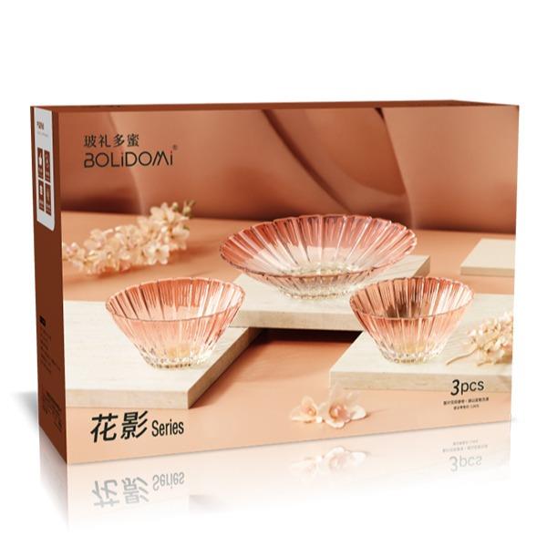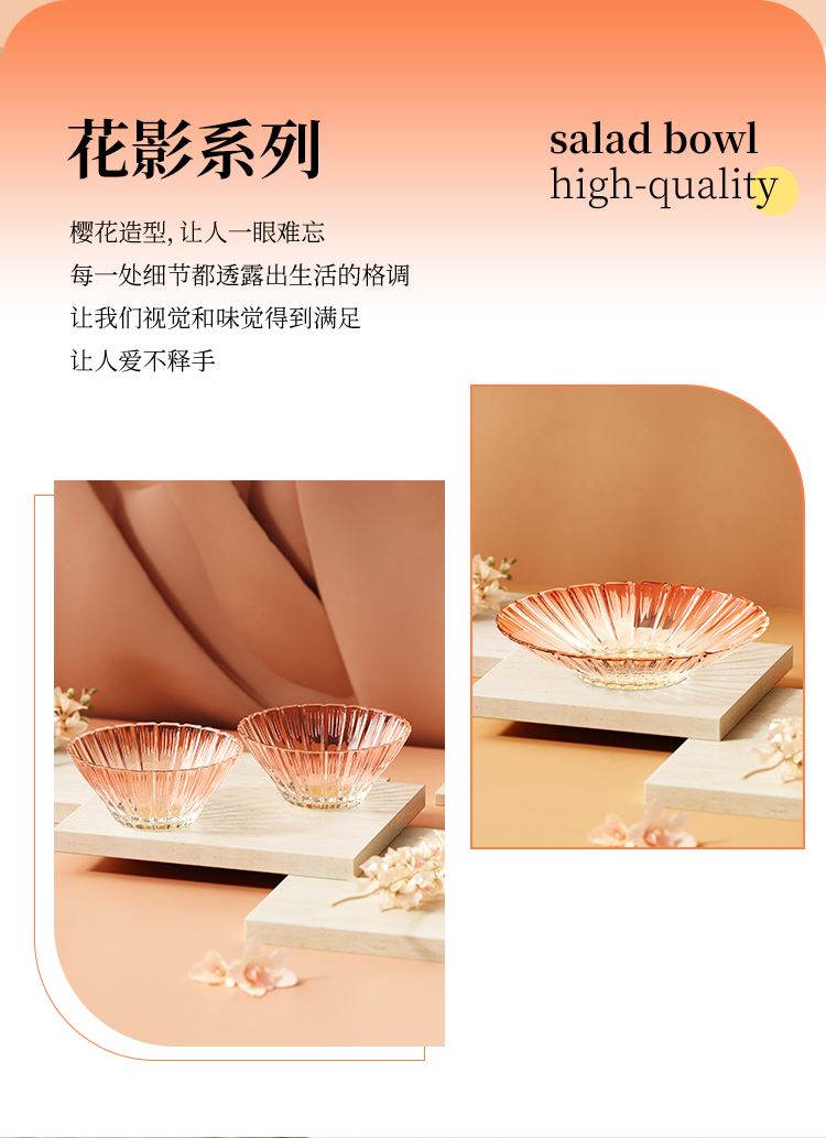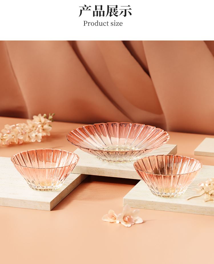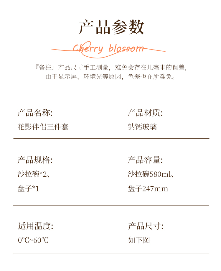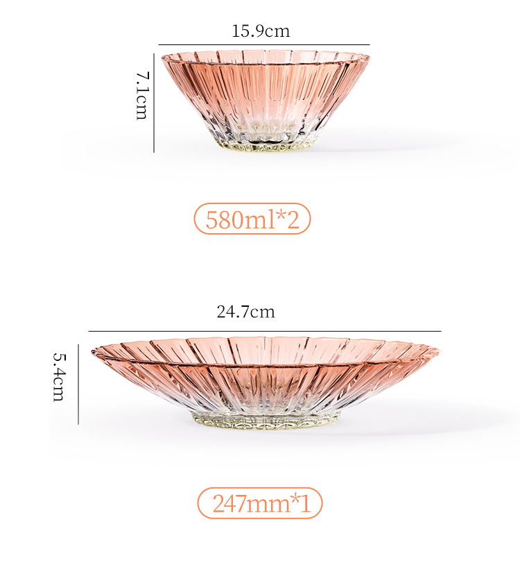 【组合】:沙拉碗580ml*2、果盘247*54mm 【材质】:钠钙玻璃 【彩盒尺寸】:422*100*290mm 【外箱尺寸】:43.6*42*59.8cm 产品卖点:1、花影绽放,纹路汲取“樱花”与“花影”的灵感,碗盘边缘呈现出宛如花瓣自然绽放的优雅波浪弧度。 2、渐变光影美学 采用温暖的高颜值渐变玻璃工艺,色彩从深到浅过渡自然。 3、多元场景,点亮精致生活一套包含水杯、沙拉碗和点心盘,轻松驾驭各种日常需求。
