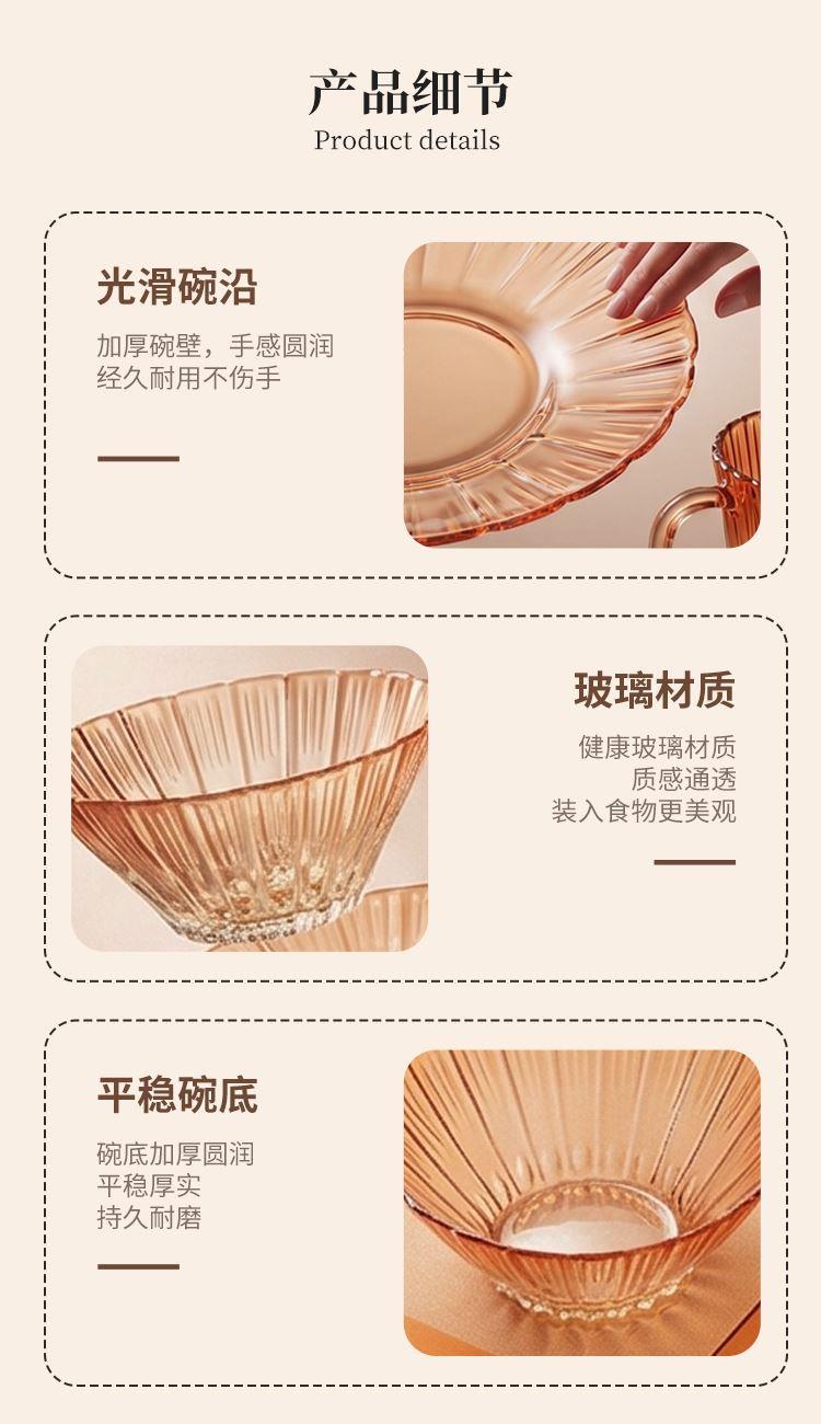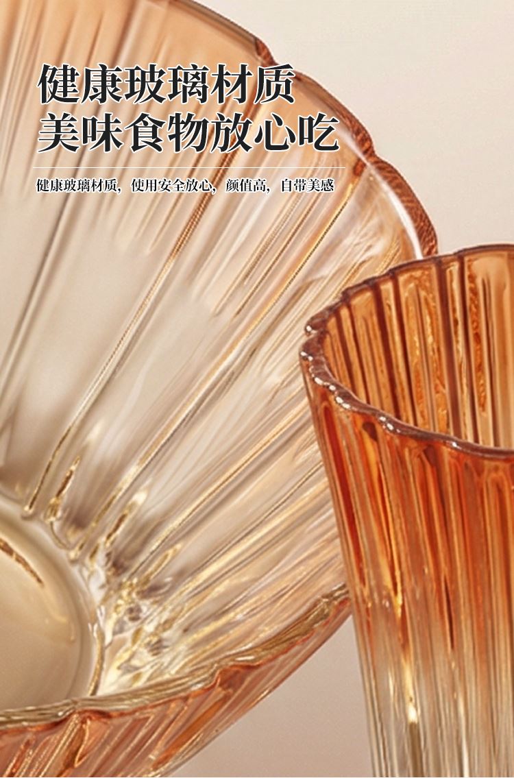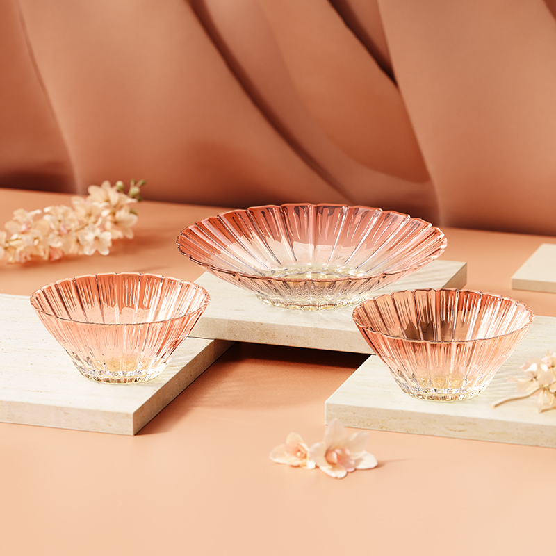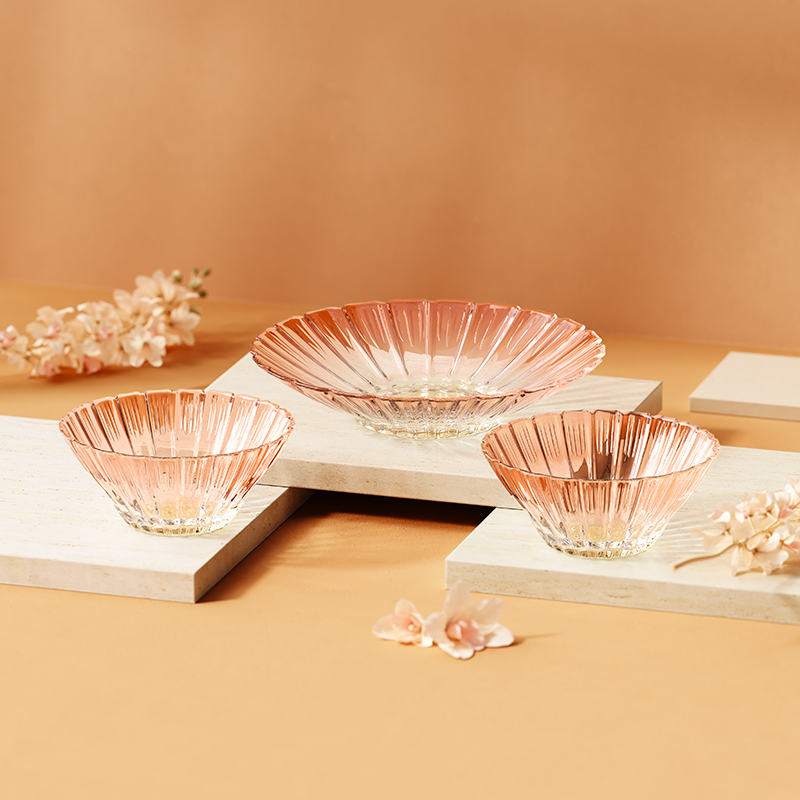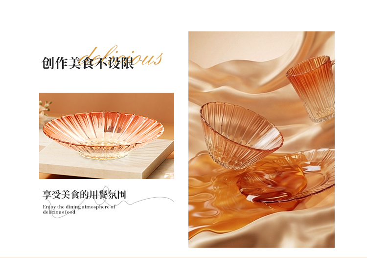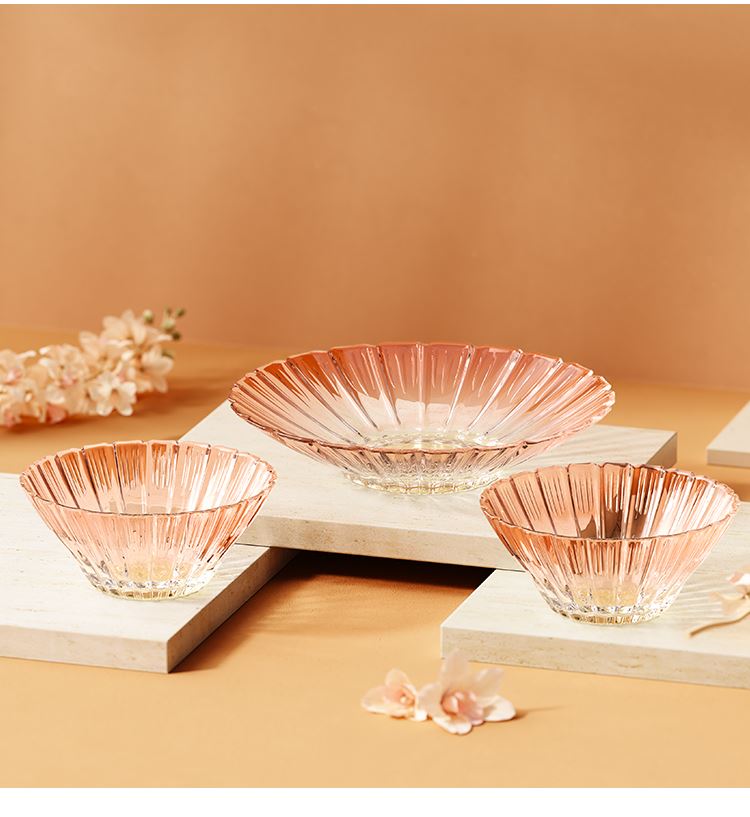 【组合】:沙拉碗580ml*2、果盘247*54mm 【材质】:钠钙玻璃 【彩盒尺寸】:422*100*290mm 【外箱尺寸】:43.6*42*59.8cm 产品卖点:1、花影绽放,纹路汲取“樱花”与“花影”的灵感,碗盘边缘呈现出宛如花瓣自然绽放的优雅波浪弧度。 2、渐变光影美学 采用温暖的高颜值渐变玻璃工艺,色彩从深到浅过渡自然。 3、多元场景,点亮精致生活一套包含水杯、沙拉碗和点心盘,轻松驾驭各种日常需求。