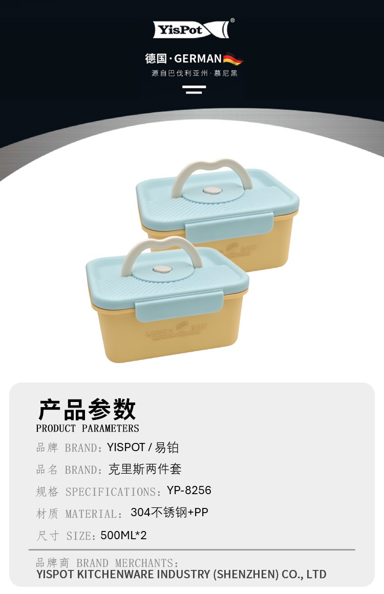 规格:保鲜盒500ML+500ML 型号:YP-8256 材质:304食品级不锈钢+PP 执行标准:GB/T 29601-2013 GB 4806.9-2023 304食品级,安全卫生 密封锁鲜,食材不串味 可注水/微波炉加热 硅胶密封圈,牢牢锁住不外溢