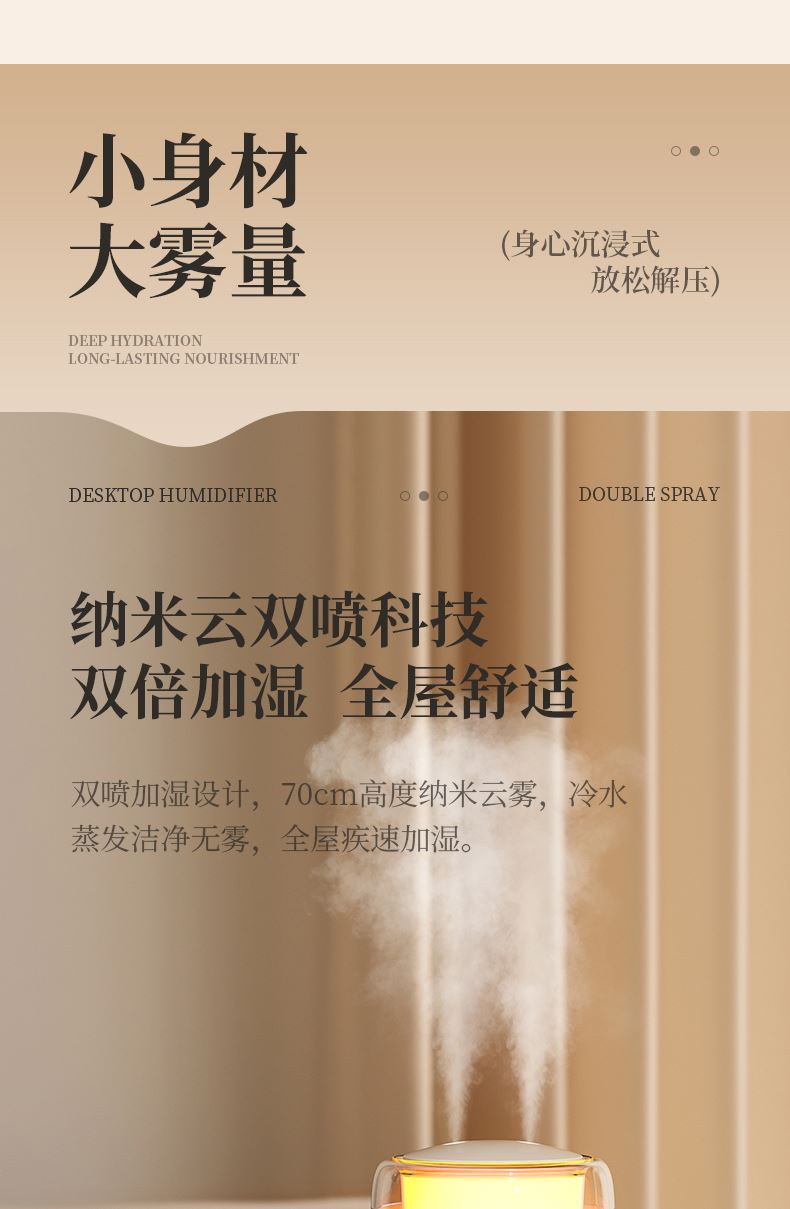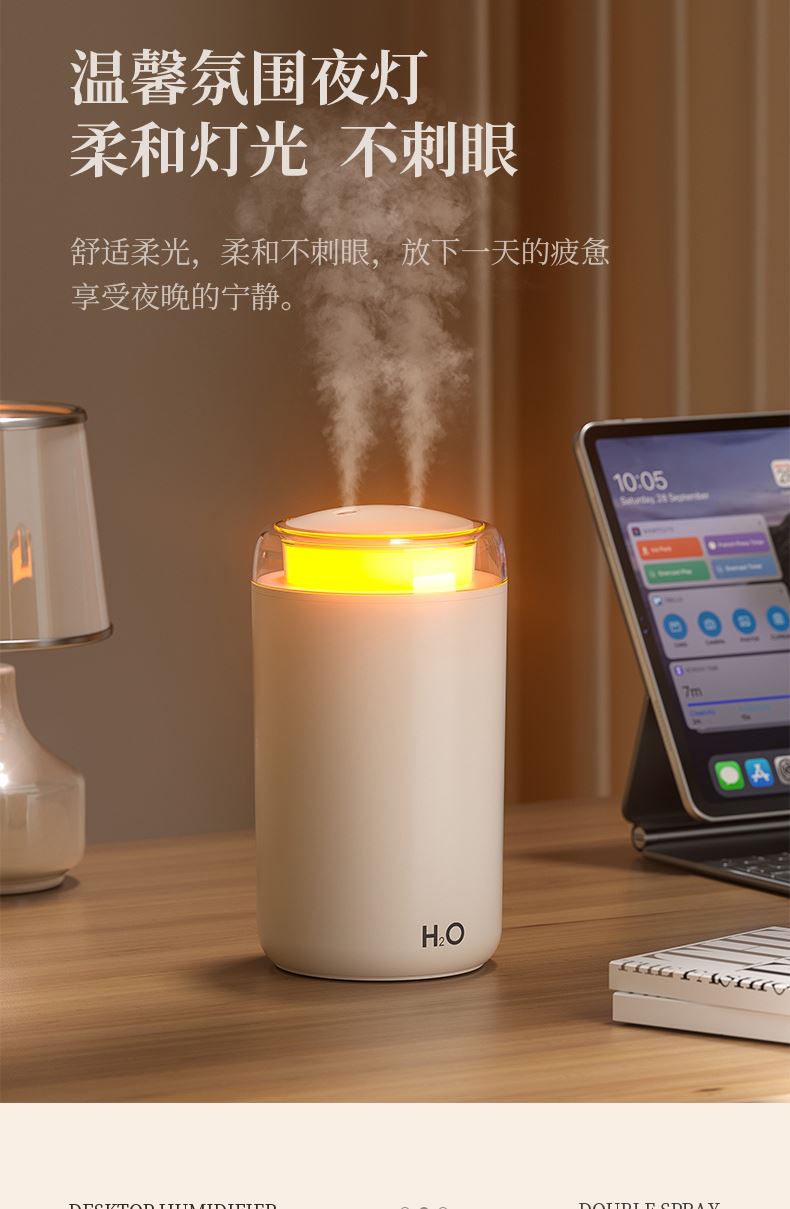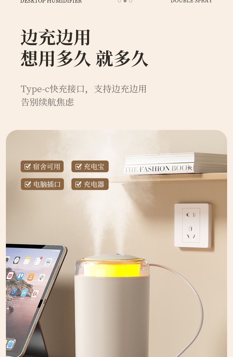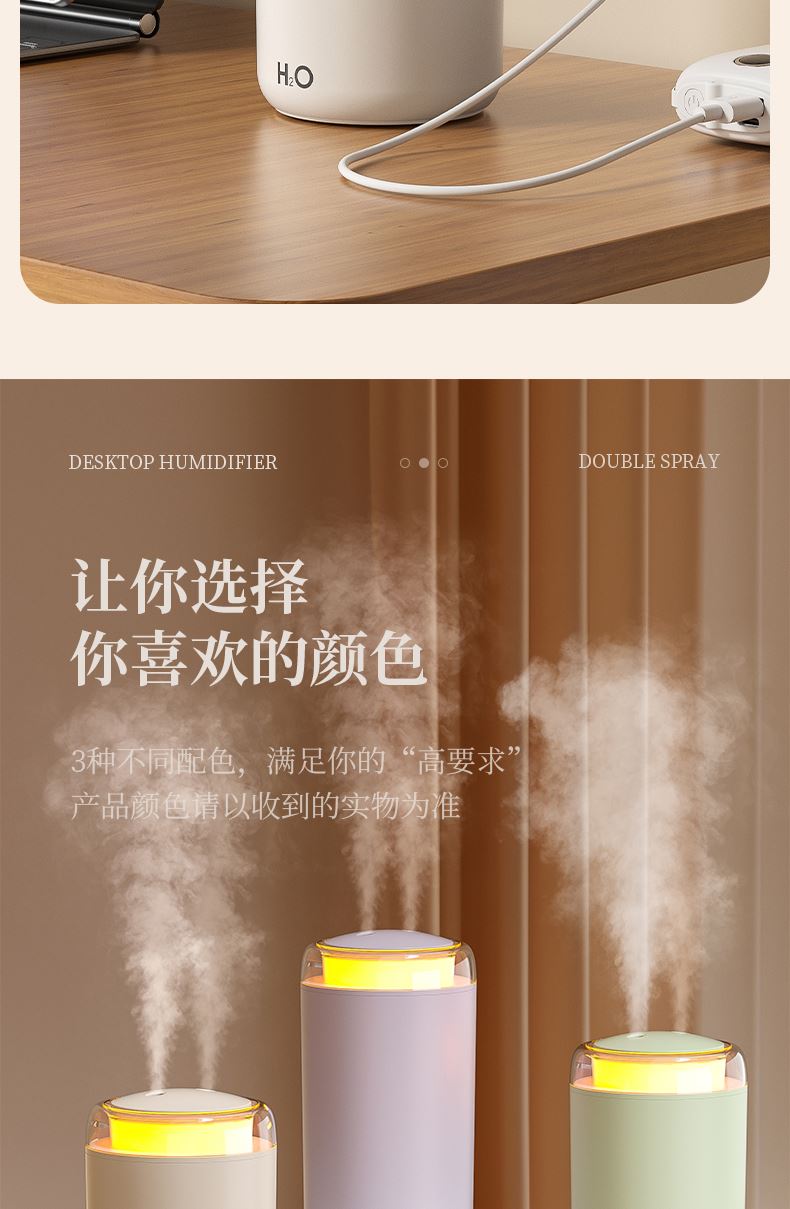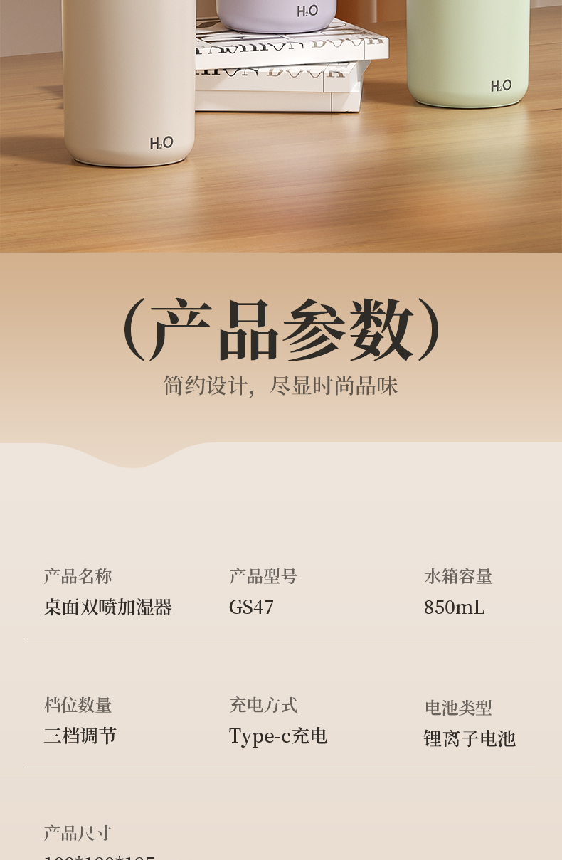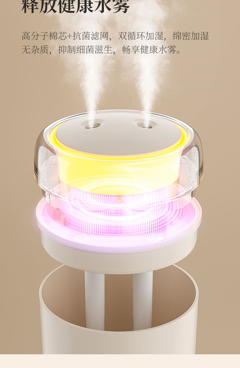 水箱容量:850ML 电池容量:1200mAh 档位:3档 产品尺寸:100*100*185mm 产品颜色:白色,绿色,紫色 告别传统下加水方式,揭盖直接上面加水,水箱分离设计,让加水和清洗更便捷; 多种喷雾方式,定制你的舒适体验; 搭配小夜灯,让生活更惬意