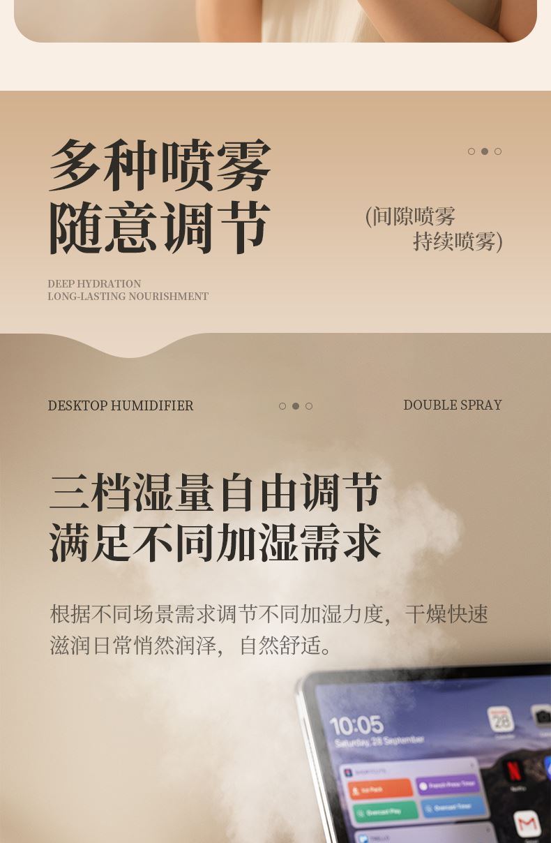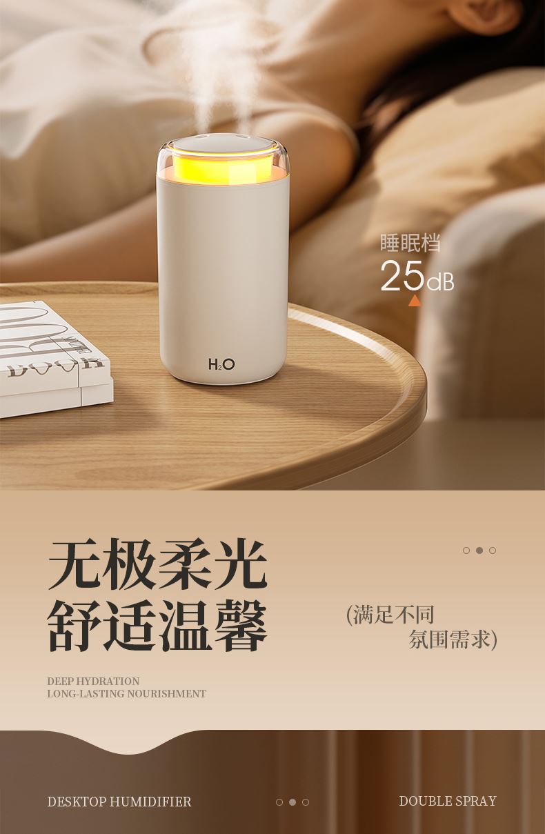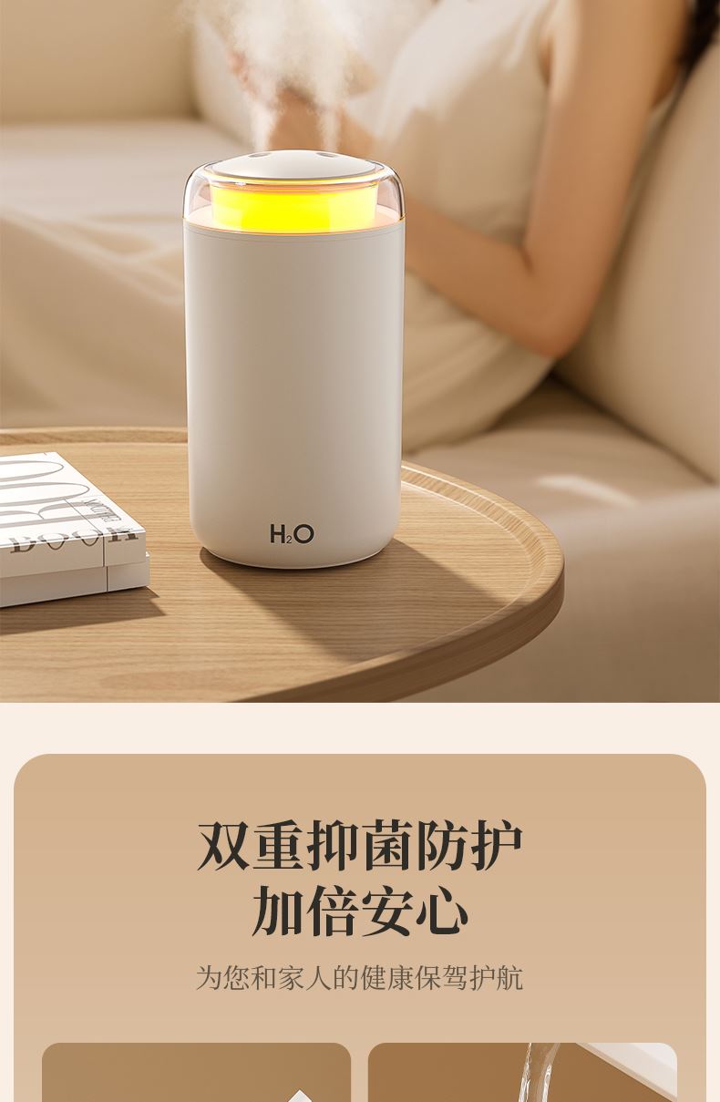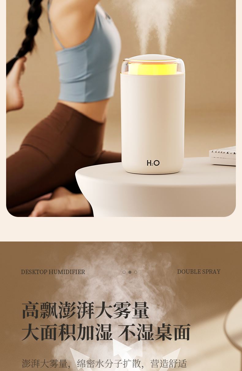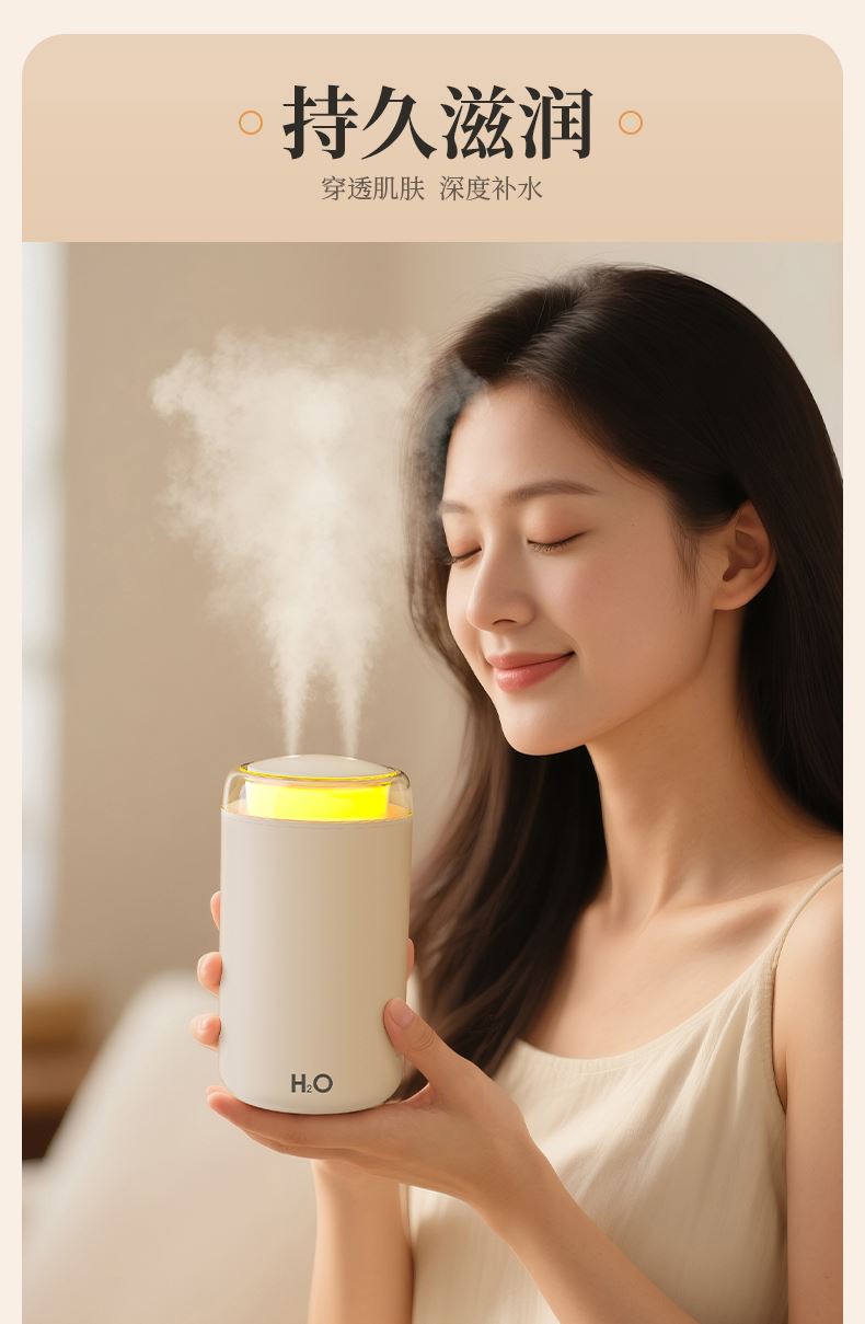 水箱容量:850ML 电池容量:1200mAh 档位:3档 产品尺寸:100*100*185mm 产品颜色:白色,绿色,紫色 告别传统下加水方式,揭盖直接上面加水,水箱分离设计,让加水和清洗更便捷; 多种喷雾方式,定制你的舒适体验; 搭配小夜灯,让生活更惬意