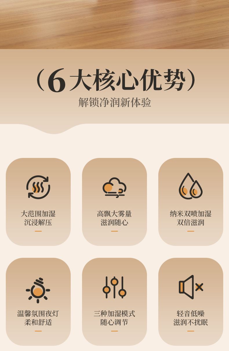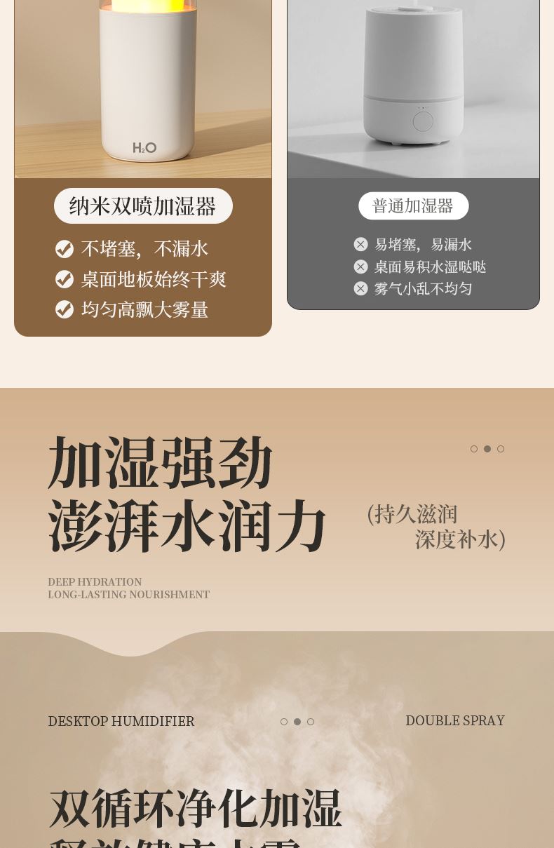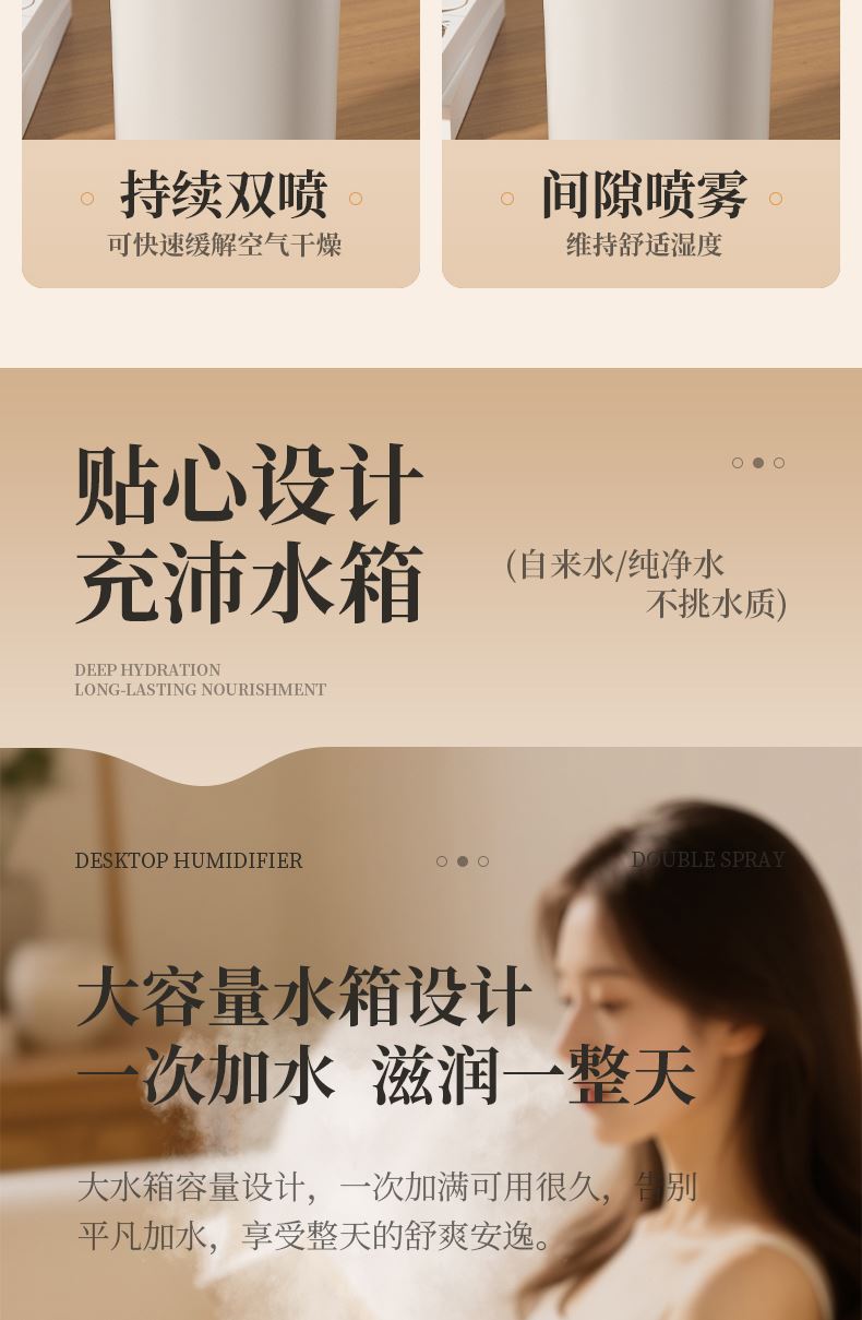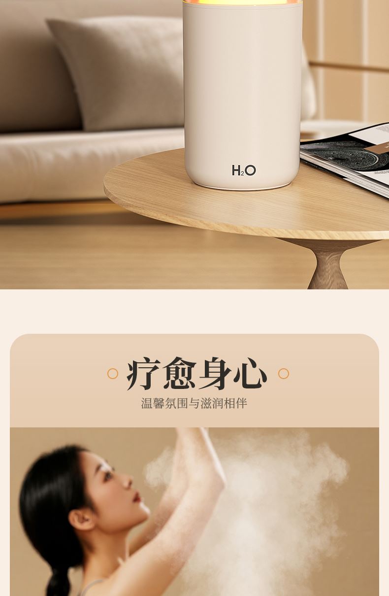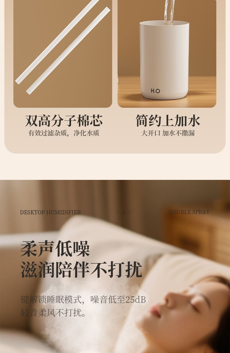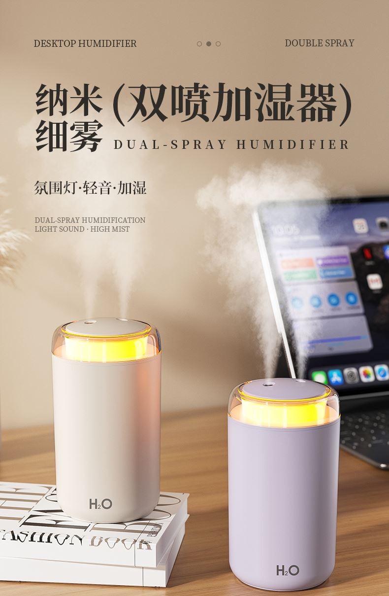 水箱容量:850ML 电池容量:1200mAh 档位:3档 产品尺寸:100*100*185mm 产品颜色:白色,绿色,紫色 告别传统下加水方式,揭盖直接上面加水,水箱分离设计,让加水和清洗更便捷; 多种喷雾方式,定制你的舒适体验; 搭配小夜灯,让生活更惬意