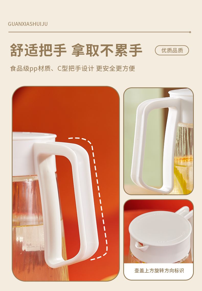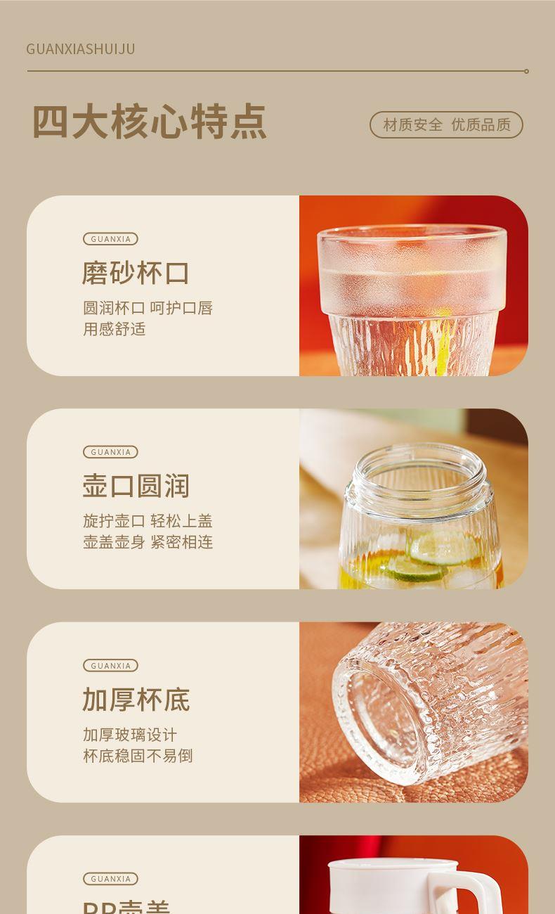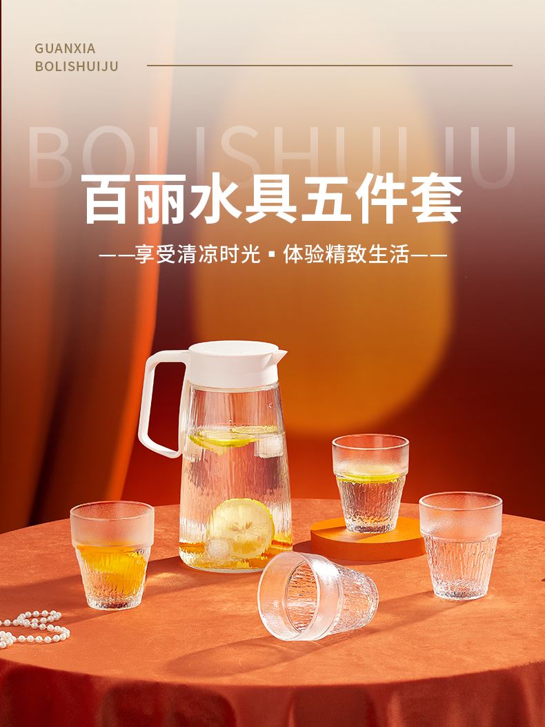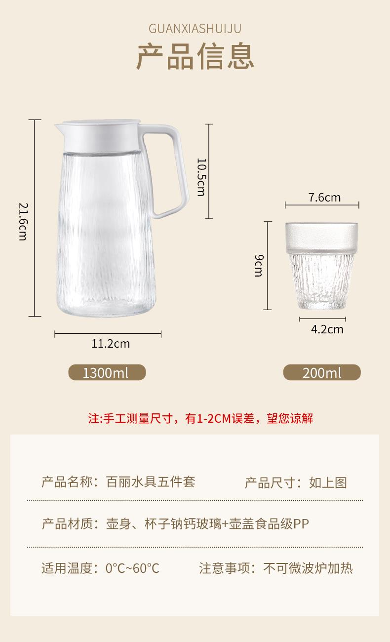 货 号:BL-SJ/L5 适用温度:0°C-60°C 产品参数:壶1200ml*1、杯200ml*4 材 质:高白料钠钙玻璃,食品级硅胶,食品级pp 彩盒尺寸:330*116*224mm 外箱尺寸:60.2*34.4*46.6cm 产品卖点:1.产品采用高白料钠钙玻璃材质,不易残留细菌易清洗,无异味,防腐蚀。2.玻璃水壶搭配可叠杯组合时尚设计、实用与空间节省理念 鹰嘴出水口设计,防尘防漏。3.分体壶盖加水更方便,大口径方便清洗,加宽把手结实防烫。