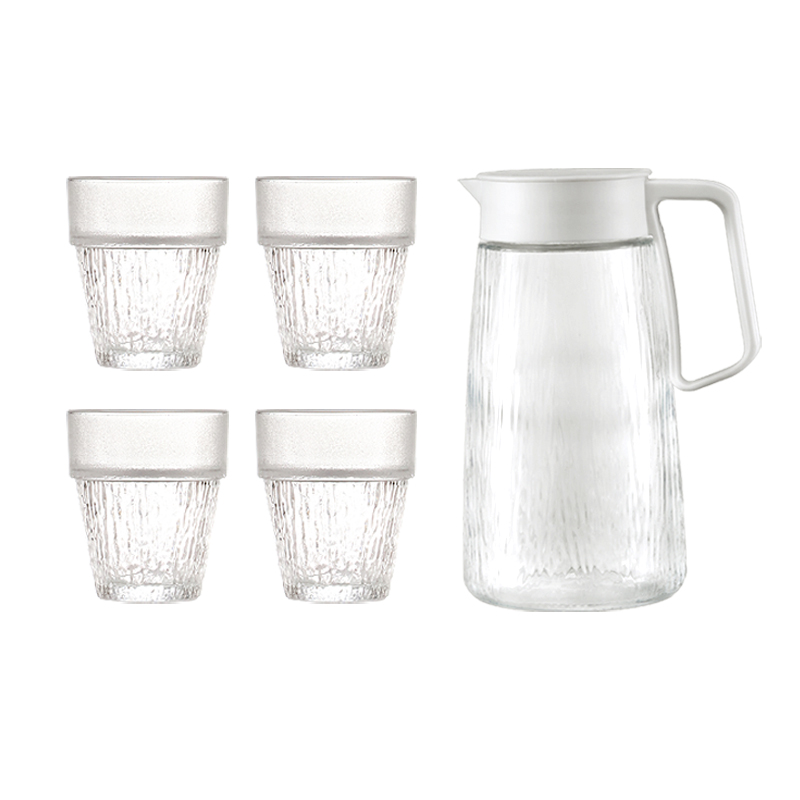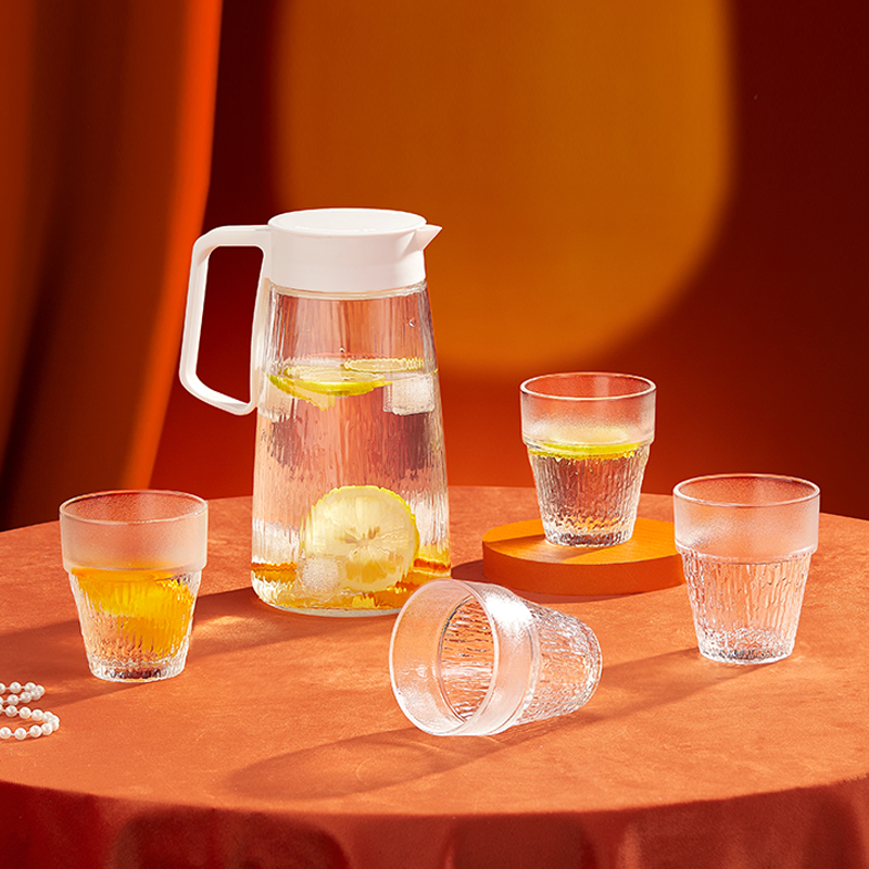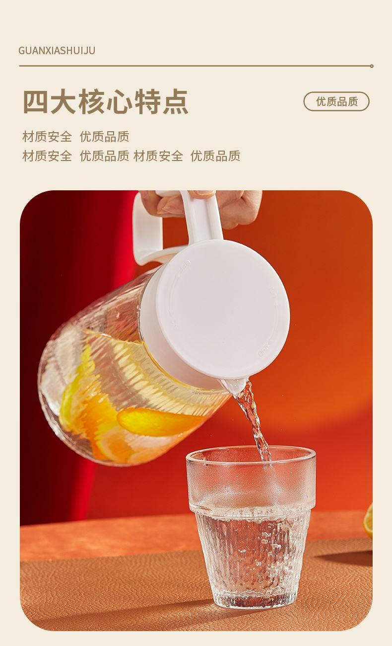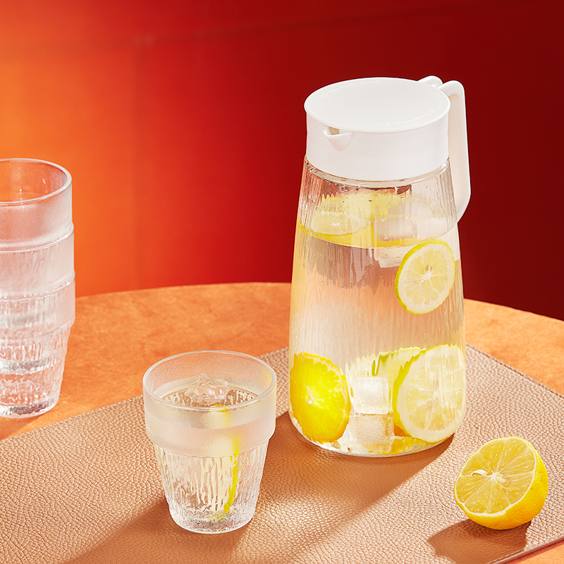 货 号:BL-SJ/L5 适用温度:0°C-60°C 产品参数:壶1200ml*1、杯200ml*4 材 质:高白料钠钙玻璃,食品级硅胶,食品级pp 彩盒尺寸:330*116*224mm 外箱尺寸:60.2*34.4*46.6cm 产品卖点:1.产品采用高白料钠钙玻璃材质,不易残留细菌易清洗,无异味,防腐蚀。2.玻璃水壶搭配可叠杯组合时尚设计、实用与空间节省理念 鹰嘴出水口设计,防尘防漏。3.分体壶盖加水更方便,大口径方便清洗,加宽把手结实防烫。