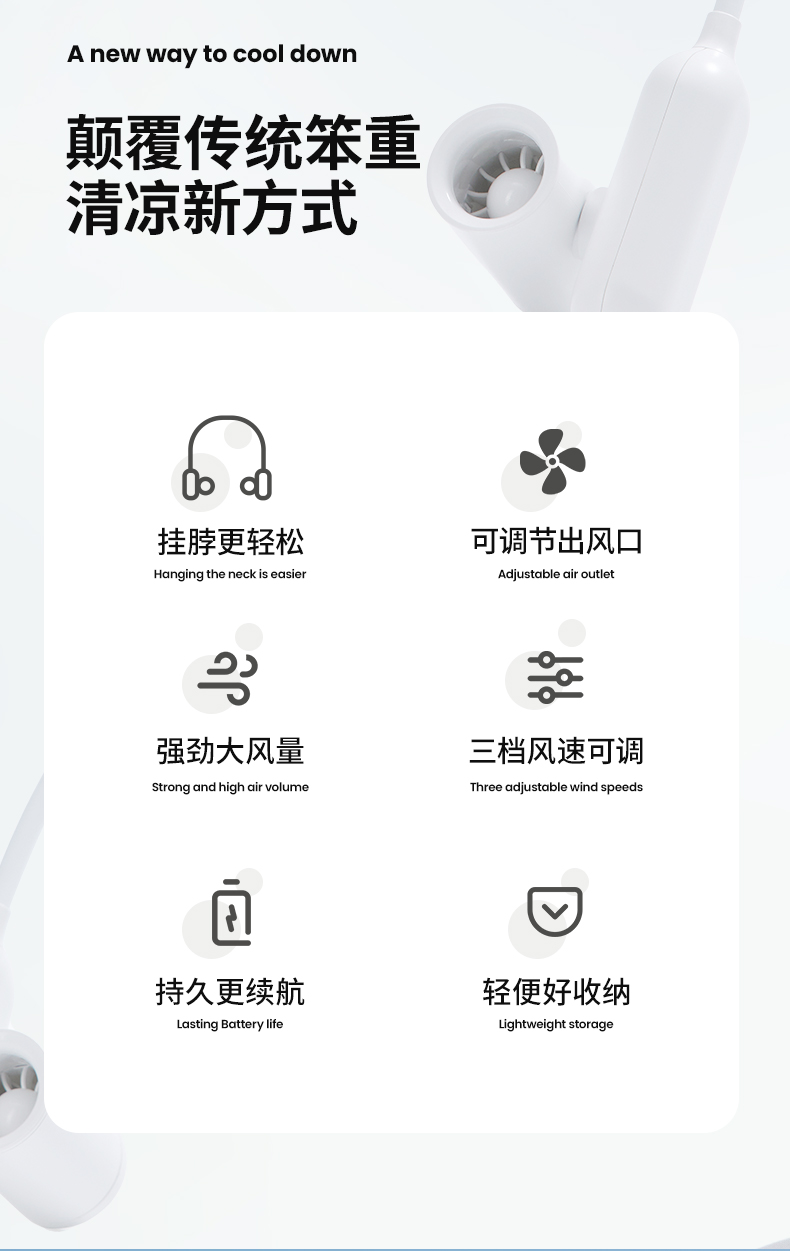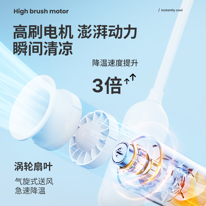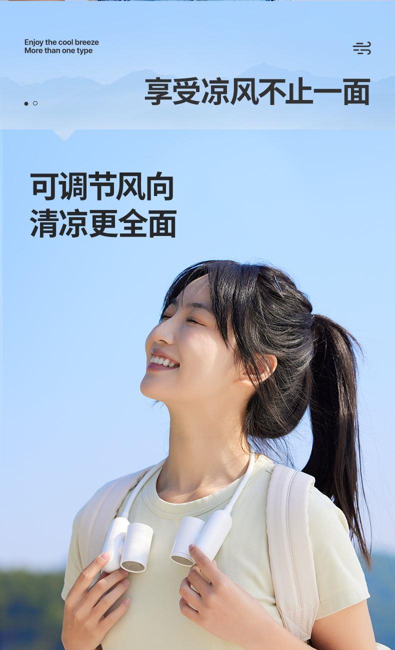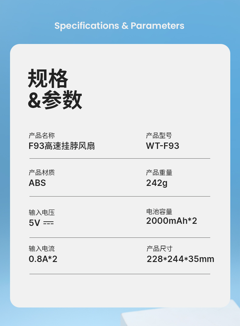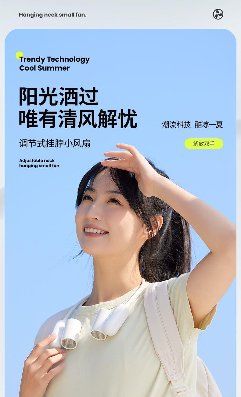 产品功能: *可调节出风口、强劲大风力 *三档风速、万向软管轻便好收纳 *2000毫安长续航、安全栅格 * 支持小批量定制LOGO 产品参数: *颜色:白色/蓝色 *材质:ABS *产品尺寸:228*244*35mm *彩盒尺寸:189*52*268mm *外箱尺寸:44.6*39*55.7cm *单个净重/毛重:242g/378g *整箱净重/毛重:12.1kg/12.9kg **电池容量:2000mAh