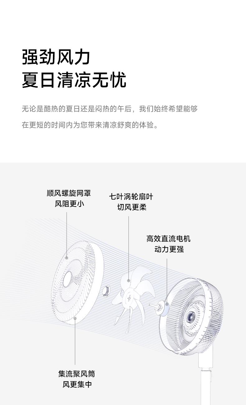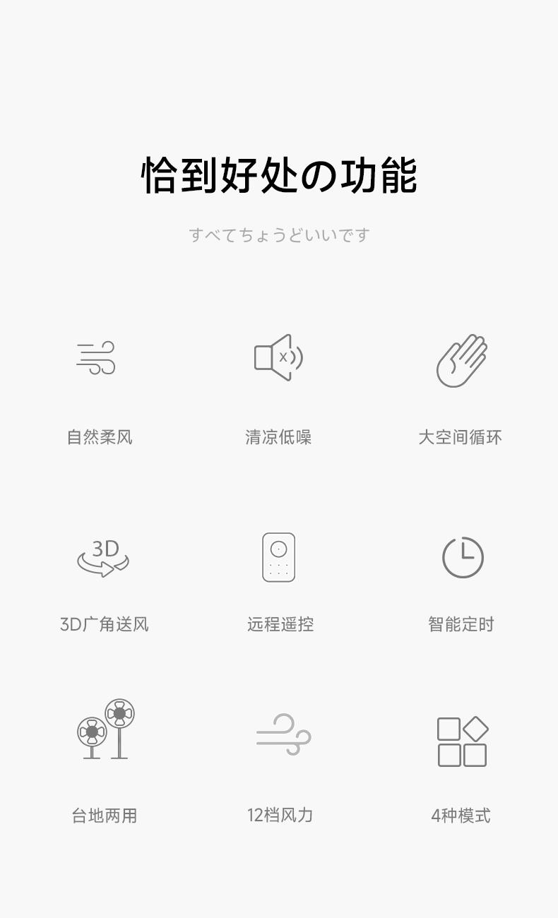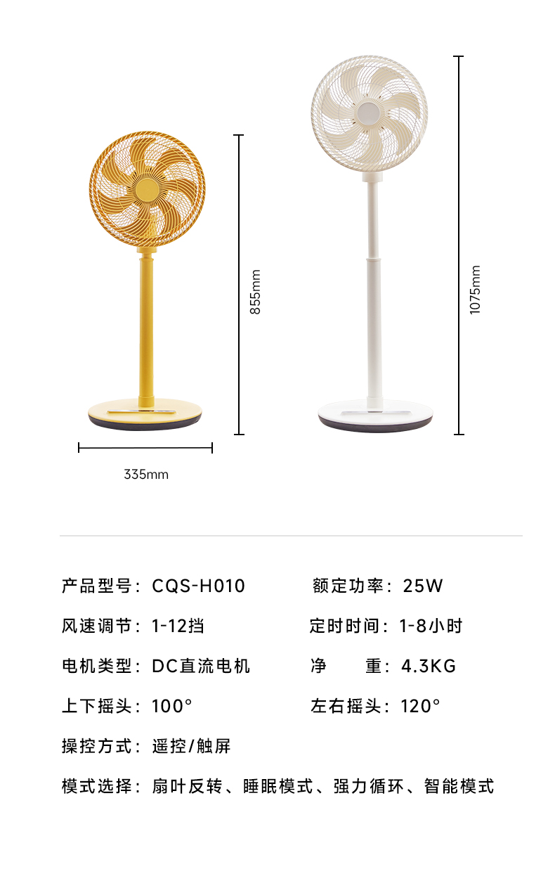 功率:25W 风速调节:1-12速(约280-940r/min) 模式:正常、空气循环、睡眠、自然、ECO五种模式风 86cm至108cm高度可调,适应多种高度需求 • 十二档风速调整,可触摸操作 • 八小时定时,可遥控远程 • 正常、空气循环、睡眠、自然、ECO五种风模式