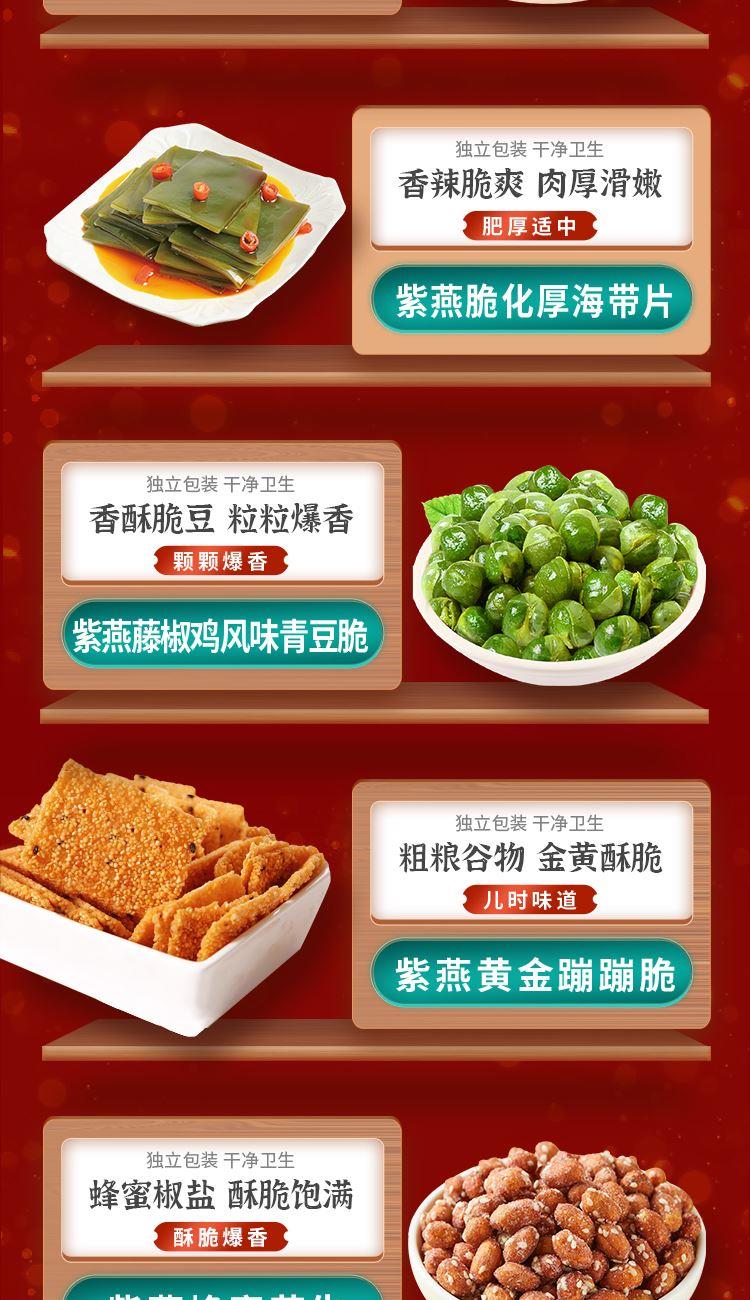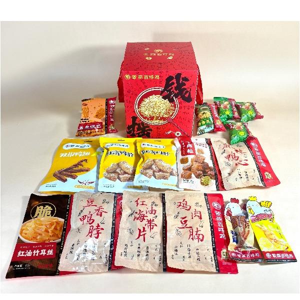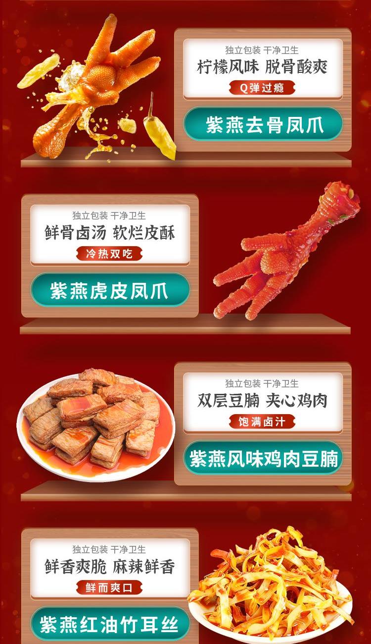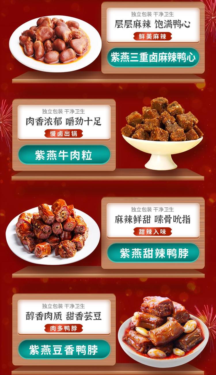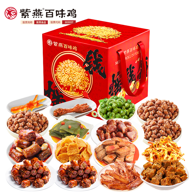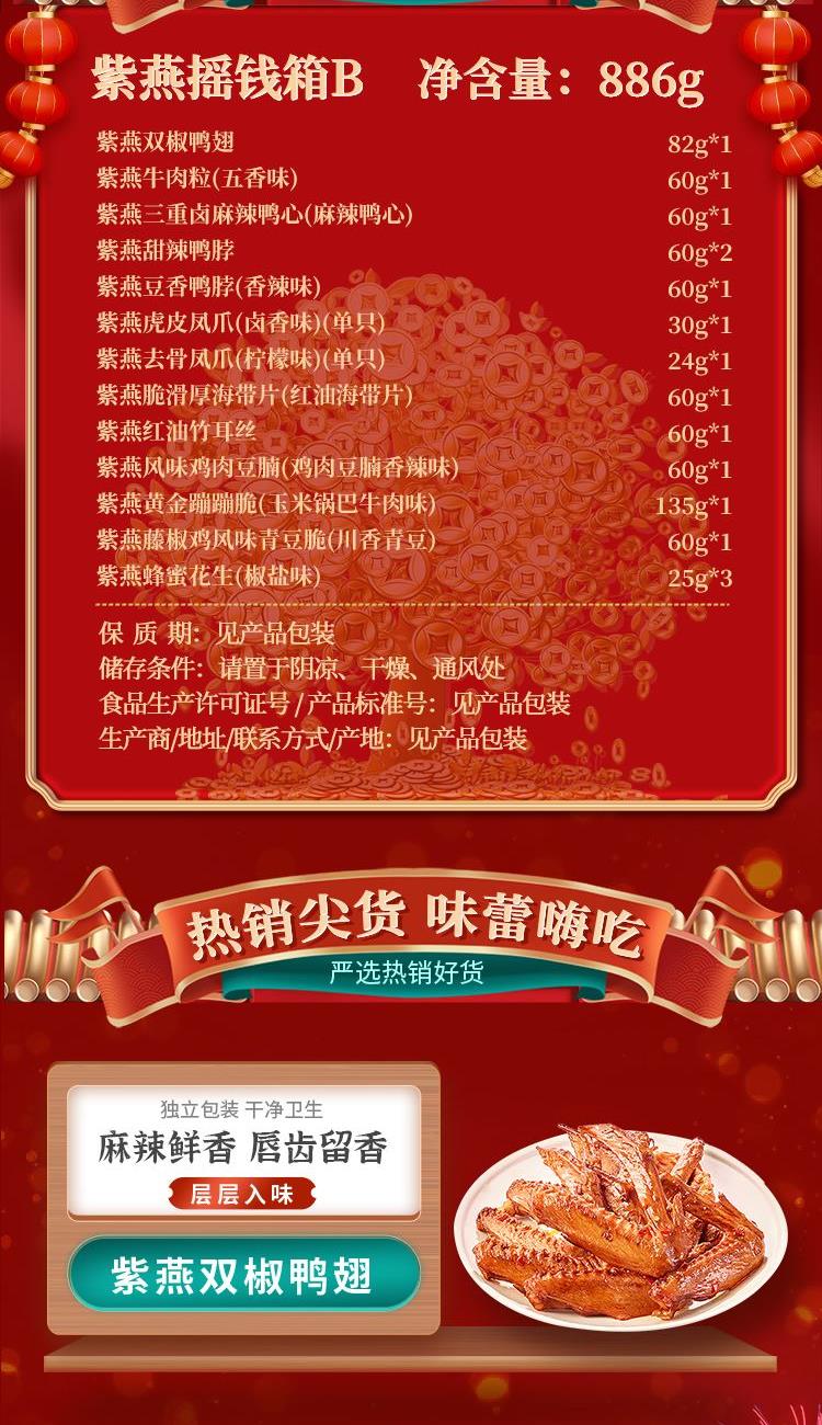 紫燕双椒鸭翅82g*1 紫燕牛肉粒(五香味)60g*1 紫燕三重卤麻辣鸭心(麻辣鸭心)60g*1 紫燕甜辣鸭脖60g*2 紫燕豆香鸭脖(香辣味)60g*1 紫燕虎皮凤爪(卤香味)(单只)30g*1 紫燕去骨凤爪(柠檬味)(单只)24g*1 紫燕脆滑厚海带片(红油海带片)60g*1 紫燕红油竹耳丝60g*1 紫燕风味鸡肉豆腩(鸡肉豆腩香辣味)60g*1 紫燕黄金蹦蹦脆(玉米锅巴牛肉味)135g*1 紫燕藤椒鸡风味青豆脆(川香青豆)60g*1 紫燕蜂蜜花生(椒盐味)25g*3 礼盒+组装+外盒