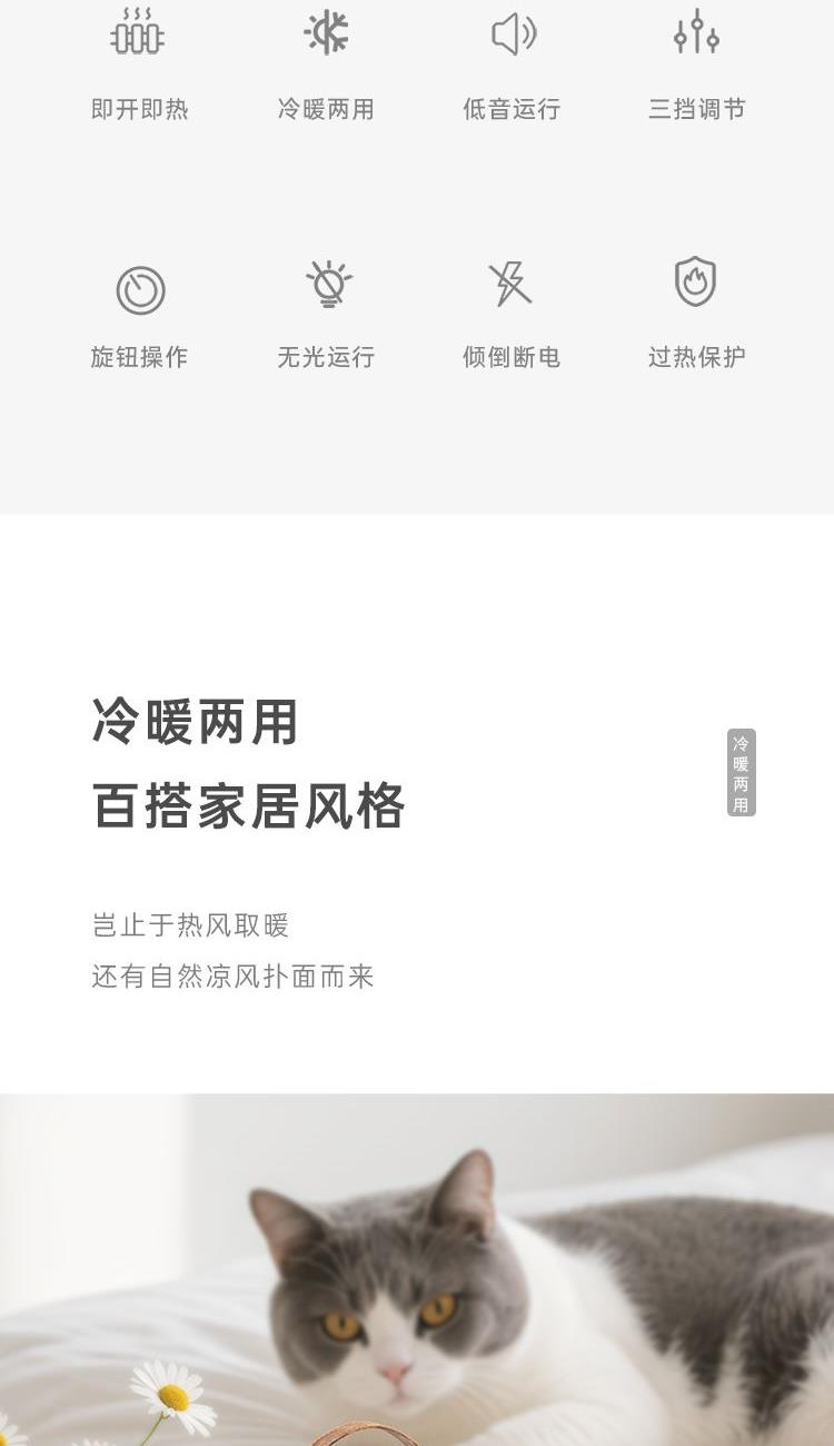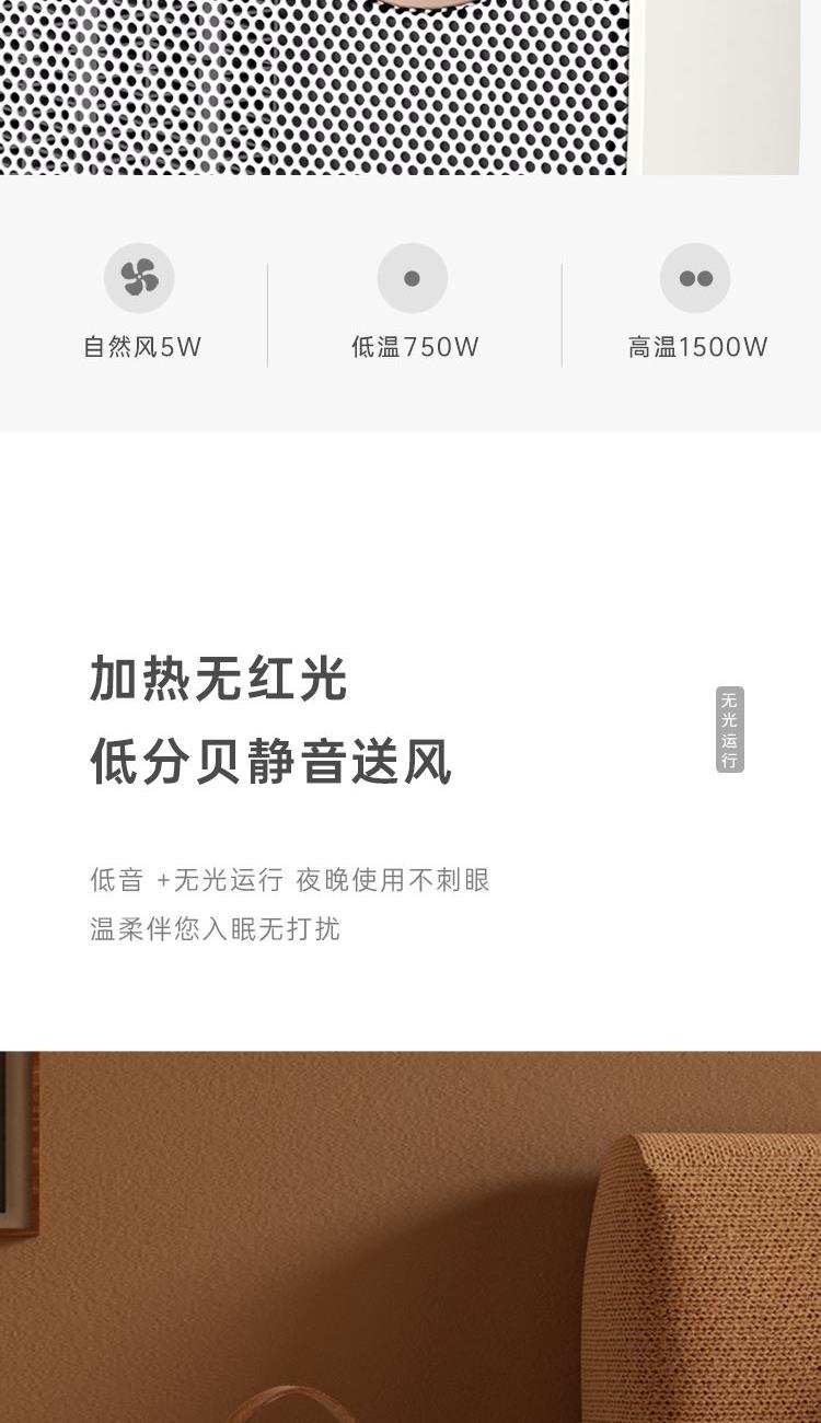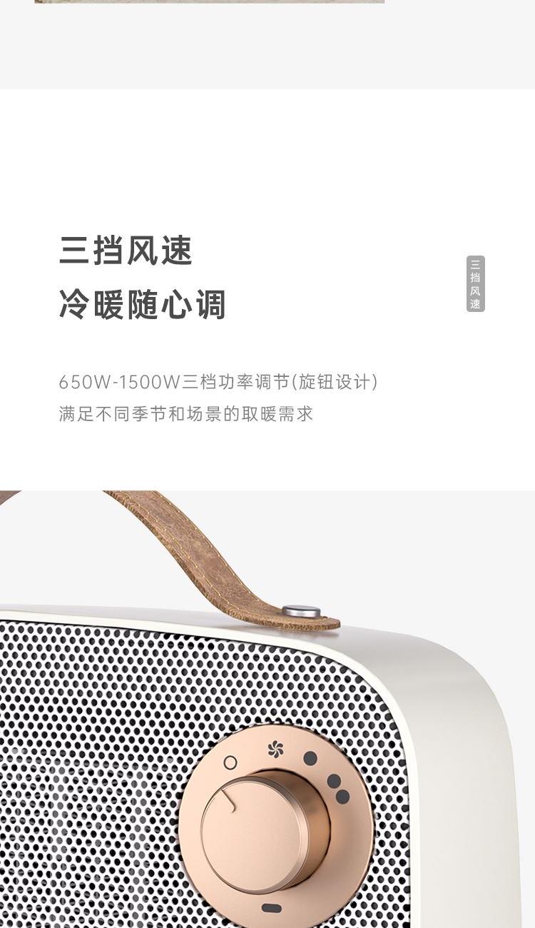 额定电压:220V-240V~ 额定频率:50Hz-60Hz 额定功率:650W-1500W 产品毛重:1.3Kg 产品颜色:米白色 包装清单:主机、说明书 主要材质:ABS 1.PTC陶瓷发热技术,即开热无需久等 2.精巧设计取暖器,便捷实用、百搭家居风格 3.三档调节,冷热两用,满足不同季节和场景的取暖需求 4.低音 + 无光运行,夜晚使用不刺眼,温暖伴您入眠无打扰 5.倾倒断电+机身阻燃材质隔热防烫+PTC陶瓷发热,三重安全防护
