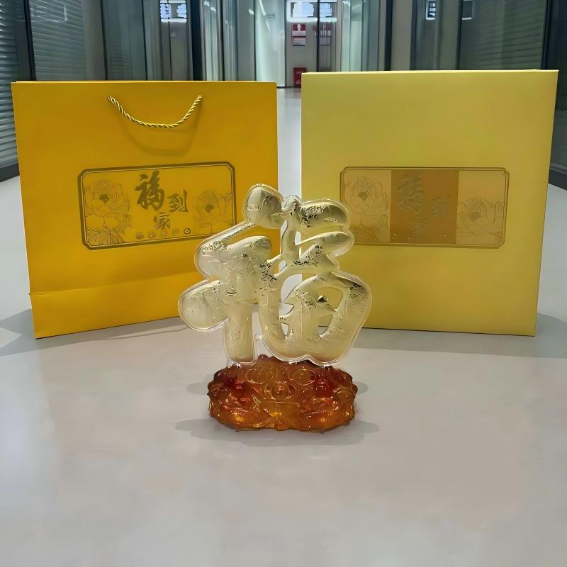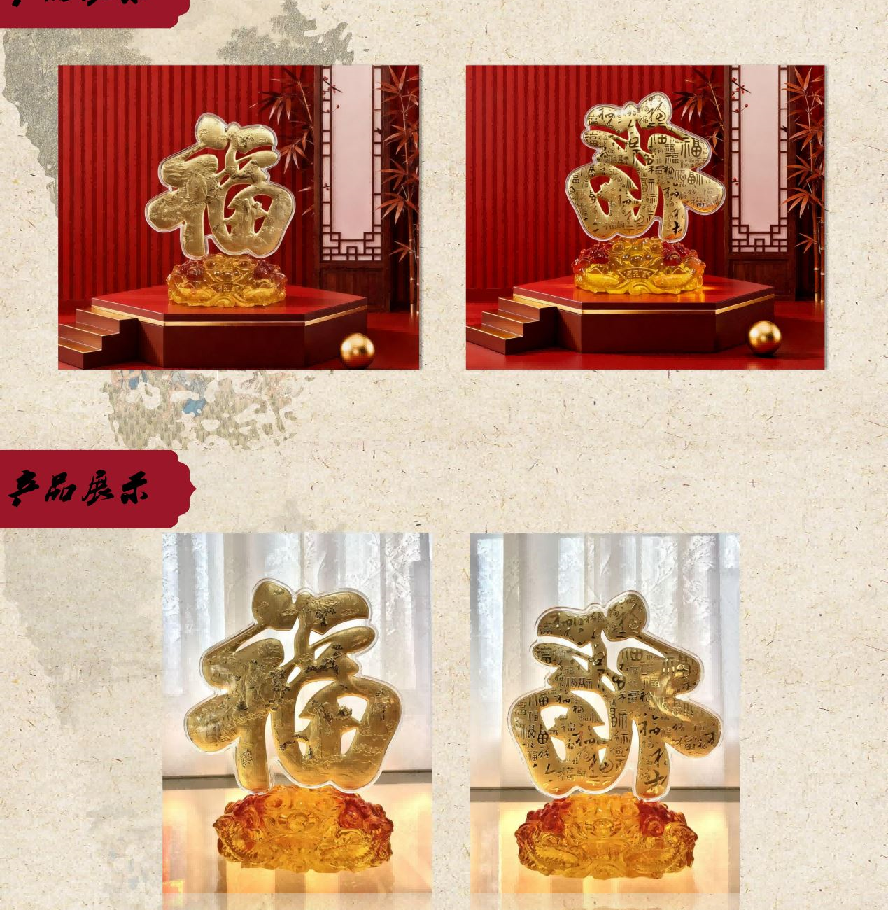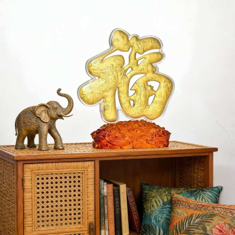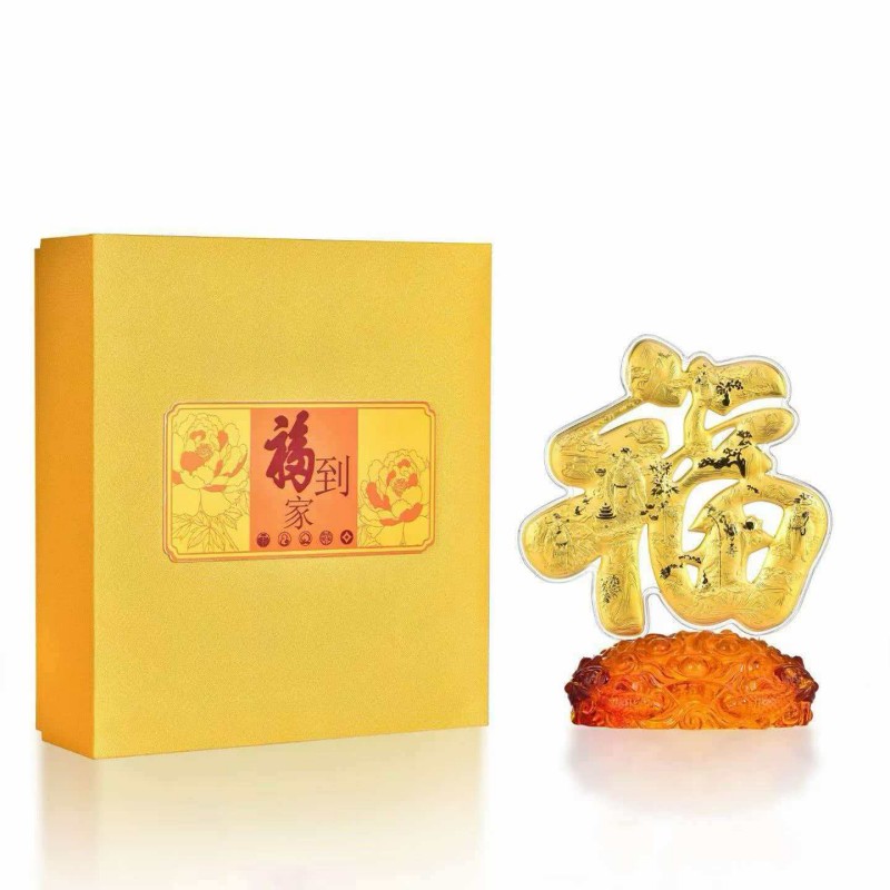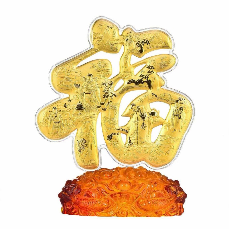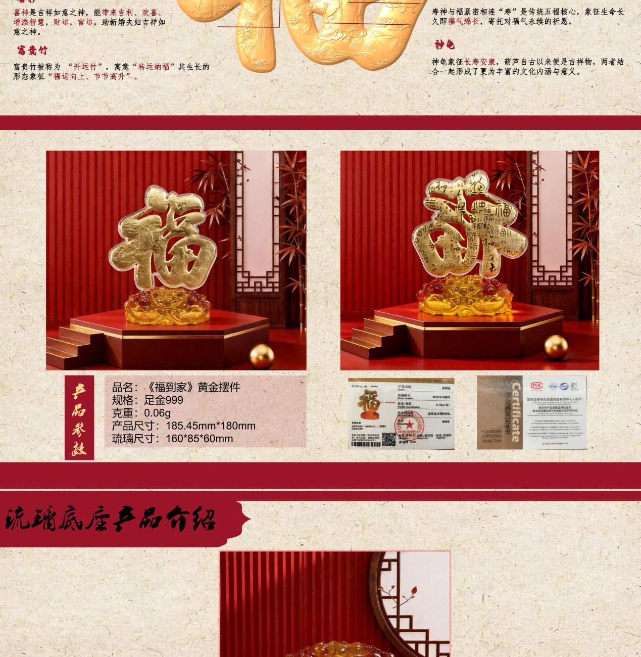 摆件规格:足金999克重:0.06g 产品尺寸:185.45mm*180mm 琉璃尺寸:160*85*60mm 0.06克足金999,采用立体浮雕工艺,金质纯净,细节精微。 “福”字融合传统吉祥图纹,象征福运临门、家业兴旺。琉璃底座饰以双鱼云纹,寓意财气绵延、年年有余。 家居陈列:客厅、书房,增添福运氛围。 商务礼赠:保险活动、企业庆典,传递祝福心意。 收藏赠礼:兼具文化价值与情感纪念意义。
