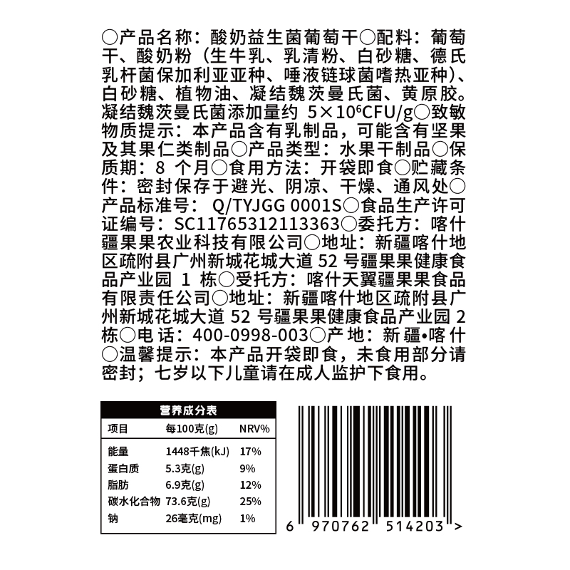 新疆玫瑰香葡萄干锁住花青素,益生菌酸奶涂层助攻肠道蠕动。0人工色素、0防腐剂,让贪吃变得理直气壮——毕竟这可是会微笑的养生方式!益生菌酸奶涂层×玫瑰香葡萄干,咬破酸奶外层的瞬间——冰凉丝滑的酸甜包裹着Q弹果肉,像在嘴里放了一场酸甜烟花!活性益生菌在舌尖跳踢踏舞,后调还有淡淡奶香回甘,好吃到忍不住舔手指~