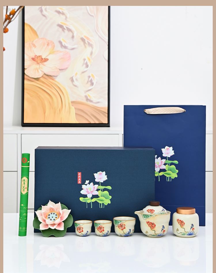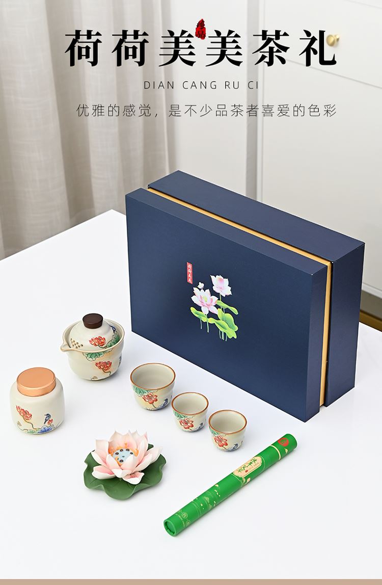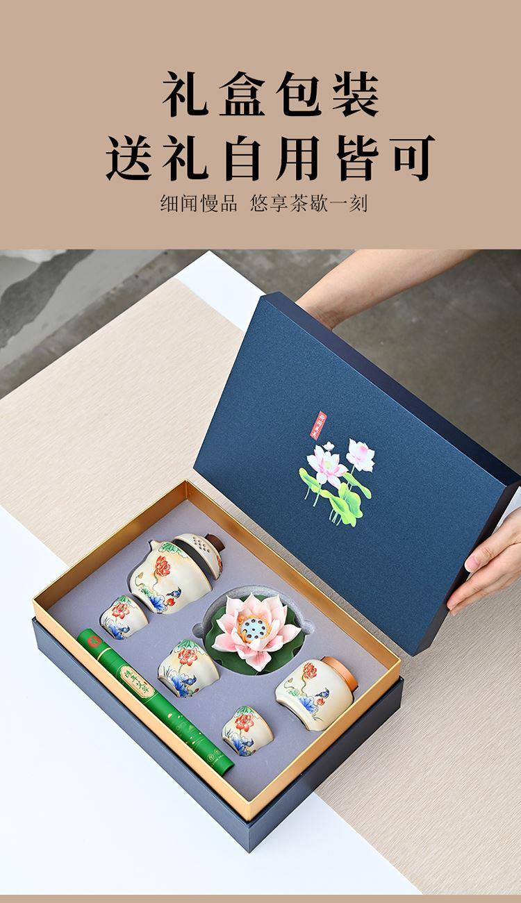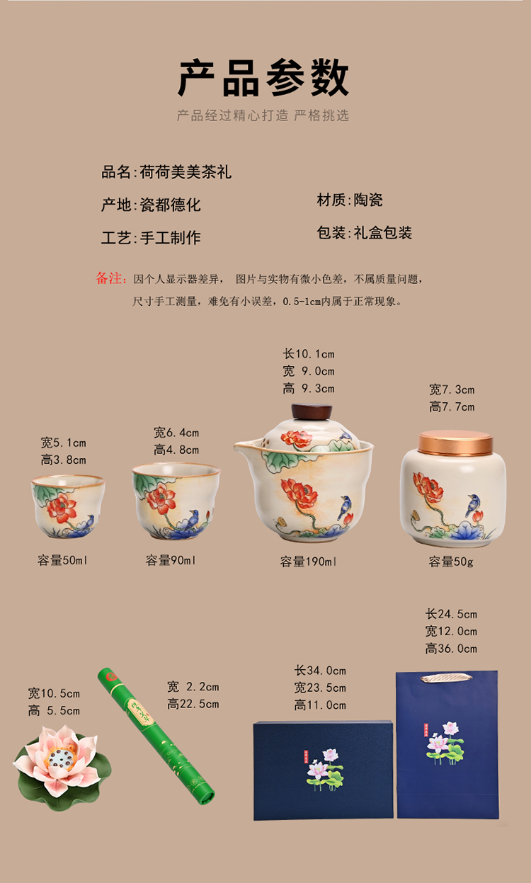 壶:10*9厘米190ml 品茗杯:6.4*4.8厘米90ml 茶叶罐:8**7厘米 礼盒:34*24*11厘米 精选高岭土等优质原料,经高温烧制而成,质地致密,气孔率小,吸水率低,不易吸附异味,清洗便捷.手工捏花,造型美丽,寓意美好,搭配礼盒包装,自用赠礼两宜。