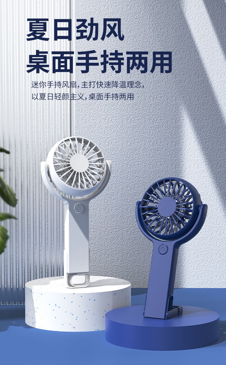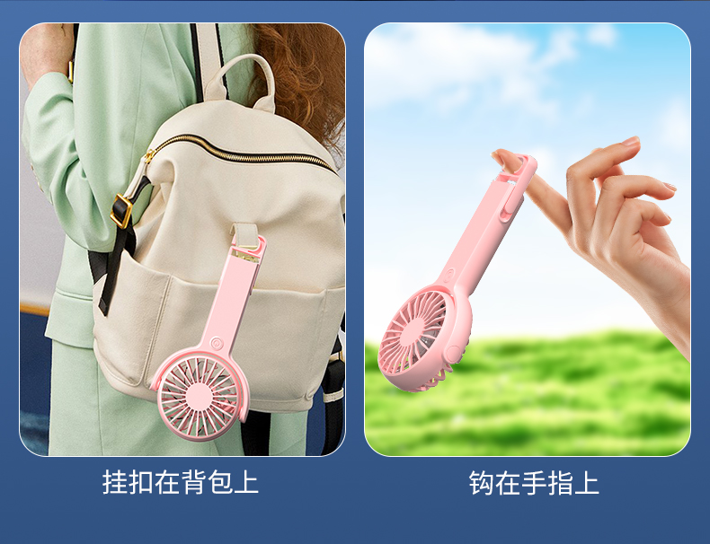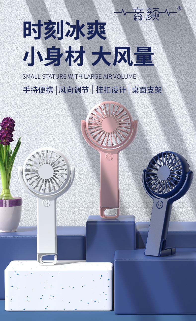 【推荐理由】: 精致小巧,方便携带 可挂背包,可立桌面 多场景 三档风速可调 可上下调节角度 颜色:白色 蓝色 粉色 尺寸:185*91*30mm 容量:800mAh 包装:彩盒包装