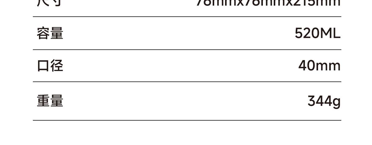 1、容量:520ml | 净重:344g | 口径:40mm 2、材质:316不锈钢(内胆)304不锈钢(外壳) PP(杯盖) 3、产品尺寸:76mm*76mm*215mm 4、彩盒尺寸:80mm*80mm*223mm 5、执行标准:GB/T 29606-2013《不锈钢真空杯》