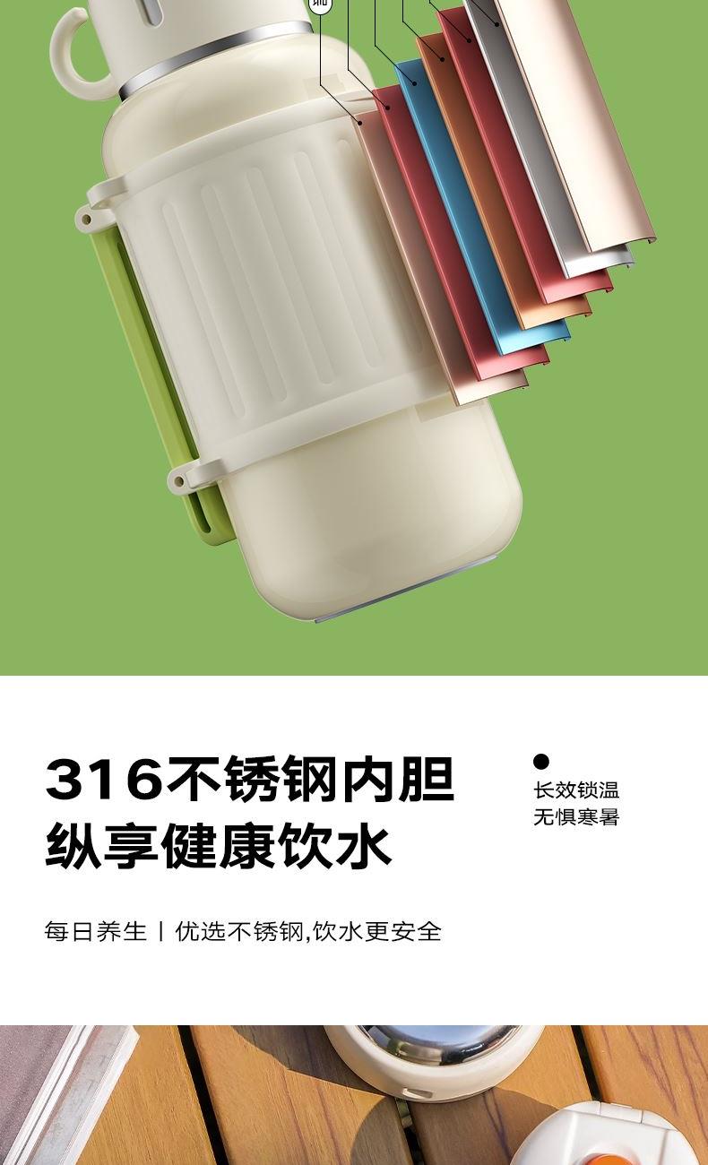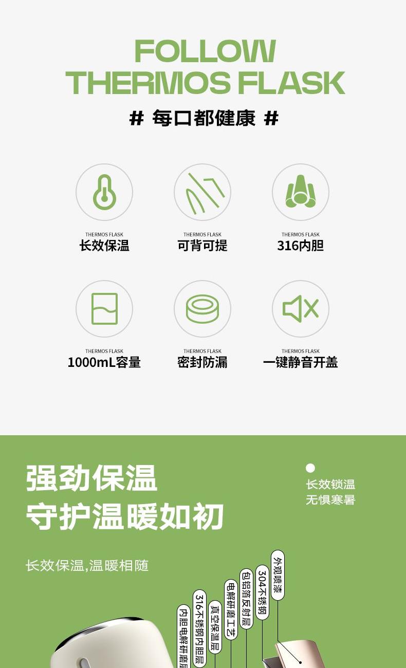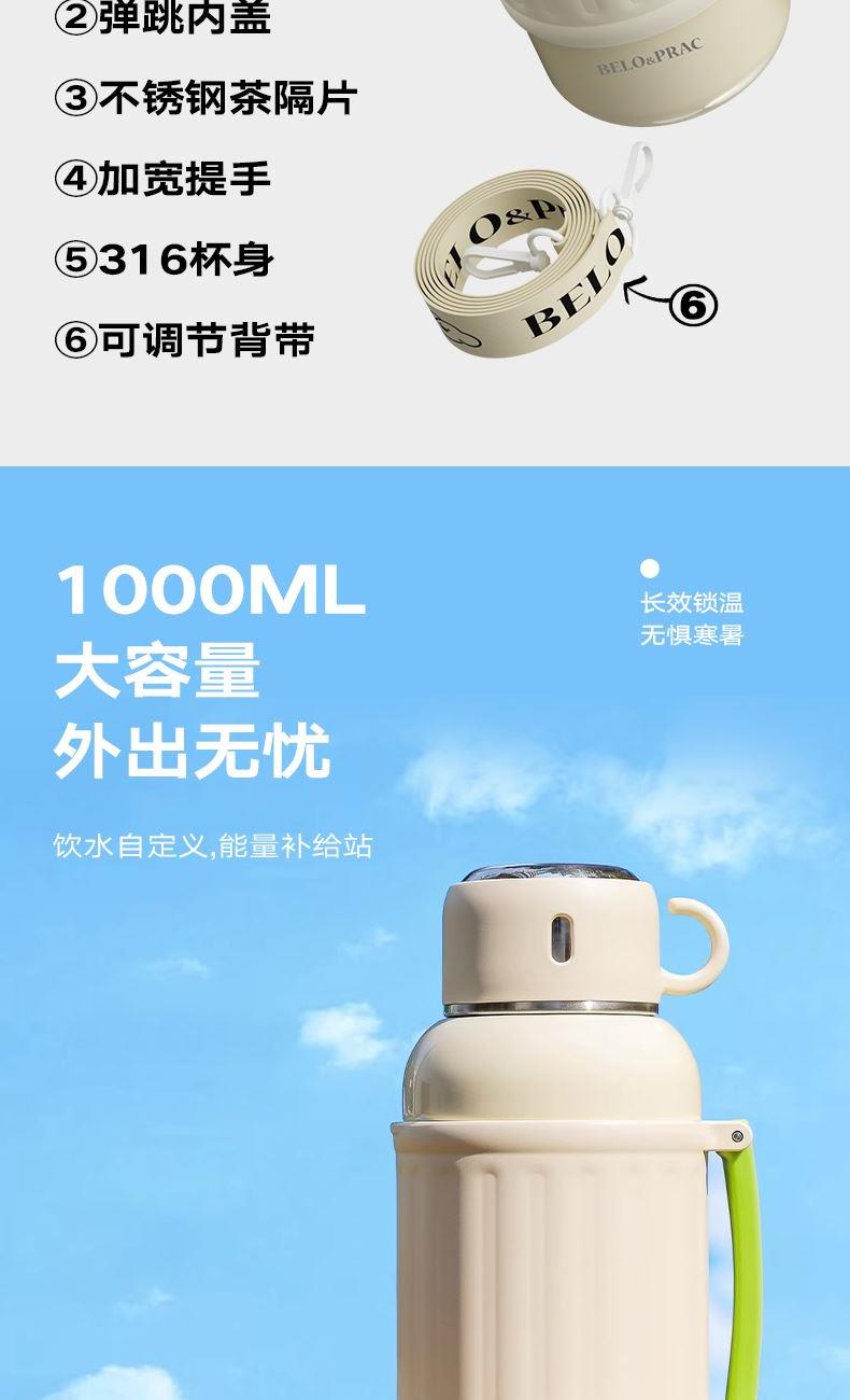 有颜有料,锁温实力派,双效长时间锁温保冷 316不锈钢内胆,健康饮水 双层杯盖,无需自配水杯,既是盖又是杯 一键开启直饮弹跳内盖+不锈钢滤网 1000ML大容量,外出无忧 加宽便携提手,握感舒适,配备肩带,肩带可调节 食品级硅胶密封圈,密封防漏 产品容量:1000ml 产品材质:316不锈钢 彩盒尺寸: 11.5*10.6*24.2cm 外箱尺寸:55*36*50.5cm 产地:浙江 执行标准:GB4806.9-2023