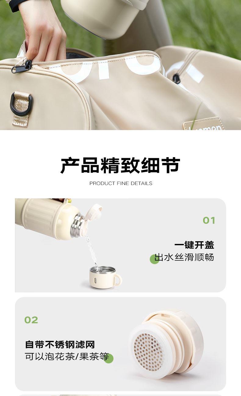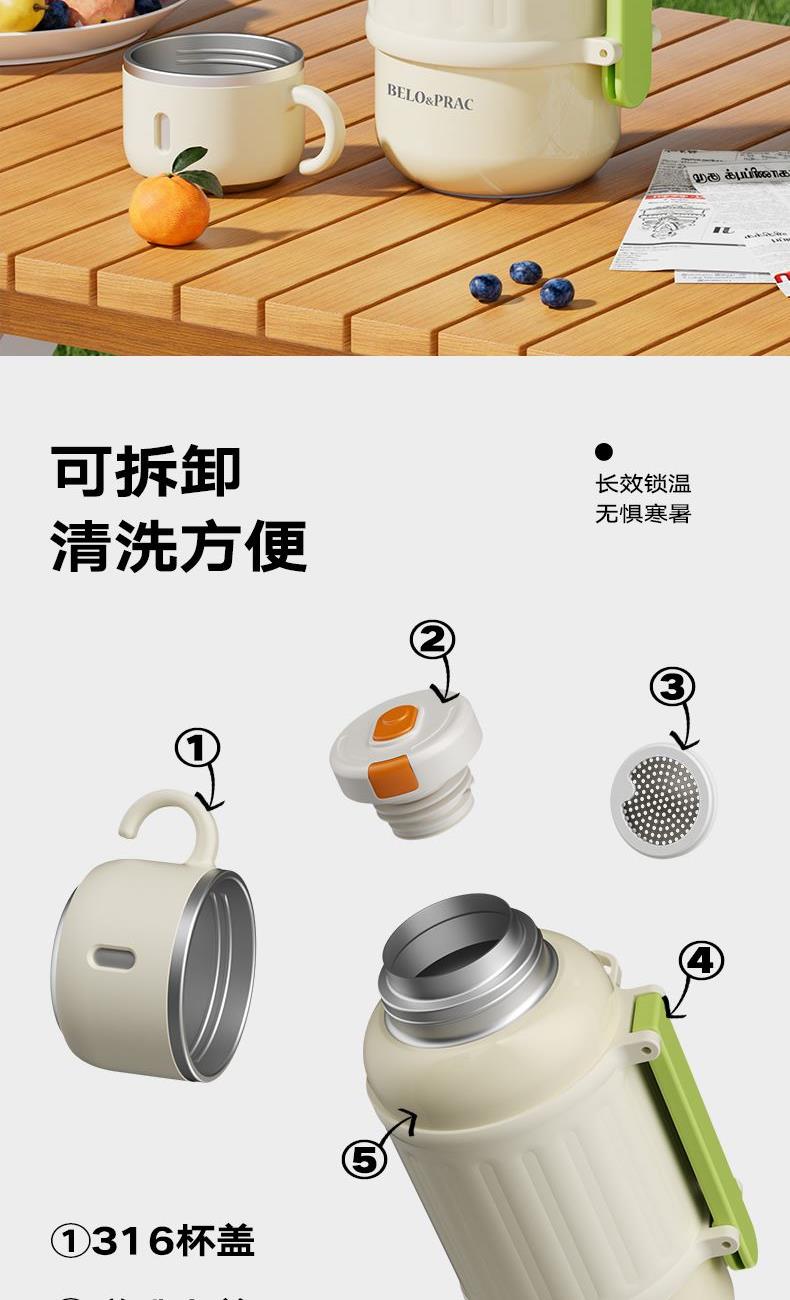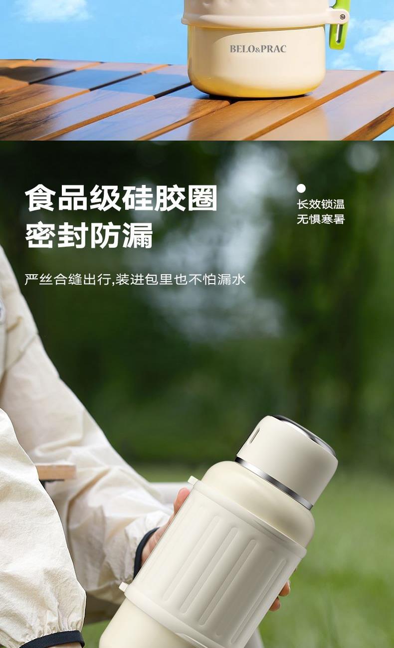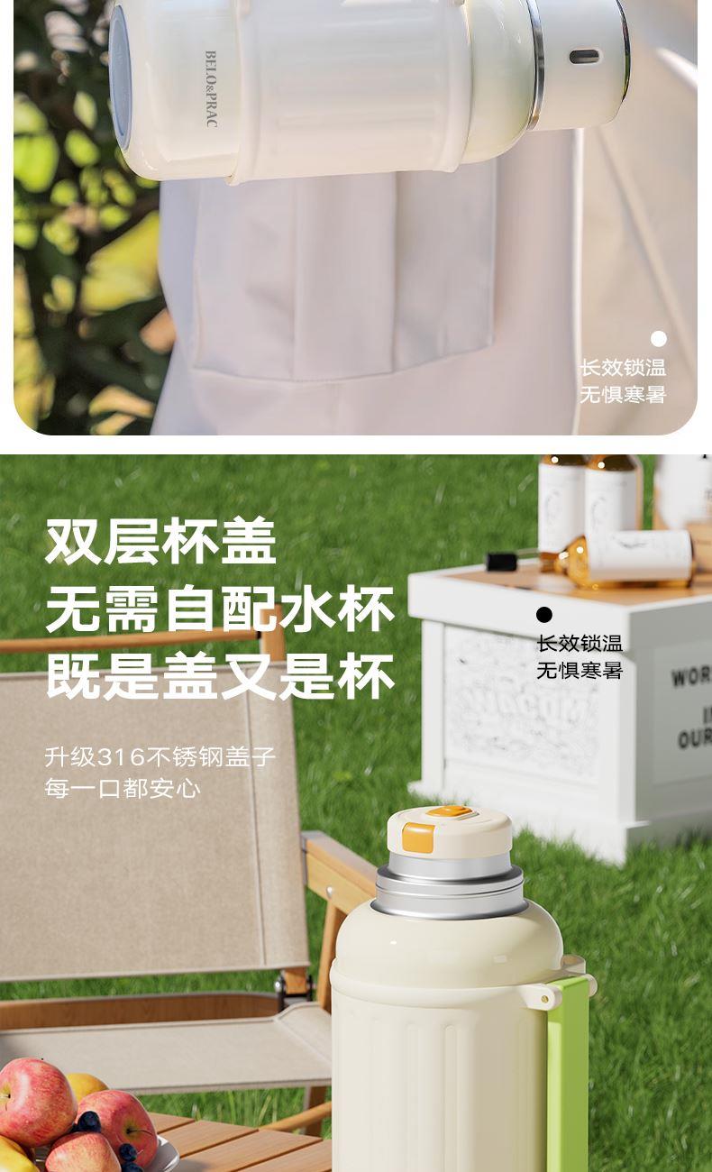 有颜有料,锁温实力派,双效长时间锁温保冷 316不锈钢内胆,健康饮水 双层杯盖,无需自配水杯,既是盖又是杯 一键开启直饮弹跳内盖+不锈钢滤网 1000ML大容量,外出无忧 加宽便携提手,握感舒适,配备肩带,肩带可调节 食品级硅胶密封圈,密封防漏 产品容量:1000ml 产品材质:316不锈钢 彩盒尺寸: 11.5*10.6*24.2cm 外箱尺寸:55*36*50.5cm 产地:浙江 执行标准:GB4806.9-2023