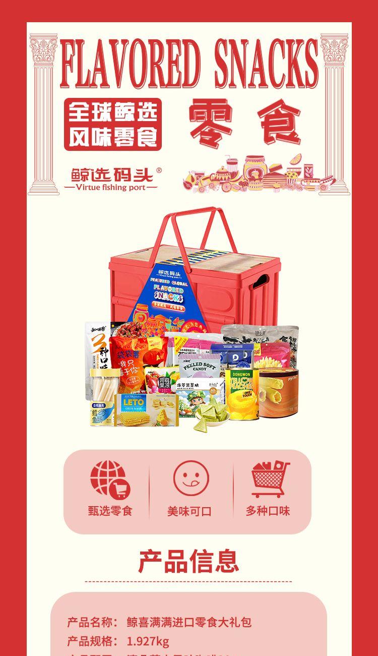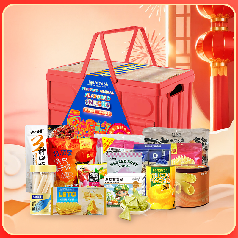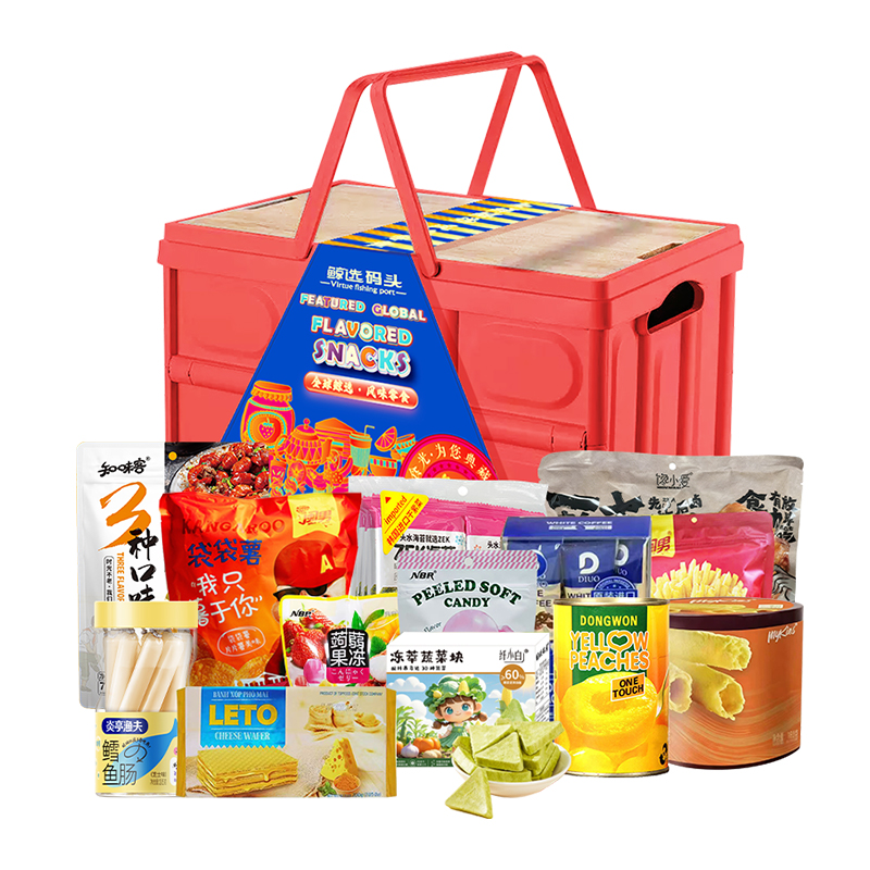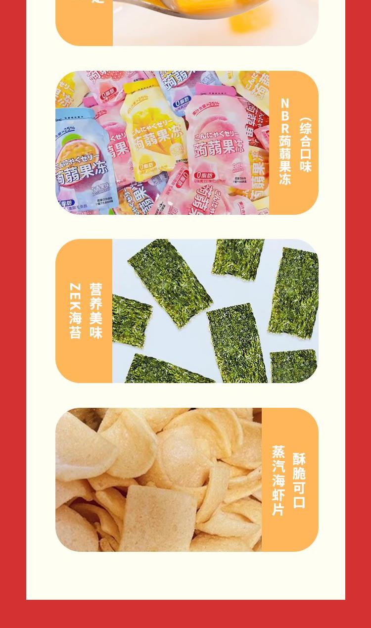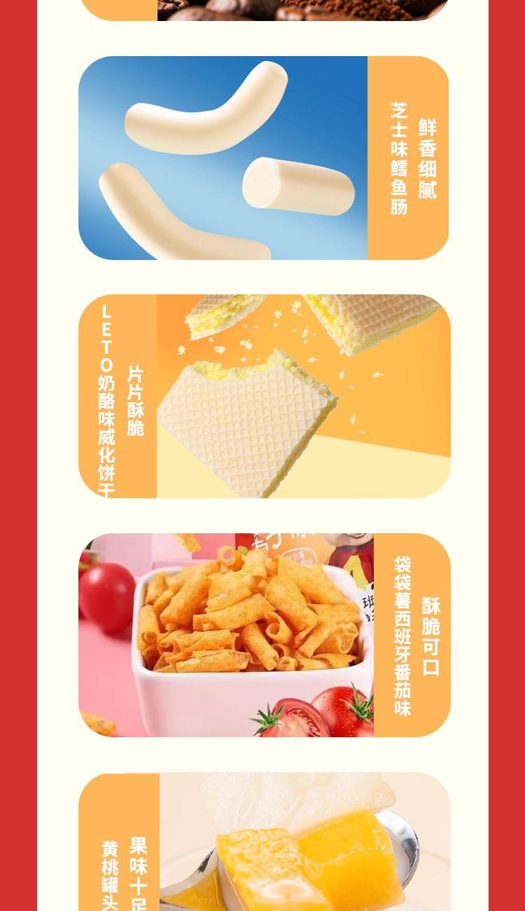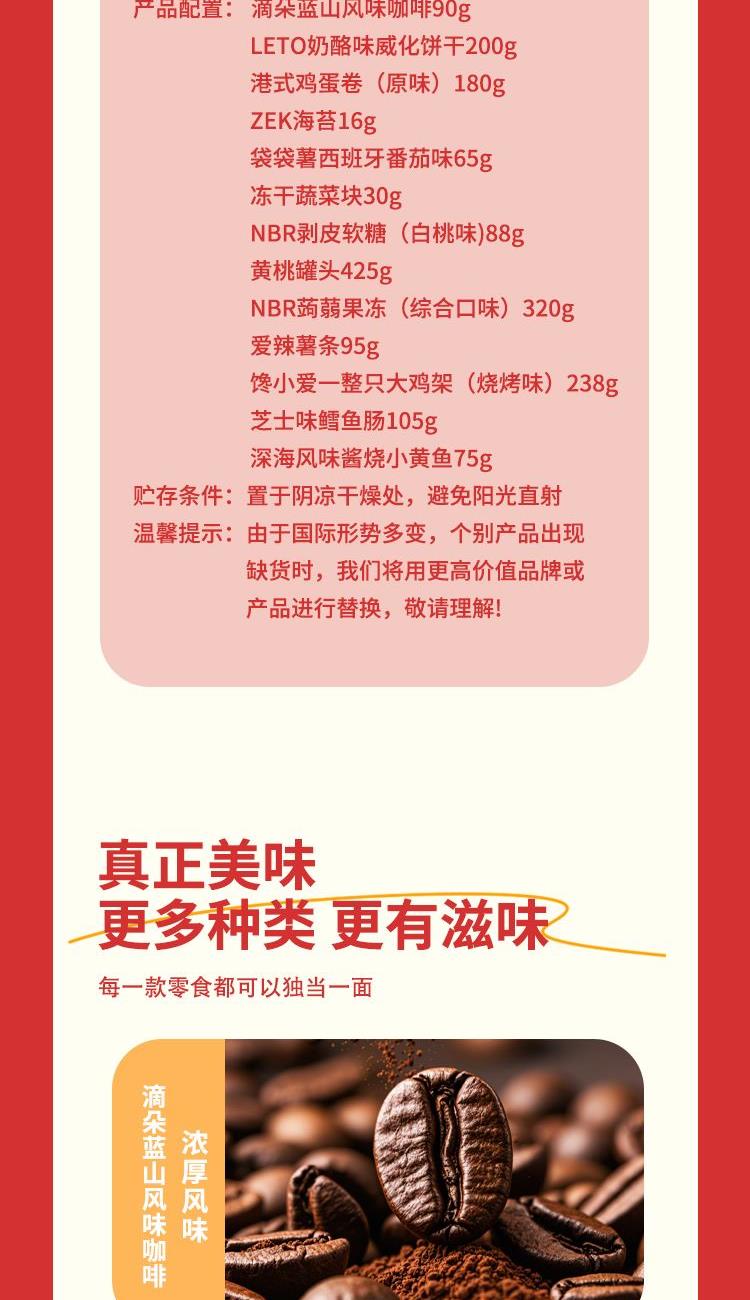 配置: 滴朵蓝山风味咖啡90g LETO奶酪味威化饼干200g 港式鸡蛋卷(原味)180g ZEK海苔16g 袋袋薯西班牙番茄味65g 冻干蔬菜块30g NBR剥皮软糖(白桃味)88g 黄桃罐头425g NBR蒟蒻果冻(综合口味)320g 爱辣薯条95g 馋小爱一整只大鸡架(烧烤味)238g 芝士味鳕鱼肠105g 深海风味酱烧小黄鱼75g