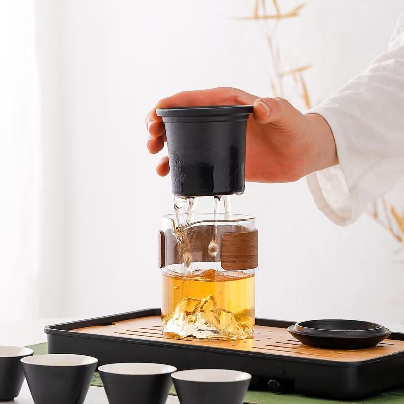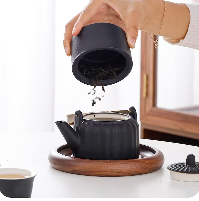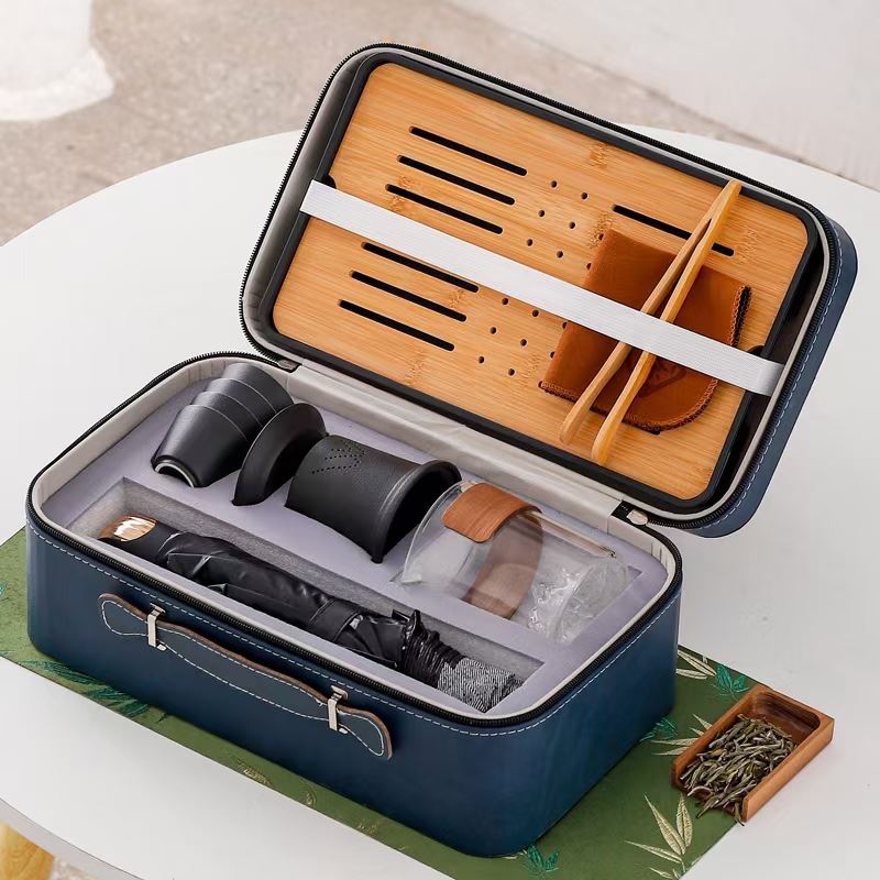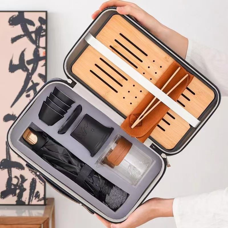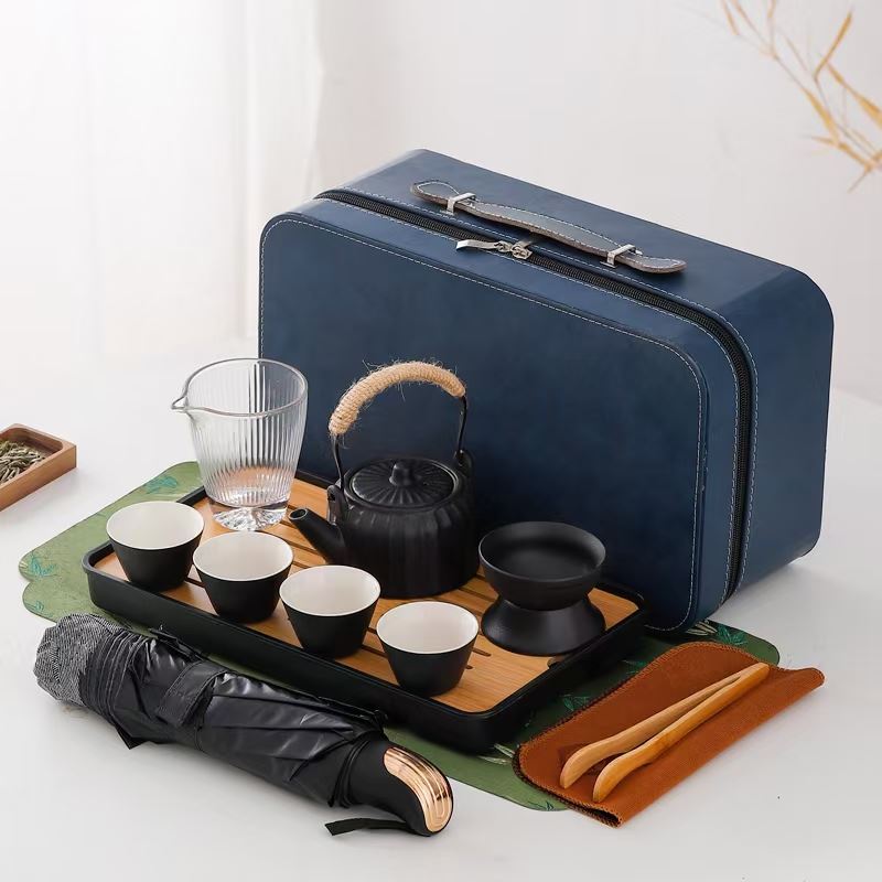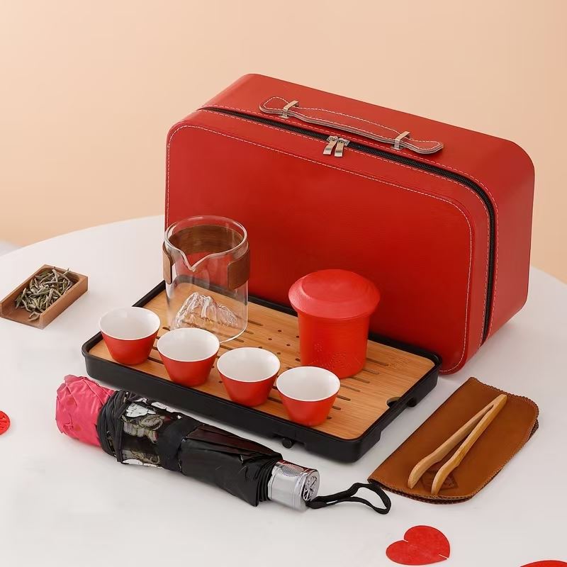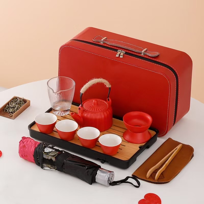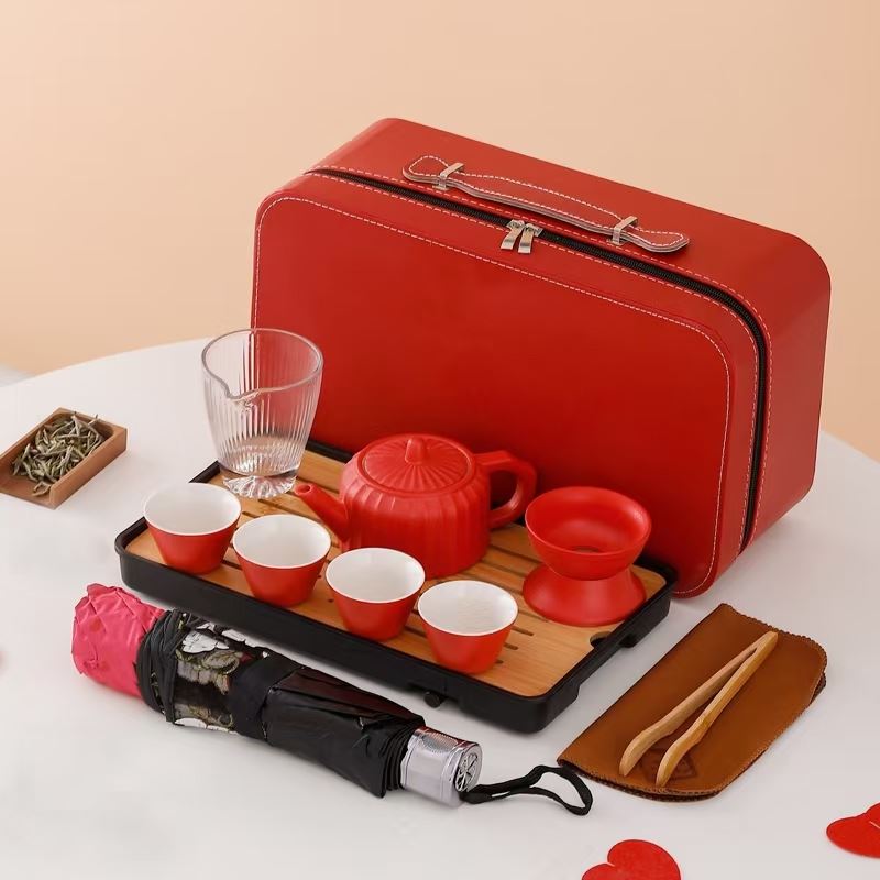 配制:1壶4杯 1雨伞 1玻璃公道杯 1茶托茶漏 1茶盘 1旅行包 1茶巾茶夹 规格:茶壶:12*H13cm 茶杯:直径5.6cm*H2.8cm 茶盘:32*18.5cm 材质:粗陶 玻璃 实木茶盘 推荐说明:喜庆实用性商务套装,简约粗陶风,红色,黑色旅行茶具,搭配实用雨伞,一应俱全。双层茶盘,方便实用。