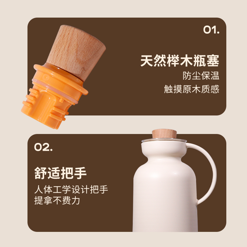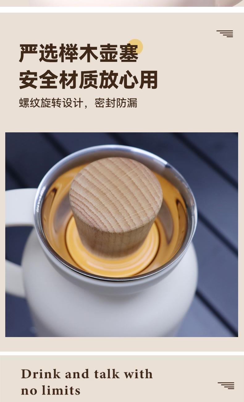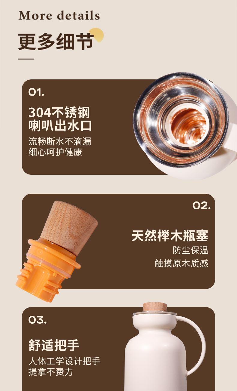 304不锈钢喇叭出水口、流畅断水不滴漏、天然榉木瓶塞、防尘保温,触摸原木质感。