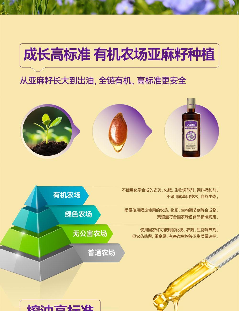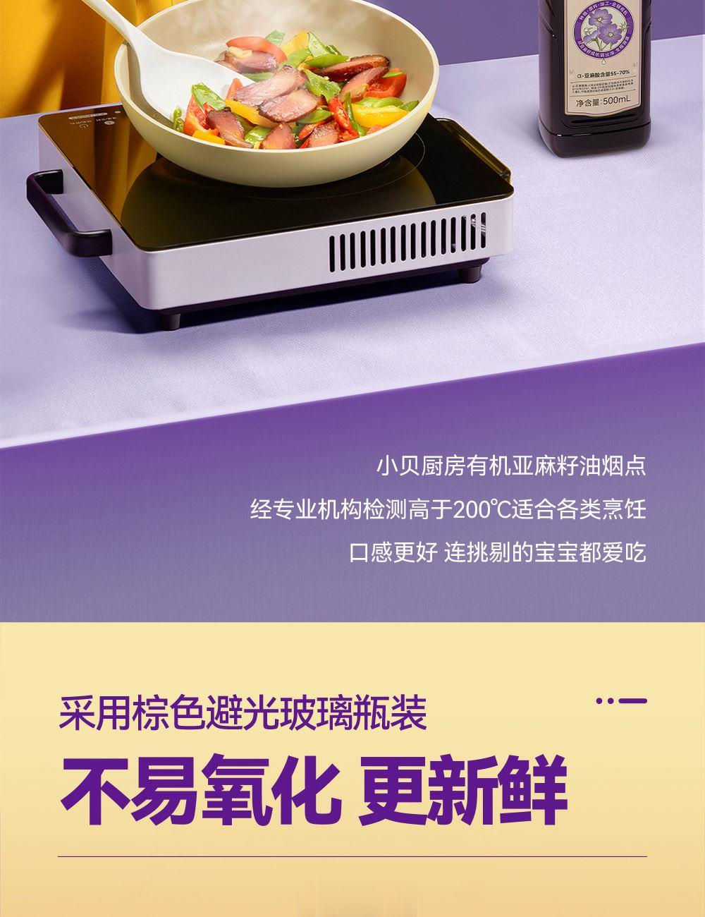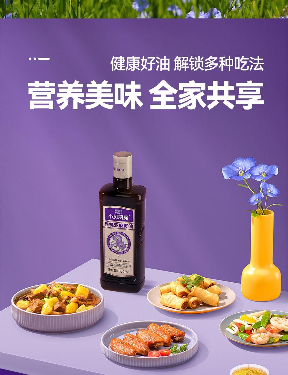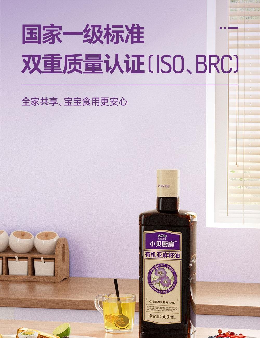 小贝厨房有机亚麻籽油 容量:500ml*2 甄选进口核心产区有机亚麻籽,从亚麻籽成长到出油,全链有机 中国、欧盟、美国的三重有机认证 α-亚麻酸>55% ,更高α-亚麻酸含量的有机亚麻籽油 采用0.5μm级过滤,高标准 去苦留香,口感更好 通过15项欧盟标准检测