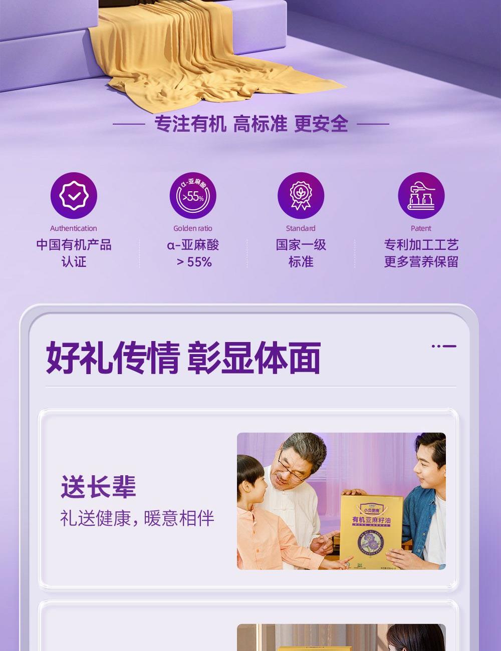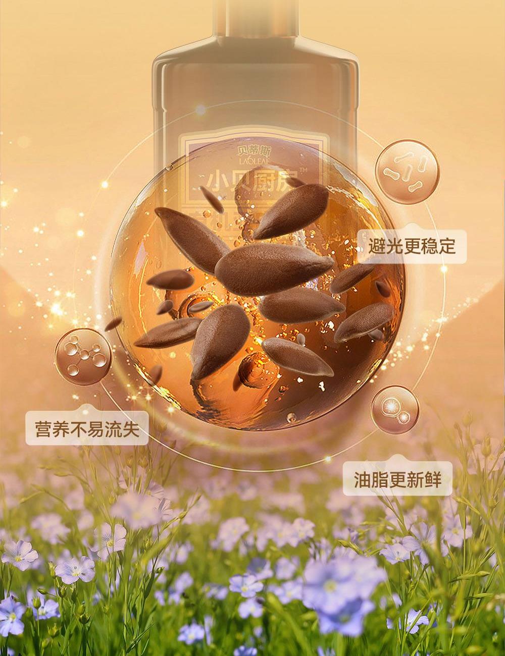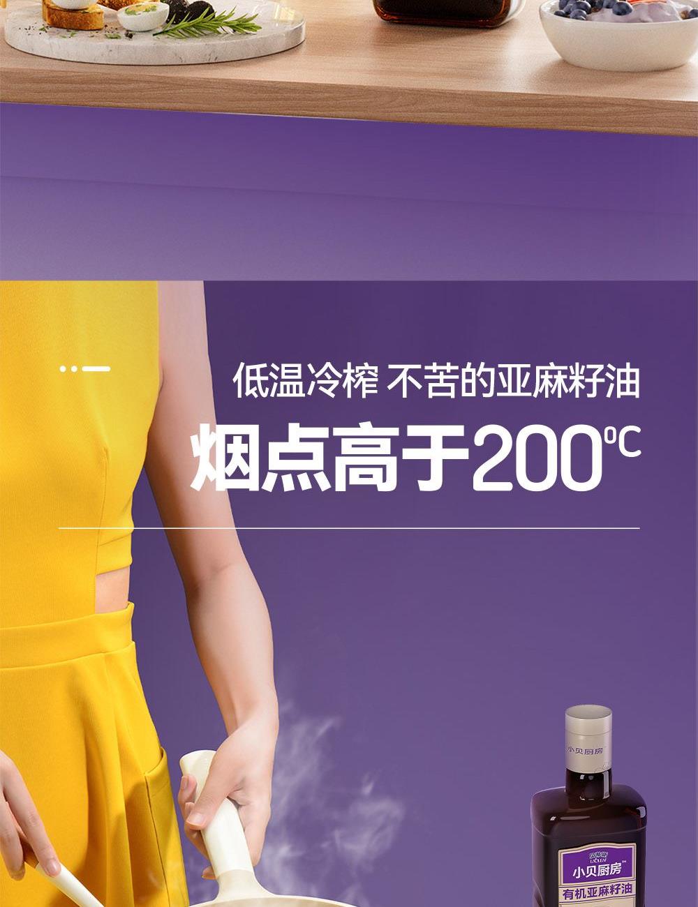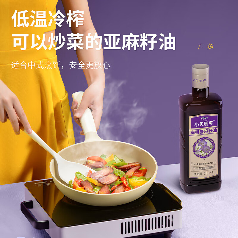 小贝厨房有机亚麻籽油 容量:500ml*2 甄选进口核心产区有机亚麻籽,从亚麻籽成长到出油,全链有机 中国、欧盟、美国的三重有机认证 α-亚麻酸>55% ,更高α-亚麻酸含量的有机亚麻籽油 采用0.5μm级过滤,高标准 去苦留香,口感更好 通过15项欧盟标准检测