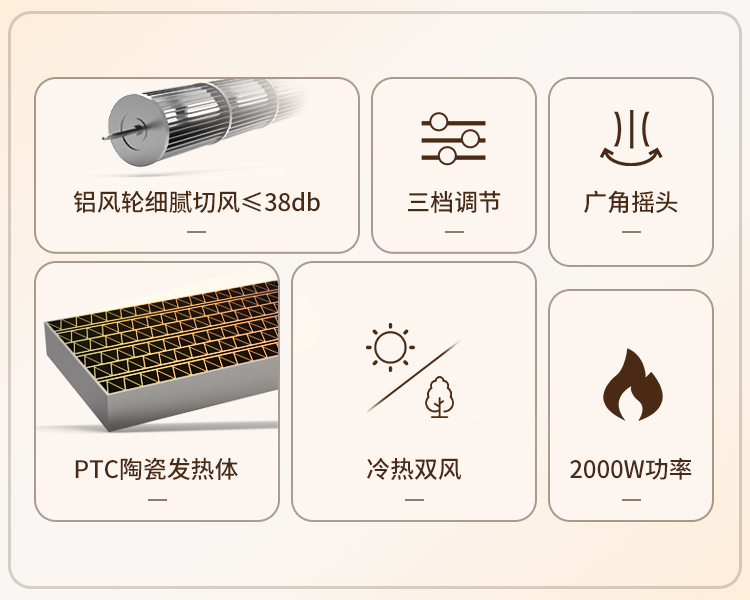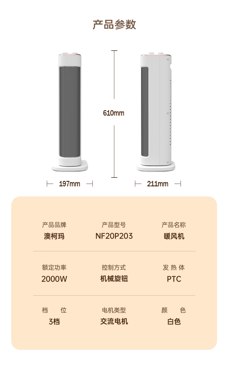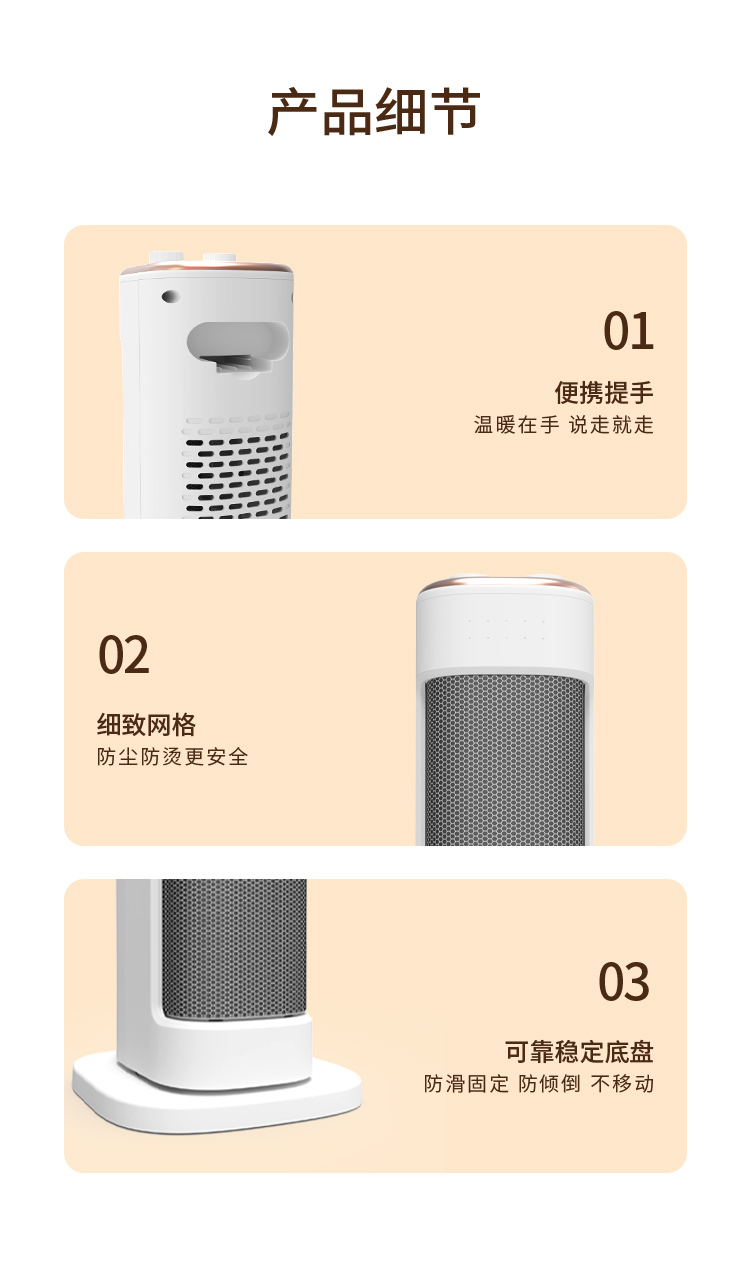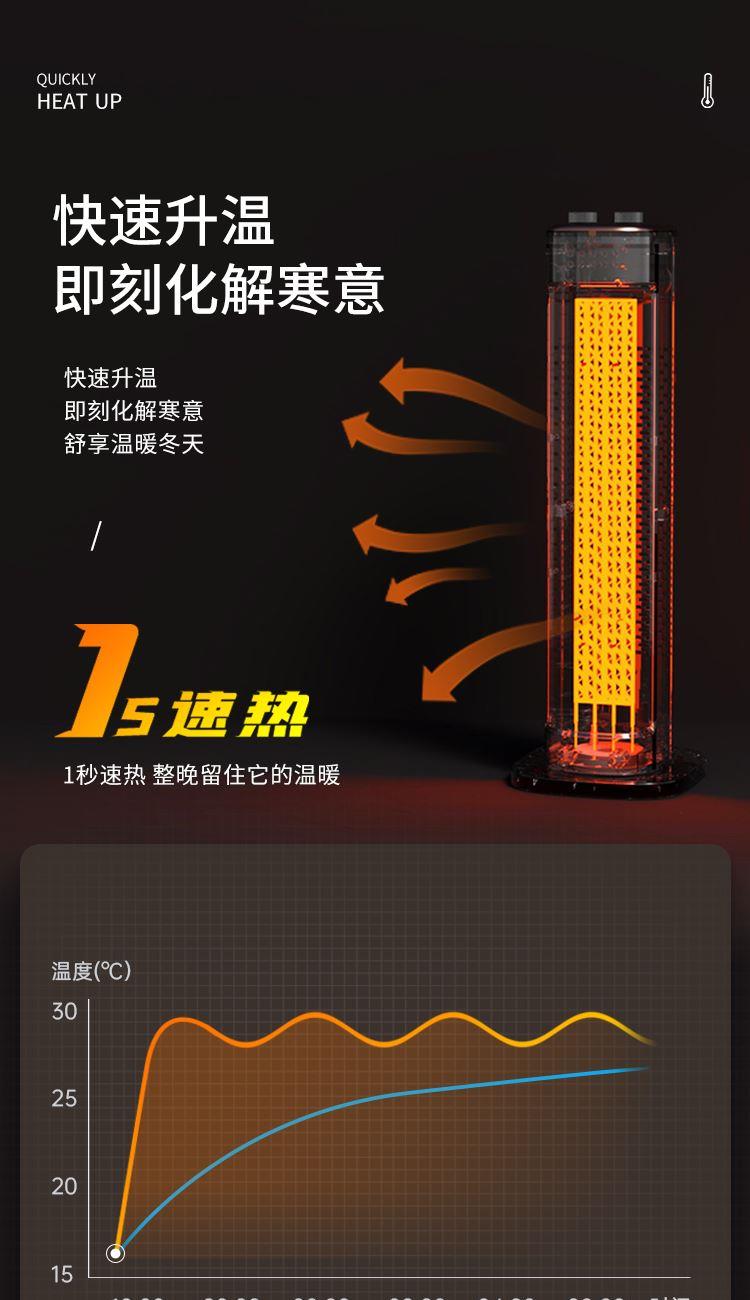 适用面积:21-25㎡ 加热方式:陶瓷加热 档位:3档 额定功率:2000W 额定电压:220V 档位2+1调控,双模式冬暖夏凉 1s速热,即刻化解寒意 80度广域送暖,整屋暖流分布更快更均匀 倾倒秒断电,过热断电保护,阻燃外壳材料 ptc发热体无明显亮光,轻音低噪,安睡整晚