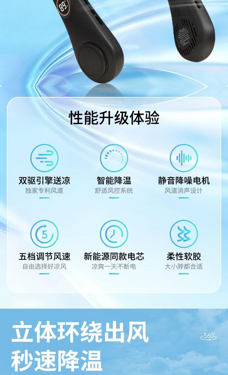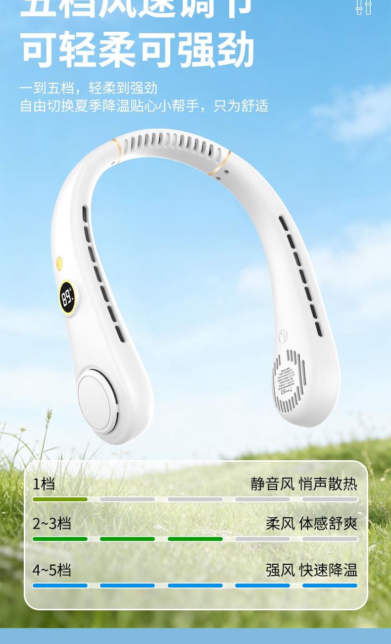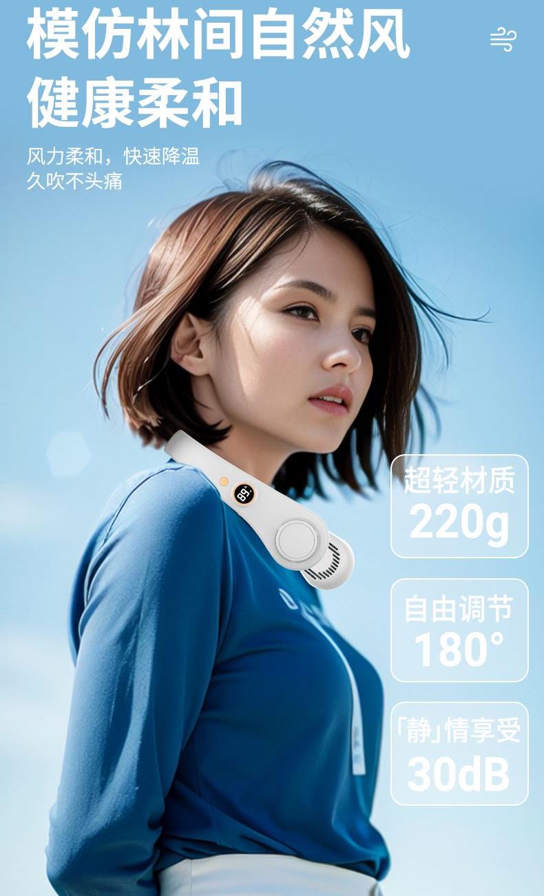 产品材料:环保ABS+硅胶 马达:有刷静音(双马达) 主板:双层保护(过充过放) 输入:DC5V 转速:8000次/1分钟 电池:18650 机子重量:220G 输出:4W 粉色深蓝色绿色 秒速降温 + 环绕送风:开机即享澎湃凉意,气流集中,环绕式清凉如随身空调 智能温控调风:实时感应环境与体表温度,自动调节风速,保持舒适体感 5 档风速:柔风 — 劲风全覆盖,办公、通勤、运动、高温场景都适配 超静音低噪:静音电机 + 消声风道,低至 25 分贝,工作休息不打扰 亲肤舒适挂脖:柔性软胶贴合颈部,可调节角度,久戴无压迫感 长续航不断电:新能源电芯,一档续航 24 小时,续航 8 小时 + 无叶设计更安全:送风均匀,不搅头发,使用更放心