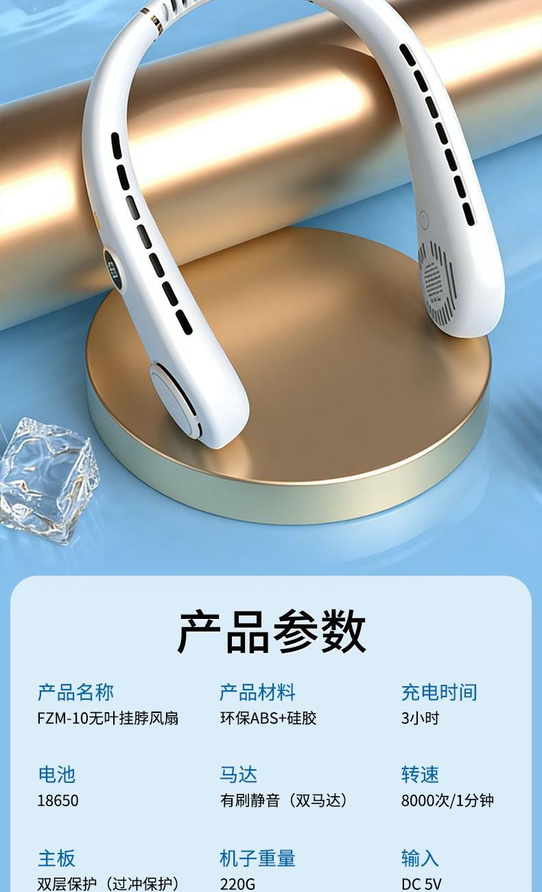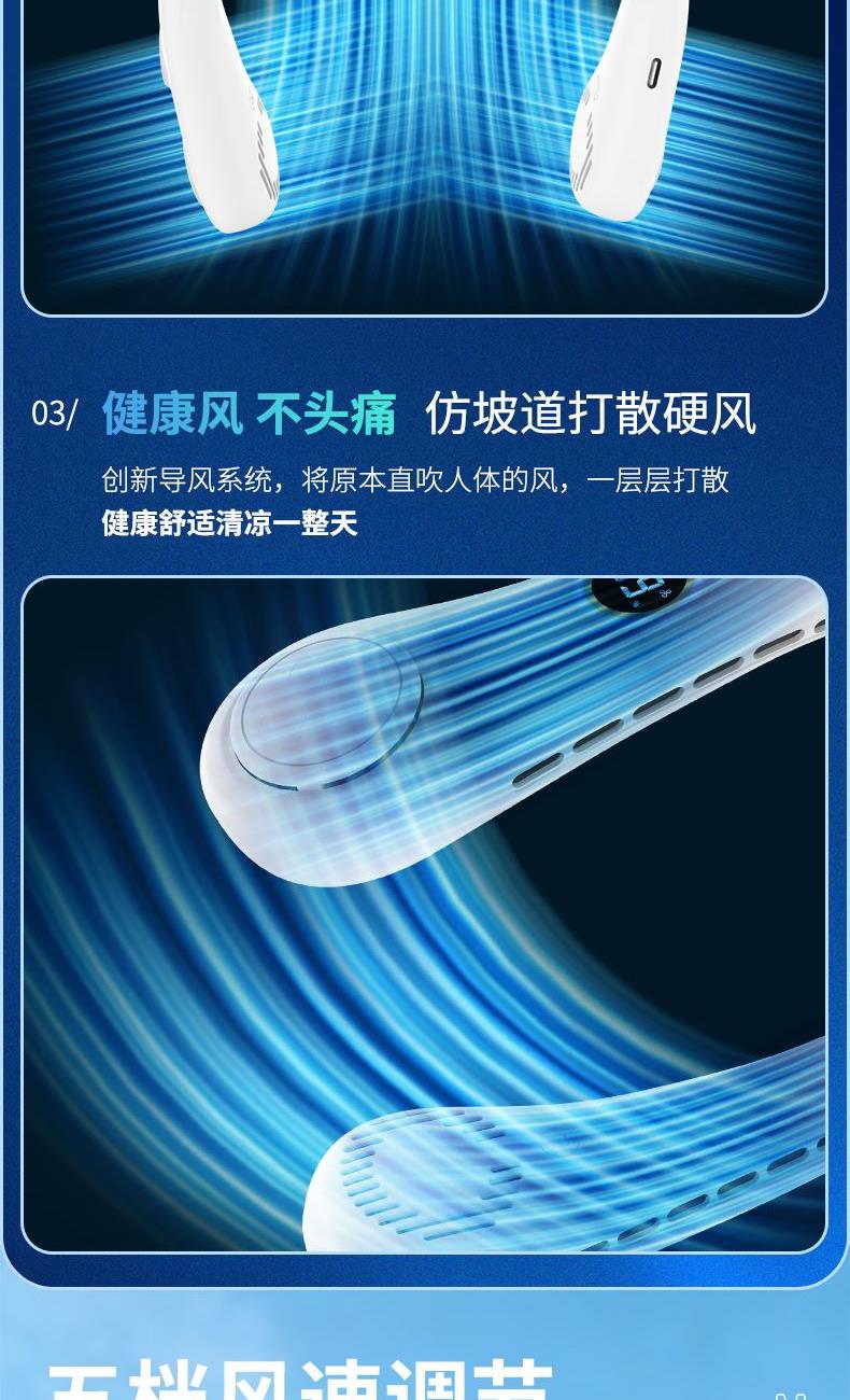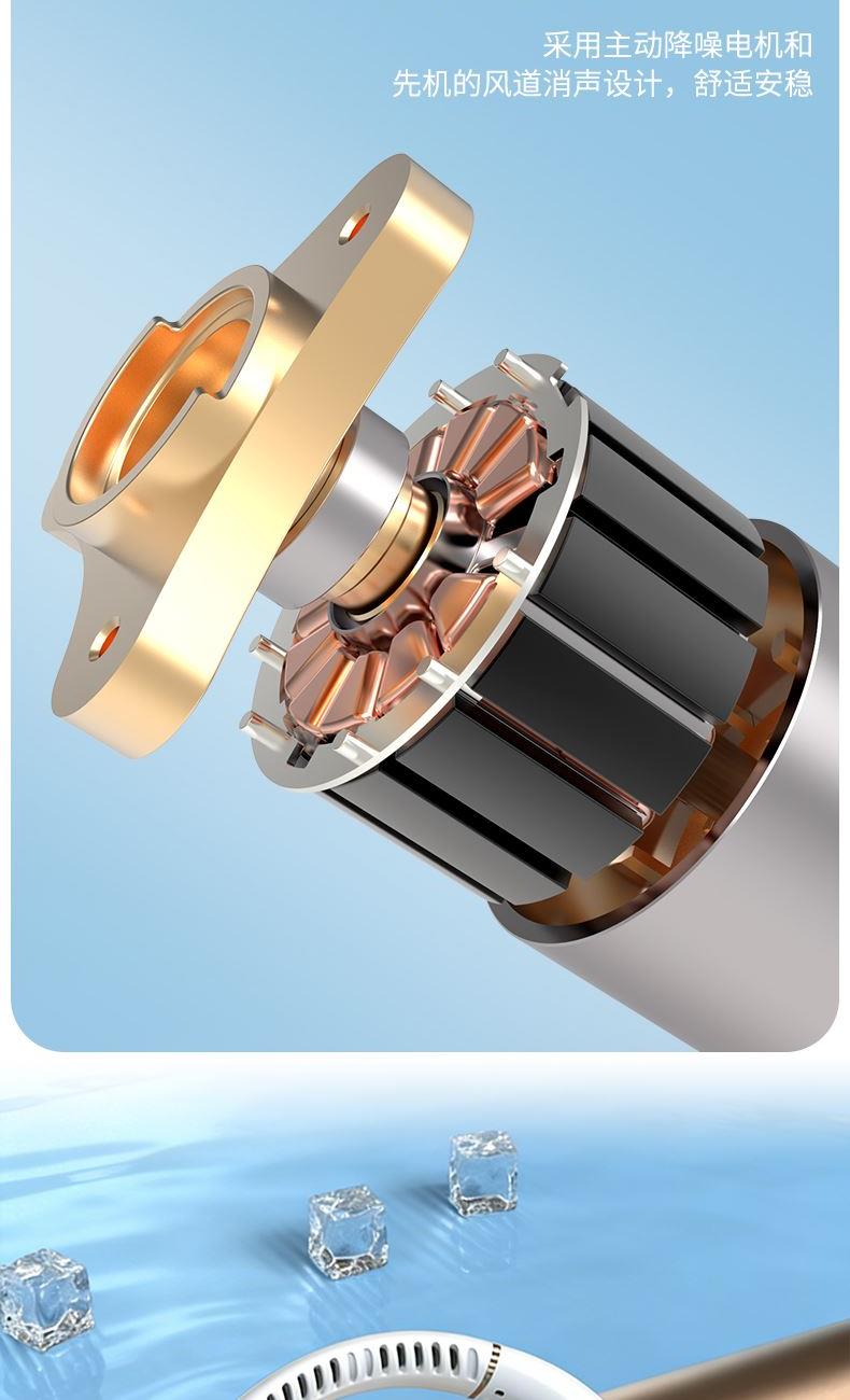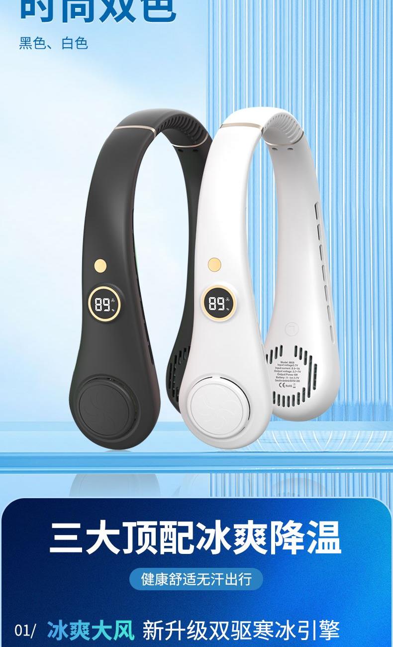 产品材料:环保ABS+硅胶 马达:有刷静音(双马达) 主板:双层保护(过充过放) 输入:DC5V 转速:8000次/1分钟 电池:18650 机子重量:220G 输出:4W 粉色深蓝色绿色 秒速降温 + 环绕送风:开机即享澎湃凉意,气流集中,环绕式清凉如随身空调 智能温控调风:实时感应环境与体表温度,自动调节风速,保持舒适体感 5 档风速:柔风 — 劲风全覆盖,办公、通勤、运动、高温场景都适配 超静音低噪:静音电机 + 消声风道,低至 25 分贝,工作休息不打扰 亲肤舒适挂脖:柔性软胶贴合颈部,可调节角度,久戴无压迫感 长续航不断电:新能源电芯,一档续航 24 小时,续航 8 小时 + 无叶设计更安全:送风均匀,不搅头发,使用更放心