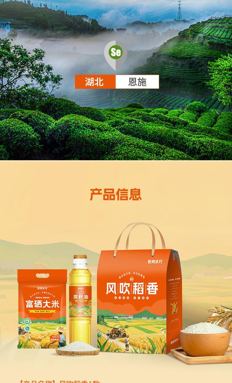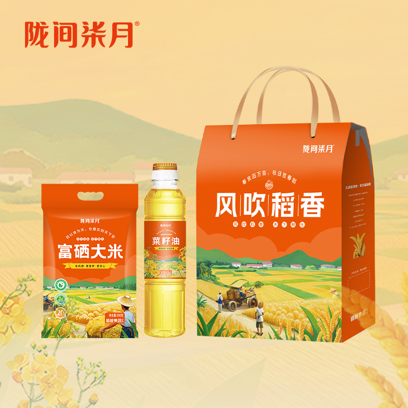 产品信息 品 名:风吹稻香A 规 格:富硒大米500g、菜籽油418ml 包 装:长25cm宽7cm高32cm 产品特色 1、富硒大米富含有机硒,每100g平均硒含量≥20ug;更易被人体利用吸收 2、菜籽油油品透亮、香味浓郁,烟点高、炒菜油烟少、低温下不易凝固等特点;菜籽油中还含有丰富的维生素E以及油酸、亚油酸、亚麻酸等 3、精美礼盒,送礼佳品。