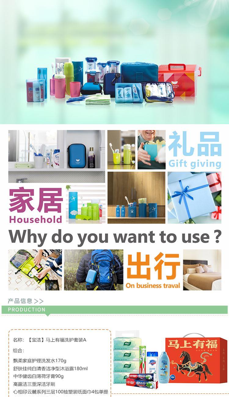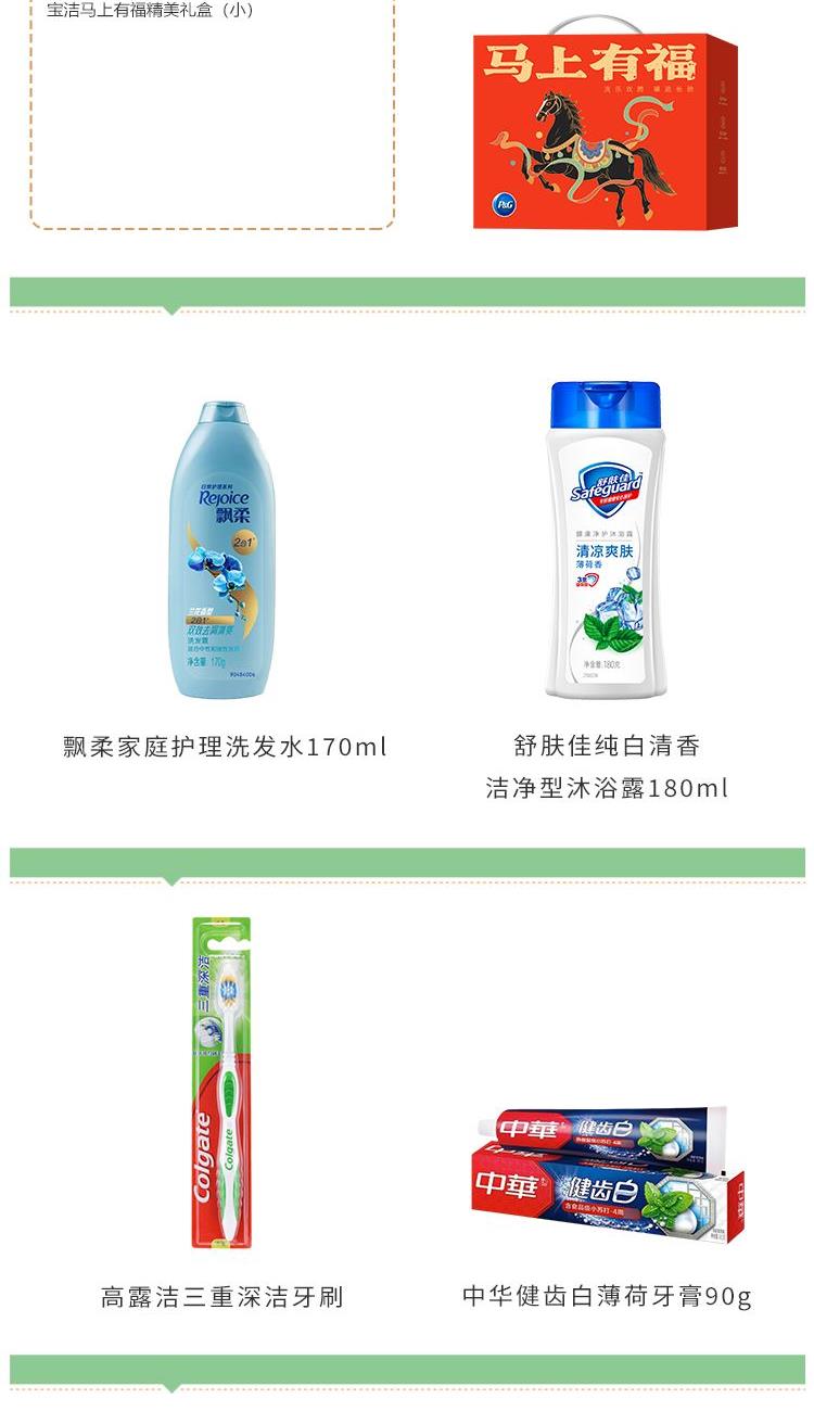 飘柔家庭护理洗发水170g 舒肤佳纯白清香洁净型沐浴露180ml 中华健齿白薄荷牙膏90g 高露洁三重深洁牙刷 心相印云麓系列三层100抽塑装纸面巾4包单提 宝洁马上有福精美礼盒(小)